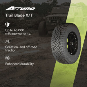 For light trucks and SUVs, the Atturo Trail Blade X/T is a great balance of road manners on the pavement and confident traction off-road. The Trail Blade X/T features an open shoulder and blocky lug tread for traction in sloppy mud, sand, snow, or loose dirt, deep grooves for water evacuation in wet weather, and wraparound lugs on the sidewall that boost lateral traction in ruts.