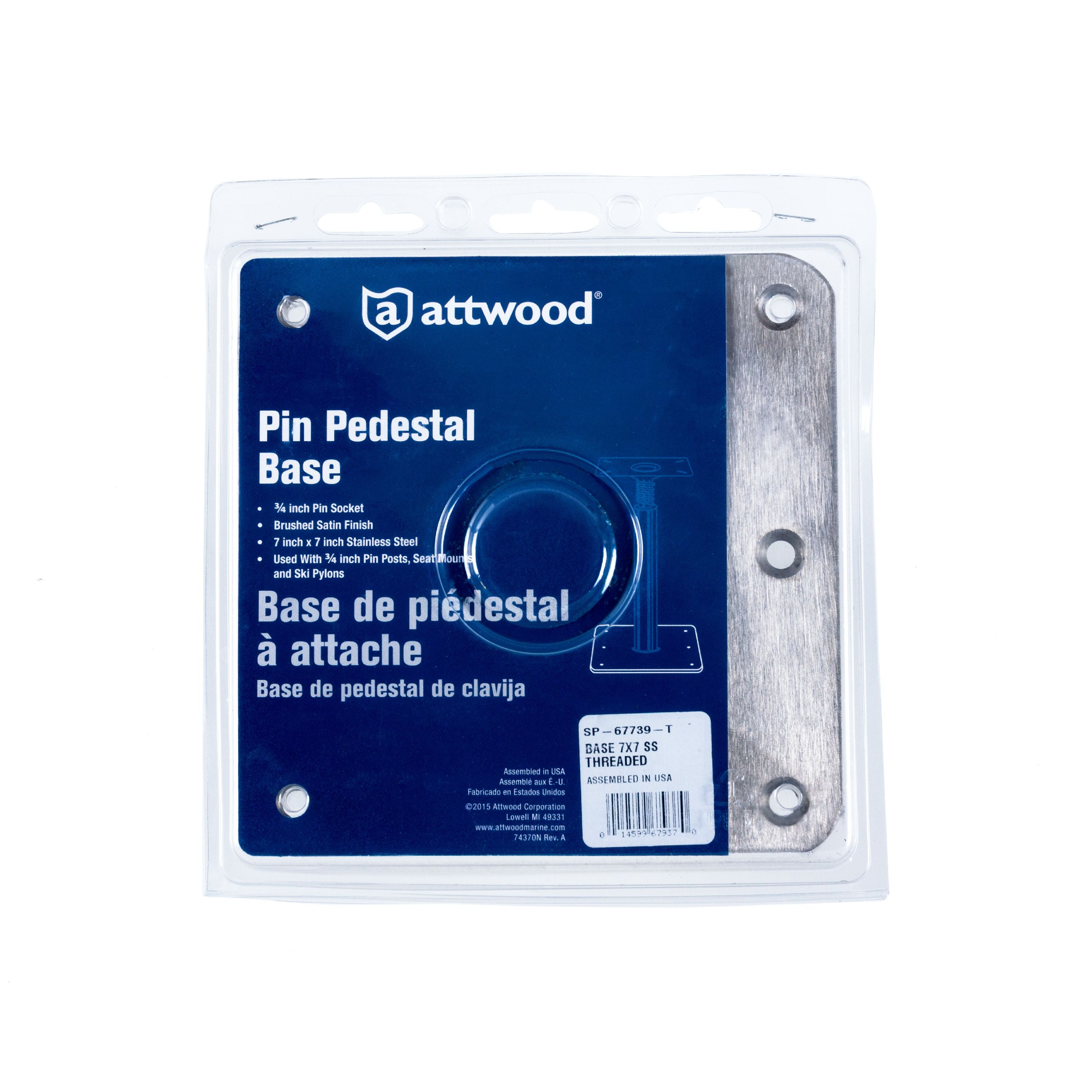 Non-threaded model designed to accommodate ¾ inch pin socket 7-inch square base requires a 2 ¾ inch diameter mounting hole The stainless steel base features a satin finish, countersunk mounting holes, steel lip tube and nylon bushing Engineered to exceed American Boat and Yacht Council standards Type B rating, not for use as a helm/driver seat or for speeds in excess of 5 mph