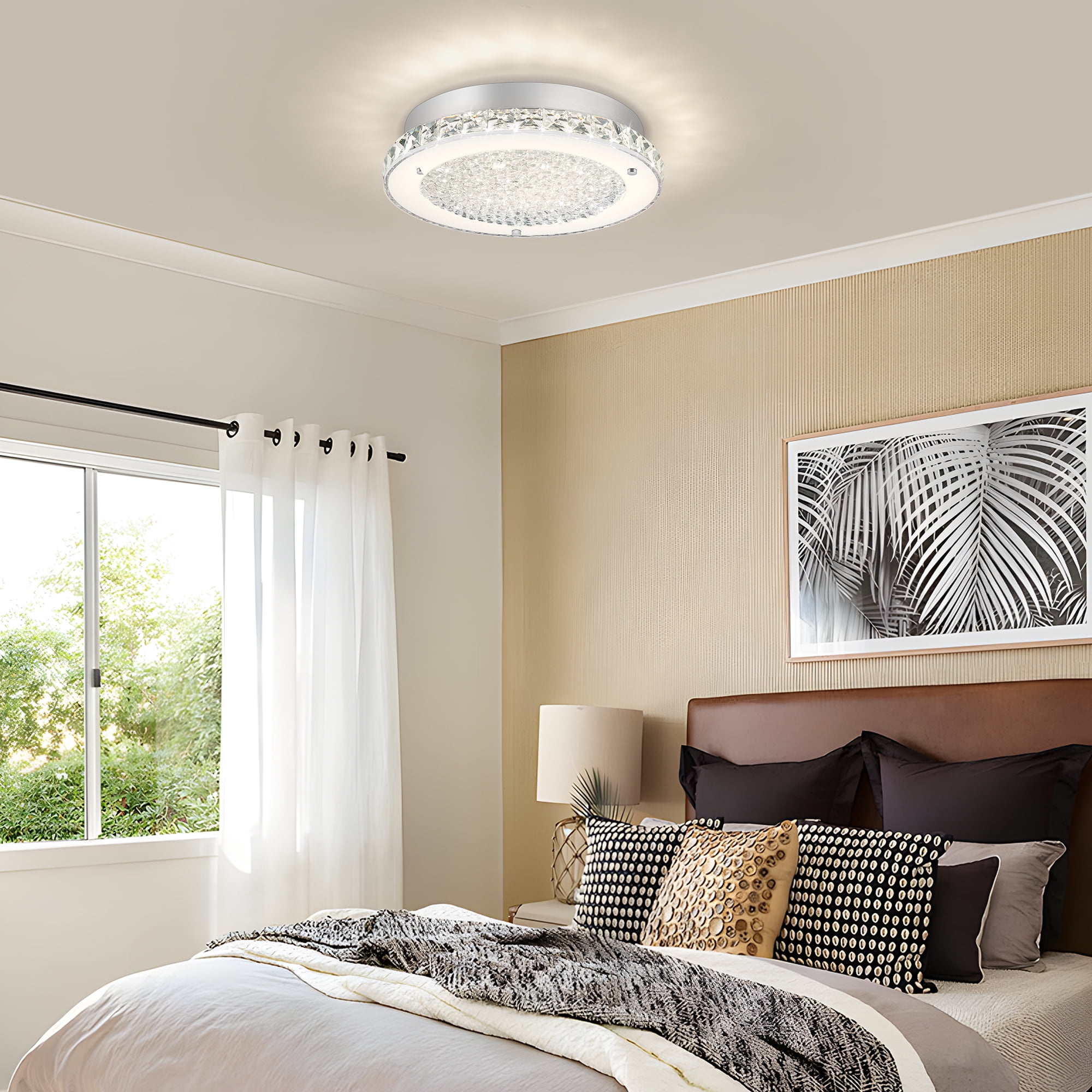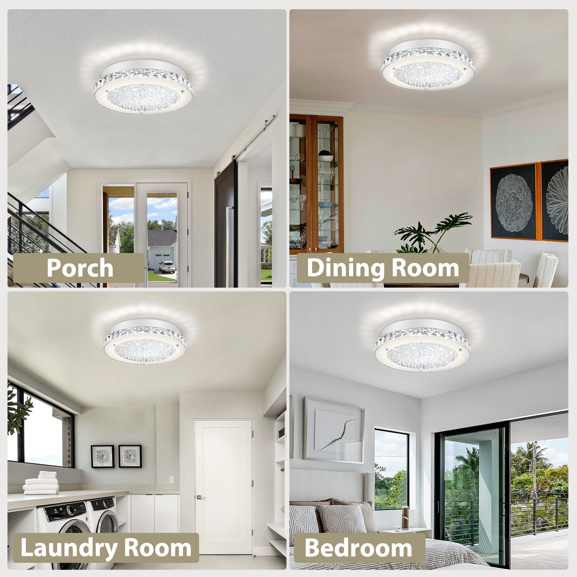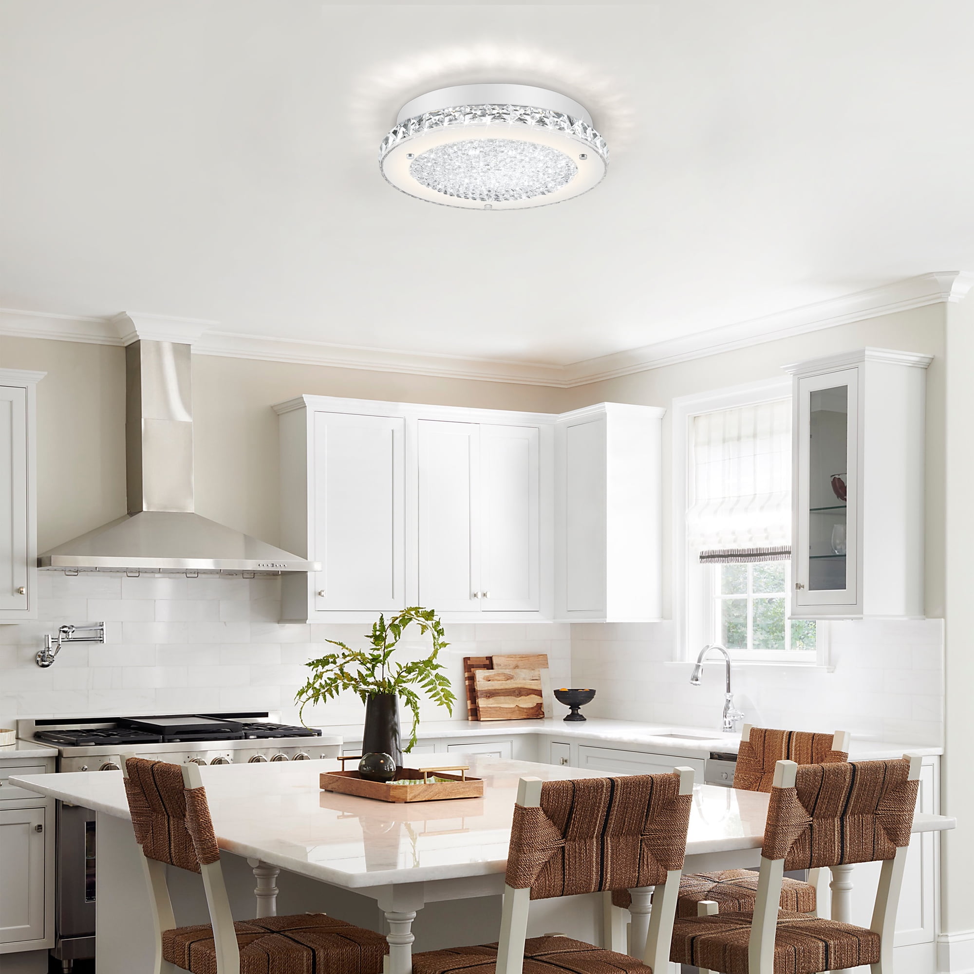 Features ✔Crystal ceiling light built in 18W dimmable LED(No Flicker) ✔C.T. 4000K warm white light simulating natural light protect your eyes ✔Ivory glass and crystal outer ring designed to refract light to the fullest ✔Shiny K9 crystal grains: Three-dimensional octagonal beads ✔Assembled dimensions:11″ length x 11″ wide X 2.16 ” high ✔Indoor crystal light to the ceiling fixture (approved wet locations) ✔Easy & Quick installation of crystal flush mount ceiling light fixture