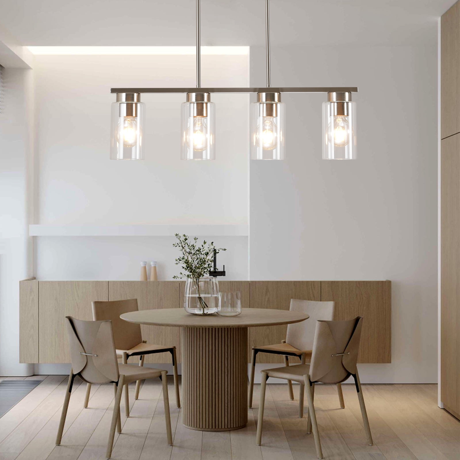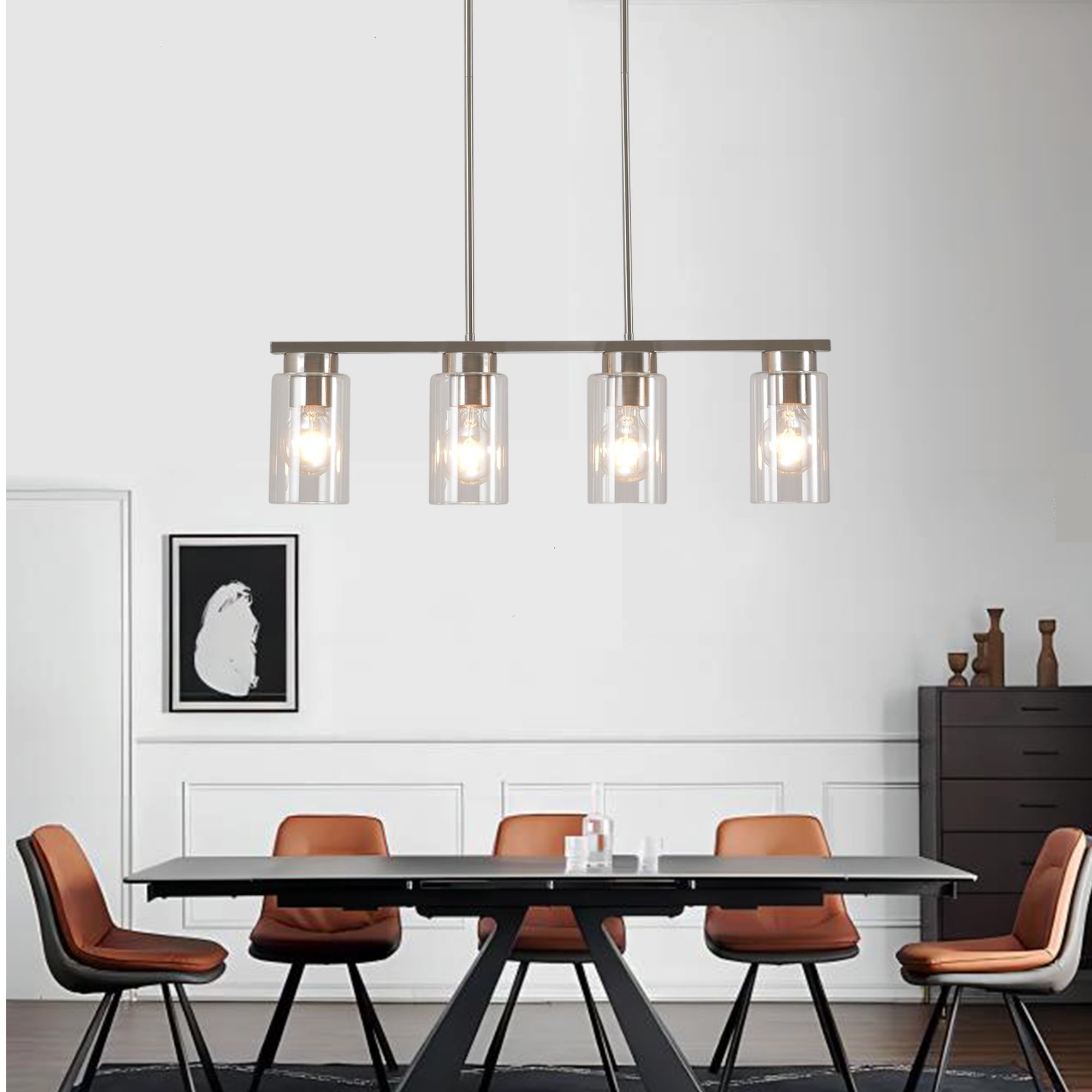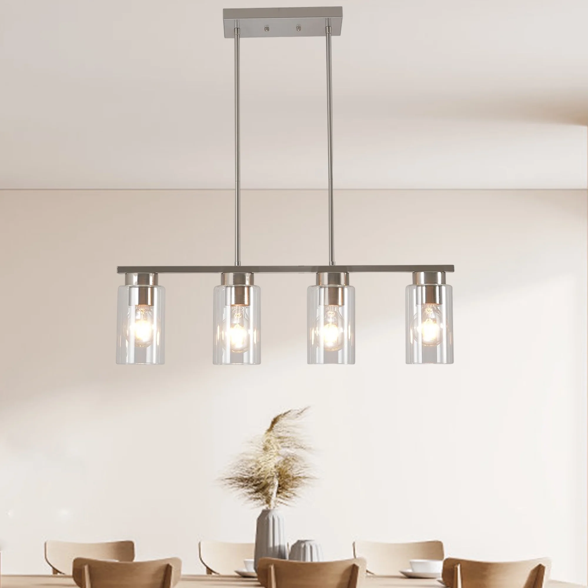 The kitchen island light fixtures with 4 glass cylinder shade and polished chrome finish, the glass shades of the linear pendant light brush nickel create a wonderful glow, bring an elegant and concise atmosphere to your home. It is definitely the best choice for your home lighting and decoration.This 4-Light island pendant light allows you to freely adjust the length of the rod to suit different ceiling heights according to your needs Specification: Material:Metal and Glass Color:Brushed Nickel Wattage:Max 60W Light Source:E26 Max 60W (Bulb Not Include) Light Bulb Type:CFL/LED/INCANDESCENT/HALOGEN (Compatible with dimmable bulb) Bulb base:Compatible with any type of E26 bulb Light Bulb Included:NO Number Of Lights:4 Power Source:Corded-electric Voltage:110-120 Volts Application environment:Dry locations Application Area:Kitchen; dining room; bedroom; living room; hallway; basement; farmhouse;coffee bar; restaurant; beauty salon; basement;study room; loft;library; powder room; dressing room Package contents: ✔Light fixture *1 ✔Lampshade *4 ✔Mounting accessories*1 set