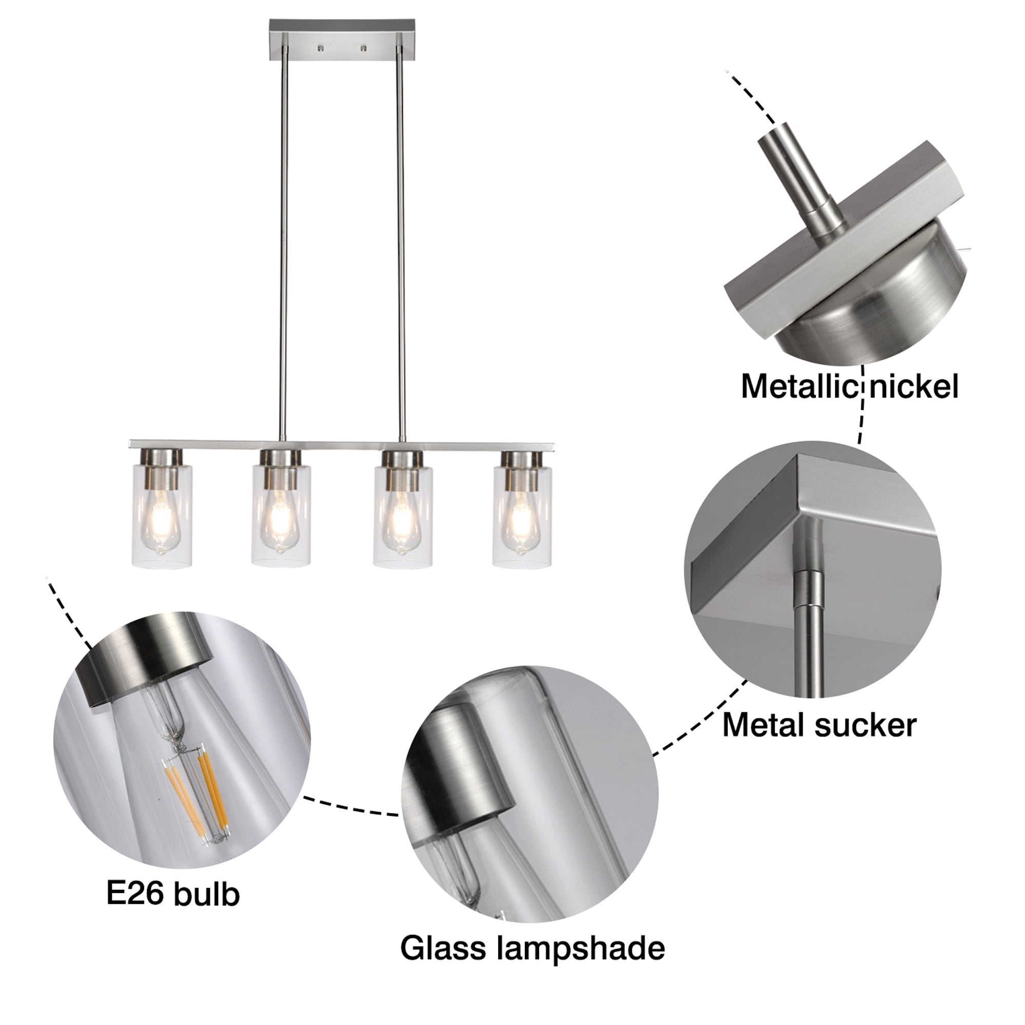 Features ✔Various E26 base bulbs compatible and dimmable bulb ✔E26 X 4 US standard base(Bulb No Include),60 watt max ✔Height adjustable: three heights available (12.99″/25.98″/38.97″) ✔Assembled dimensions:27.76″wide x 47.72″ high ✔4 Light pendant light fixture with clear glass lampshades ✔Easy & Quick installation of island pendant light for kitchen ✔Nickle Glass Chandeliers suitable for flat ceiling