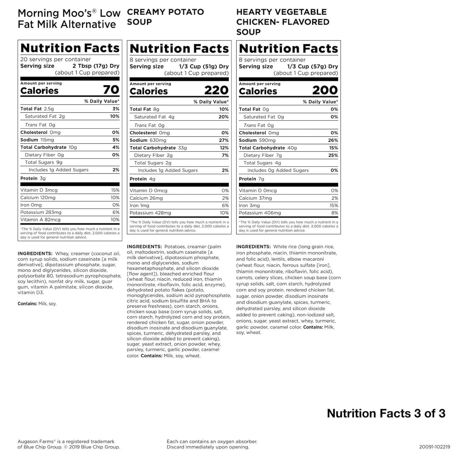 - Nutritionally balanced with entrees, soups, breakfasts, dry powdered milk, and fruit snack