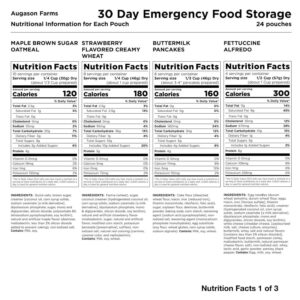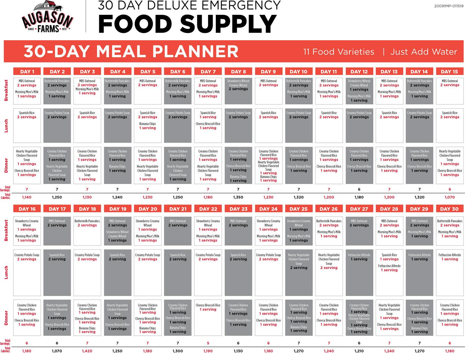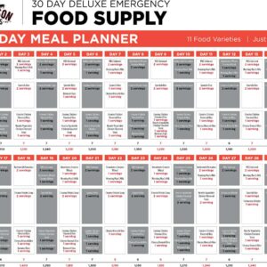 Augason Farms Deluxe 30-Day Emergency Food Supply combines flavor and nutrition at an affordable price. You ll enjoy hearty and flavor-packed meals such as Cheesy Broccoli Rice, Hearty Vegetable Chicken-Flavored Soup, Maple Brown Sugar Oatmeal, and Buttermilk Pancakes to name a few. The food supply includes 11 varieties of mouthwatering and easy-to-prepare foods totaling 37,080 calories at an average of 1,236 calories per day. The survival food is secured in a watertight, easily transportable 5-gallon pail that s perfect for storing at home and workplace for unexpected emergencies. This survival kit also includes a 30-Day Meal Planner, something you won t find in any other emergency food kit. Augason Farms takes the guesswork out of daily meal preparation with their unique Meal Planner. In an emergency situation, it is critical that food is carefully prepared to ensure you have a balanced number of calories each day for an extended period of time. It s safe to say this meal planner could be a lifesaver. FOOD SUPPLY INCLUDES: Morning Moo s Lowfat Milk Alternative (1 pouch/20 servings), Maple Brown Sugar Oatmeal (3 pouches/10 serving each), Strawberry-Flavored Creamy Wheat (1 pouch/8 servings), Buttermilk Pancakes (3 pouches, 6 servings each), Hearty Vegetable Chicken-Flavored Soup (2 pouches/8 servings each), Cheesy Broccoli Rice (3 pouches/8 servings each), Creamy Potato Soup (1 pouch/8 servings), Spanish Rice (3 pouches/8 servings each), Fettuccine Alfredo (1 pouch/4 servings), Creamy Chicken-Flavored Rice (3 pouches/8 servings each), and Banana Chips (1 pouch/8 servings). Based on storage conditions, Augason Farm s freeze-dried emergency food has an up to 30-year shelf life.