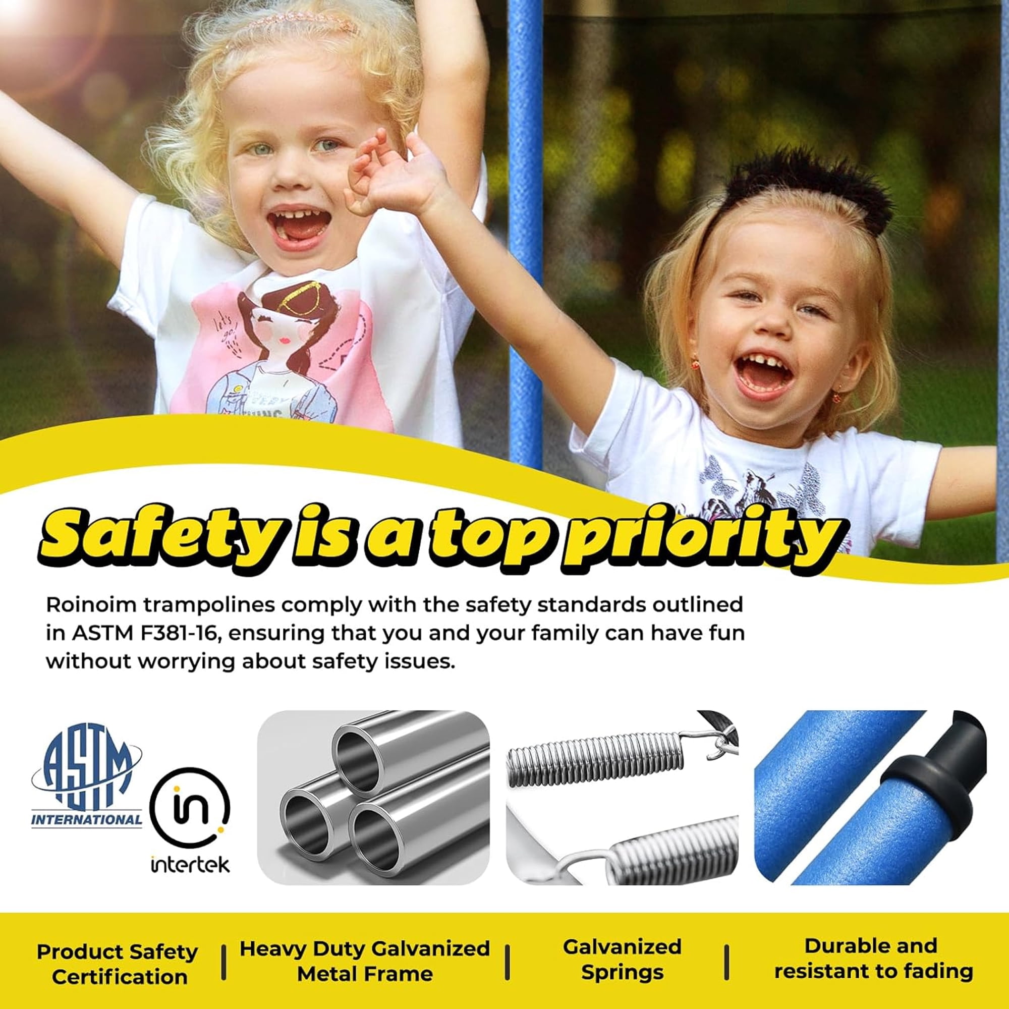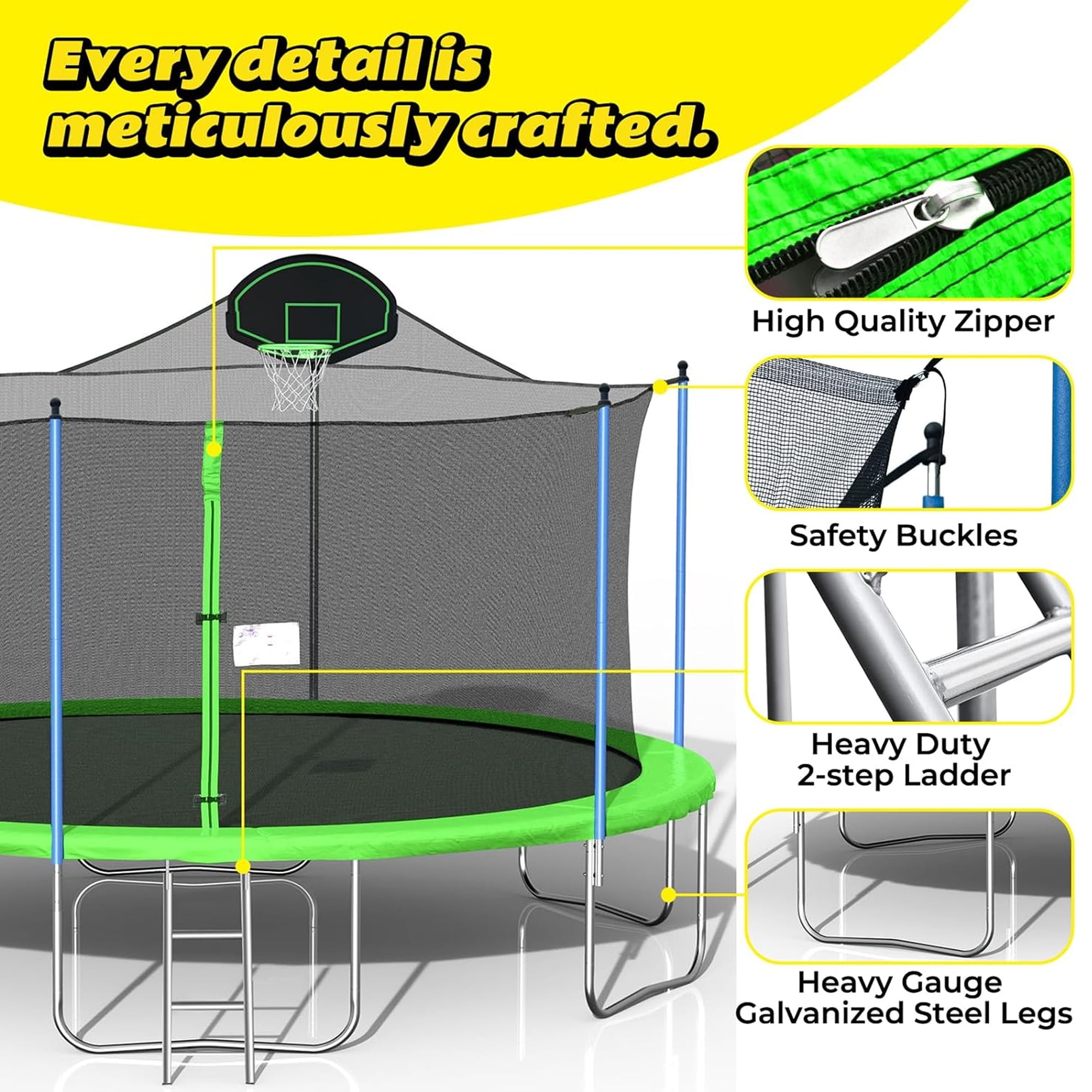 Features 3 IN 1 TRAMPOLINE – This 12FT trampoline with enclosures for kids adults is uniquely designed with 2 swings, a slide and basketball hoop. Game changer for kids to have multiple entertainment with this special trampoline. PREMIUM BOUNCING EXPERIENCE – Aukfa outdoor backyard trampoline with slide provides a high-quality bounce thanks to the 72 galvanized springs evenly distributed around the mat, paired with a high-strength mat that can handle constant flexing. This design offers both durability and a gentle landing for your feet. DURABLE AND STABLE CONSTRUCTION – The trampoline’s heavy gauge galvanized steel frame forms 6 W-shaped legs, providing a stable base for the jumping zone. The joins are press-fitted onto each frame piece to reduce noise and movement, enhancing the product’s longevity and reducing wear and tear. TRAMPOLINES WITH BASKETBALL HOOP – Jumping becomes even more entertaining with an included basketball hoop, keeping your kids busy and active all day long. There is a triangle net around the backboard to keep the ball from flying off the trampoline. With our trampoline, it’s not just about jumping—it’s also about scoring! ASSEMBLE EASILY – All accessories included. We recommend two or more people for assembly, please read the user manual carefully, we provide clear assembly sequences to make the process easier and reduce construction time. Please feel free to contact our customer service if you have any questions. Specifications Type: Backyard; Above Ground; Kids/Adults Trampoline with Slide and Swing Frame Material: Heavy Gauge Galvanized Steel, Plastic Frame Size: 12 Feet Number of Packages: 2 Jump Surface Material: PVC; Mesh Number of Entrances: 1 Zipper Closure: YES Number of Legs: 6 Springs Count: 72 pcs Slide: Yes Basketball Hoop: Yes Safety Net Enclosure Fasten Location: Outer Enclosure Padded Safety Poles: YES Anchor Kit Included: YES Safety Pad Included: YES Pad Material: Foam User Manual: AK_AK-SR01M15012-G0_PUM_VY-031224