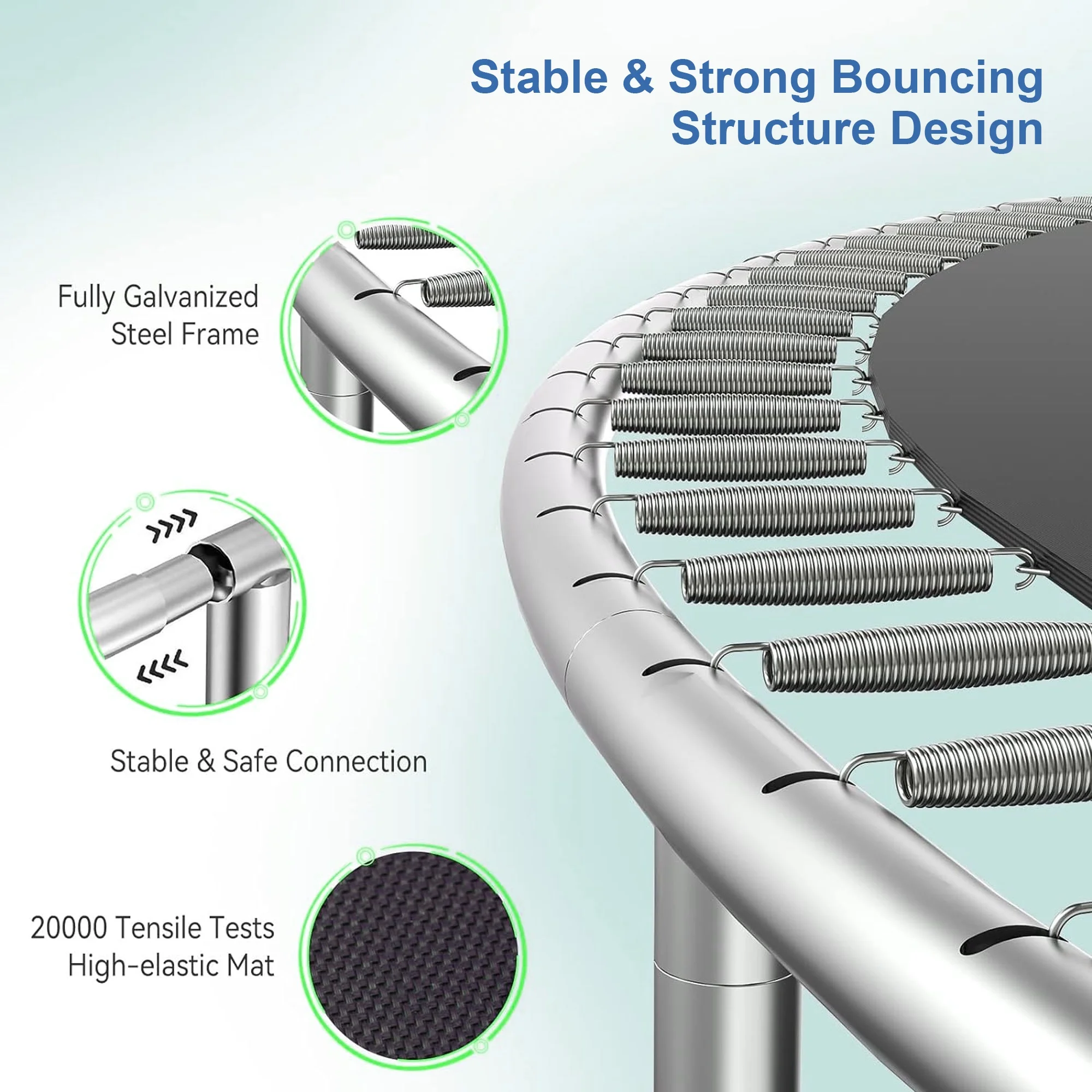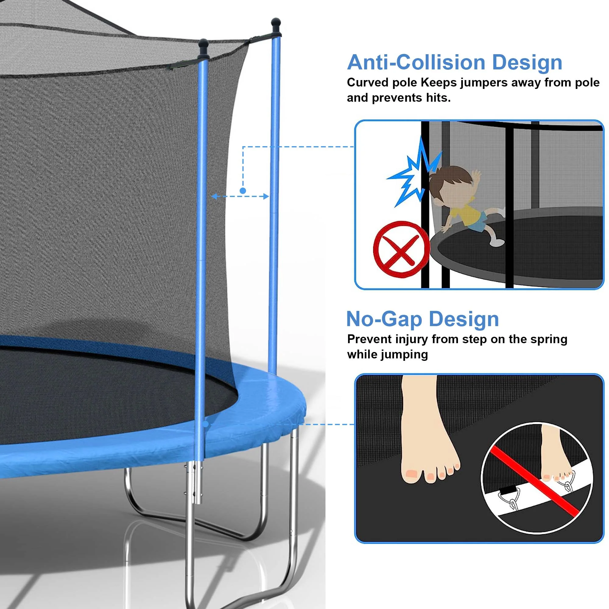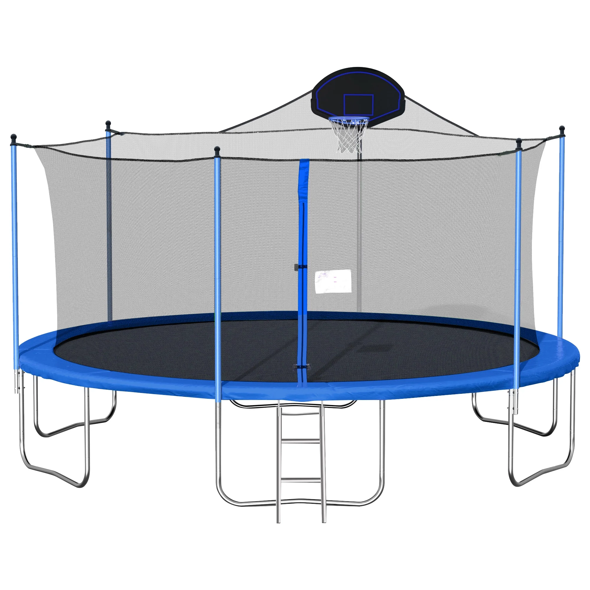 The Aukfa AK-ST01-006 16FT trampoline with enclosures offers an exceptional level of safety with its Safely System. The 360-degree safety net, securely attached to the jumping mat, effectively reduces the risk of limbs falling through, making it an ideal choice for kids, adults. Additionally, it features a backboard, allowing you to play basketball on it. For an unparalleled bouncing experience, this outdoor trampoline boasts a high-strength mat woven together to withstand constant flexing. Its durable construction ensures a comfortable surface for jumping. There are 180 galvanized springs evenly stretched around the mat. This provides users with a smooth and highly responsive bounce, enhancing the overall bouncing experience. The heavy gauge galvanized steel frame and 6 W-shaped legs provide a stable base for the jumping zone. It comes equipped with a rust-resistant steel 2-step ladder, allowing users to easily and safely access the trampoline. The full enclosure features a zipper door for effortless entry and added peace of mind.