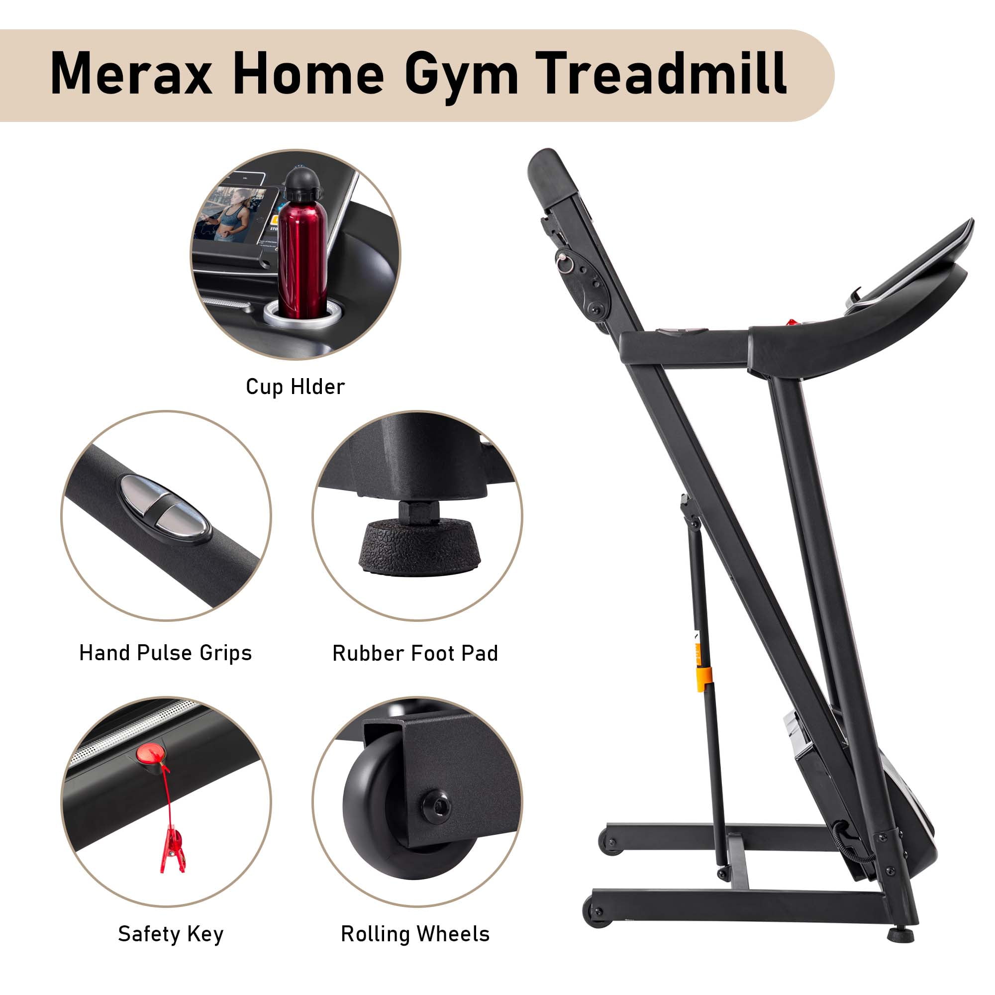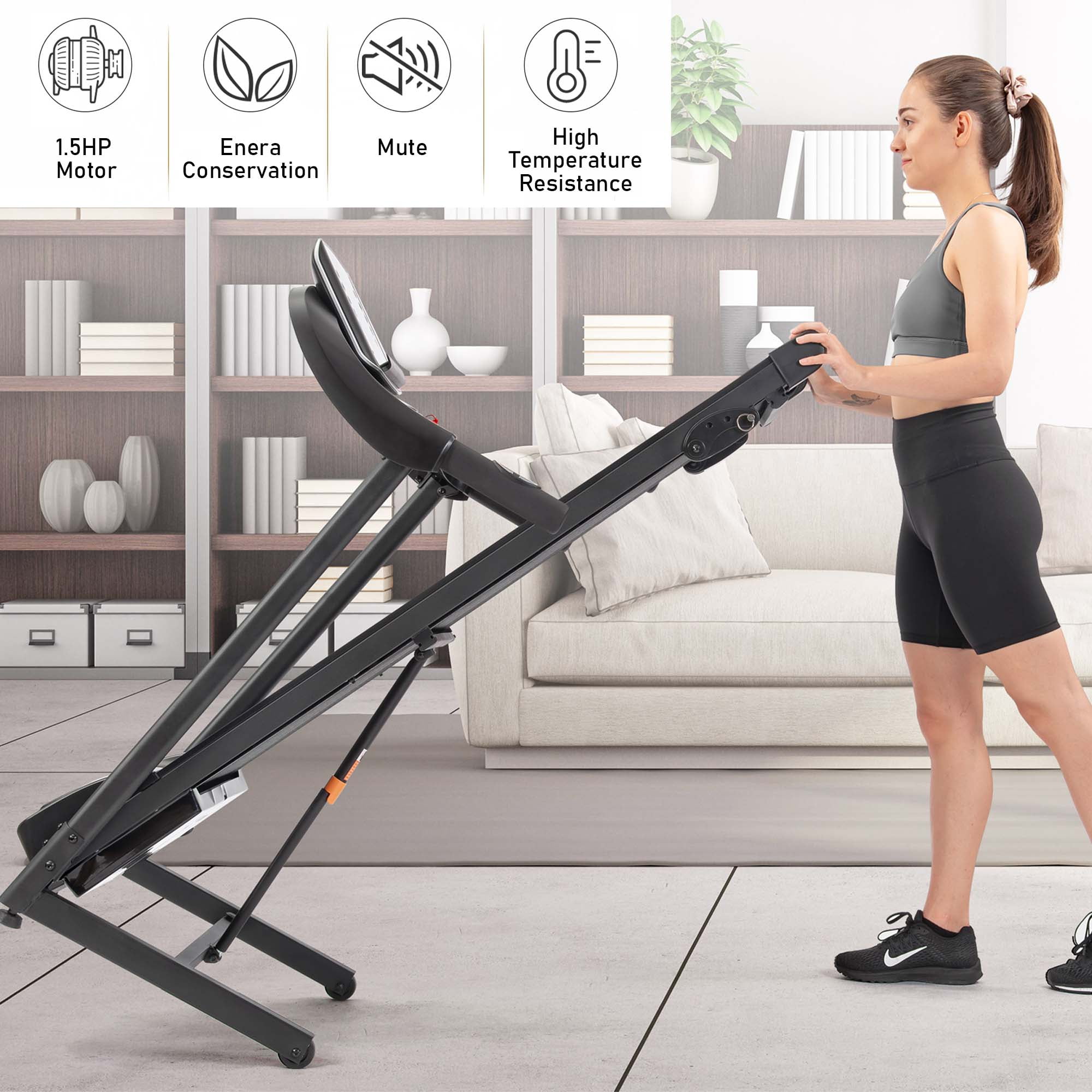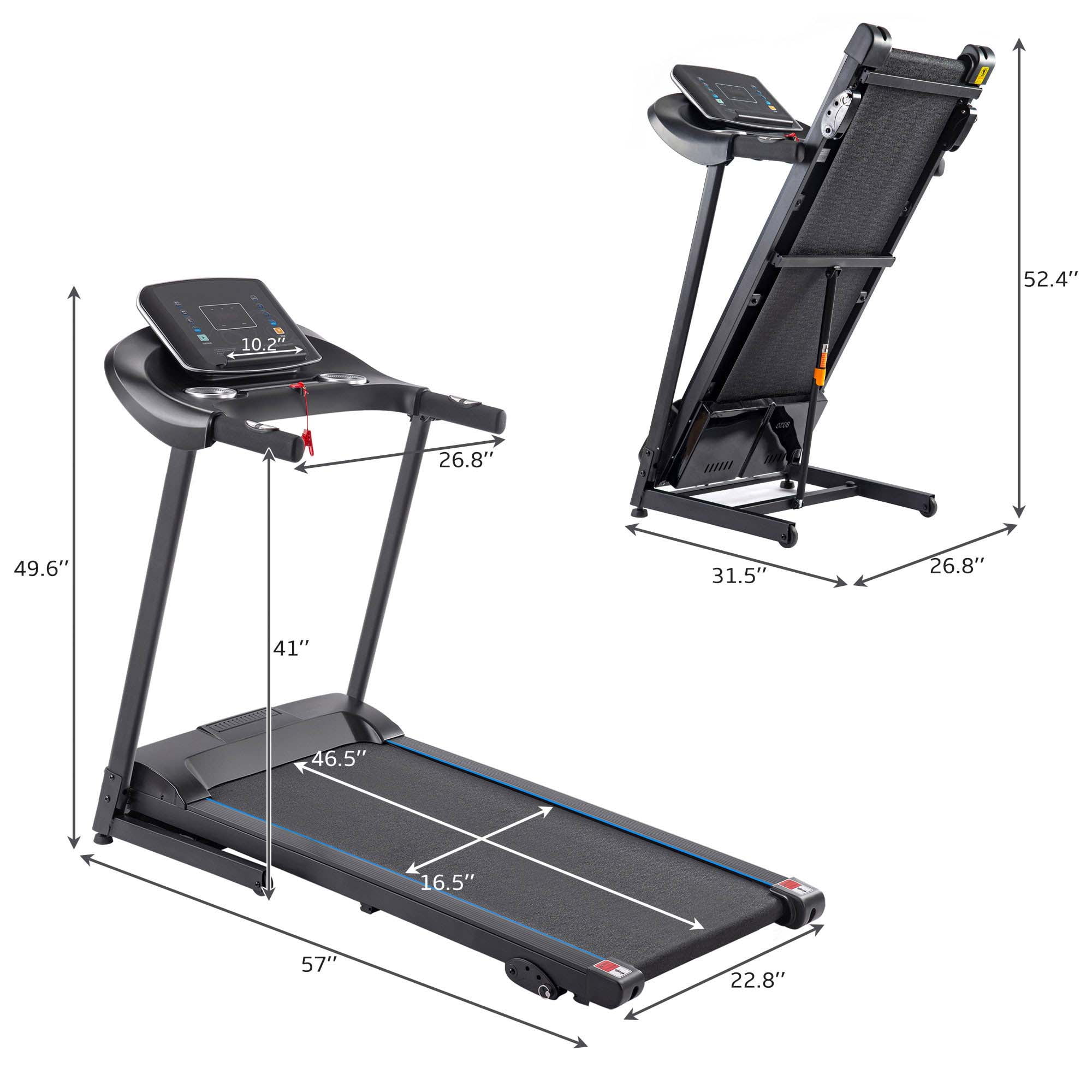 Features TREADMILL FOR HOME GYM WORKOUT – Concerned with home fitness, this folding treadmill with incline is perfect for walking, jogging and running at home/office/apartment. Your choice for a good workout. Lightweight and foldable design for easy to fold, move and store, saving your space. Deeply loved and trusted by thousands of families. 2.5HP POWERFUL AND ULTRA-QUIET MOTOR – Experience a workout like no other with our treadmill’s optimized 2.5HP motor, ensuring high responsiveness and smooth running. Whether you prefer walking, jogging, or running, this versatile machine accommodates your needs with adjustable speeds ranging from 0.5 to 10 MPH. This folding running treadmill supports up to 300 lbs user capacity. PERSONALIZED TRAINING PROGRAMS – Maximize your progress and push your limits with 12 pre-set programs designed to expedite your fitness journey. Customize your workouts further with three manual incline settings, targeting specific muscle groups for optimal results. NON-SLIP AND SHOCK-ABSORBING RUNNING BELT – The 5-layer non-slip running belt with a 16.5” x 46.5” large running area, provides effective cushioning for your knees, joints, muscles, back, and ankles. Toughness deck cushioning absorbs shock for premium comfort with every step. With the non-slip feature for maximum safety. COMPREHENSIVE WORKOUT TRACKING – Monitor your workout progress effortlessly with the user-friendly LCD display and built-in hand-grip sensors. Stay informed about vital statistics such as time, distance, speed, heart rate, and calories burned. Immerse yourself further by enjoying entertainment or educational tools with the audio speakers and device deck. SPECIFICATIONS Color: Black Frame Material: Steel Panel Material: Plastic Speed: 0.5-10 MPH Motor: 2.5 HP Training Programs: 12 Programs Foldable: Yes Phone/Pad Holder: Yes Shock Absorption: Double shock absorption system with 5 layers of the anti-slip belt, 8 silicone shock absorbers. Multimedia: Audio auxiliary port with dual speakers Transportation Rollers: Yes Incline: 3-Level Manual Incline Display: Time, speed, distance, calories, pulse rate Heart Rate Pulse: Heart rate sensors on handrails Running Area/Tread Belt: 45.3″ x 16.5″ Assembled Size: 57″L x 26.8″W x 49.6″H Folded Size: 26.8″L x 31.5″W x 52.4″H Max. User Weight: 300 LBS Product Weight: 98 LBS Package Dimensions: 60″ x 30″ x 11″ Package Weight: 108 LBS Power Supply: 110V Assembly: Assembly required Warranty: 1-Year Limited Warranty PACKAGE INFORMATION 1 x Treadmill 2 x L-Shaped Wrench 1 x Safety Key 1 x Phone Holder 1 x User Manual: AK_AK-SF02M09015-K0_PUM_VY-072023