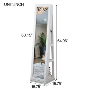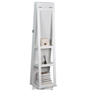 Aukfa AK-DJ01-004 jewelry cabinet is the perfect companion for any woman with a rich collection of jewelry. This 360 degree rotating jewelry cabinet keeps all your jewelry off drawers and safes and stores them in one place. With its ultra-large storage capacity including 22 necklace hooks, 2 cubes, 4 lined shelves and a bracelet rod, you can put all your collections in the cabinet. And the lockable design helps keep your jewelry secure. The full length mirror offers you a head-to-toe view of your outfit. With 360 degree rotating base, you can do some makeup with easy access to your jewelry and cosmetics. Made of durable MDF, this free standing jewelry armoire ensures long term use. This mirrored jewelry armoire will add a sophisticated look to your room.