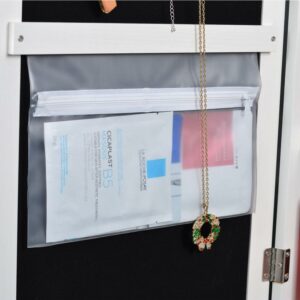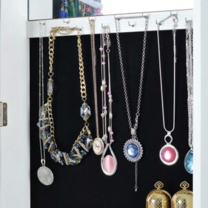 – AMPLE STORAGE – includes 22 necklace hooks, 2 cubes, 4 lined shelves and a bracelet rod, and plenty of room for rings and earrings.it can hold on the door or wall.