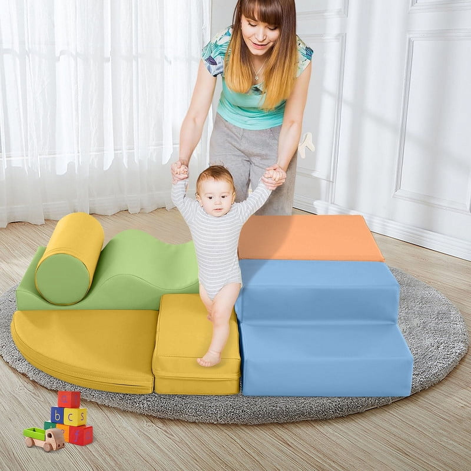 Features ULTIMATE TODDLER PLAY GYM SET – This crawling toy set consists of a staircase, a square mat, a rectangular mat, a fan-shaped mat, and a cylinder that can be embedded, and a wavy miniature obstacle climbing mat. This set features full play and exercise options, so kids can rearrange and set them up freely. ACTIVITY PLAYSET – As an important part of the perfect indoor children’s playground, your toddlers can use this climbing toy set to move, lift, carry, stack, slide and more, fully activating their immature bodies and allowing children to freely release Their energetic nature. SOFT AND SAFE – This kids crawling toy set is made up of high-quality EPE foam lining and a soft, skin-friendly surface, giving kids a thoughtful set of toys that can stay with them all day long. This climbing toy set is specially designed for toddlers to count on for comfort and safety. Low-emission, toddler-friendly materials by formaldehyde-free and smell-free. PLAYFULLY PROMOTE DEVELOPMENT & MOBILITY – Indoor toddler climbing blocks with variety of shapes and colors offers kids loads of entertainment, stimulate their imagination, creativity, coordination, and color recognition and strengthen the large muscle groups in the arms, legs, and core. HASSLE-FREE MAINTENANCE -The surface of high-quality materials can be easily scrubbed and maintained by wiping with a damp cloth, ensuring children’s play equipment is clean at all times. Please refer to the product size pictures for overall dimension. Specifications Product Type: Climber Material: Foam; PU Leather Durability: Scratch Resistant; Weather Resistant Age Group: Toddler (1 – 3 years); Pre-school (3 – 5 years) Lead Free: Yes Product Care: Wipe with a mild soap-and-water solution