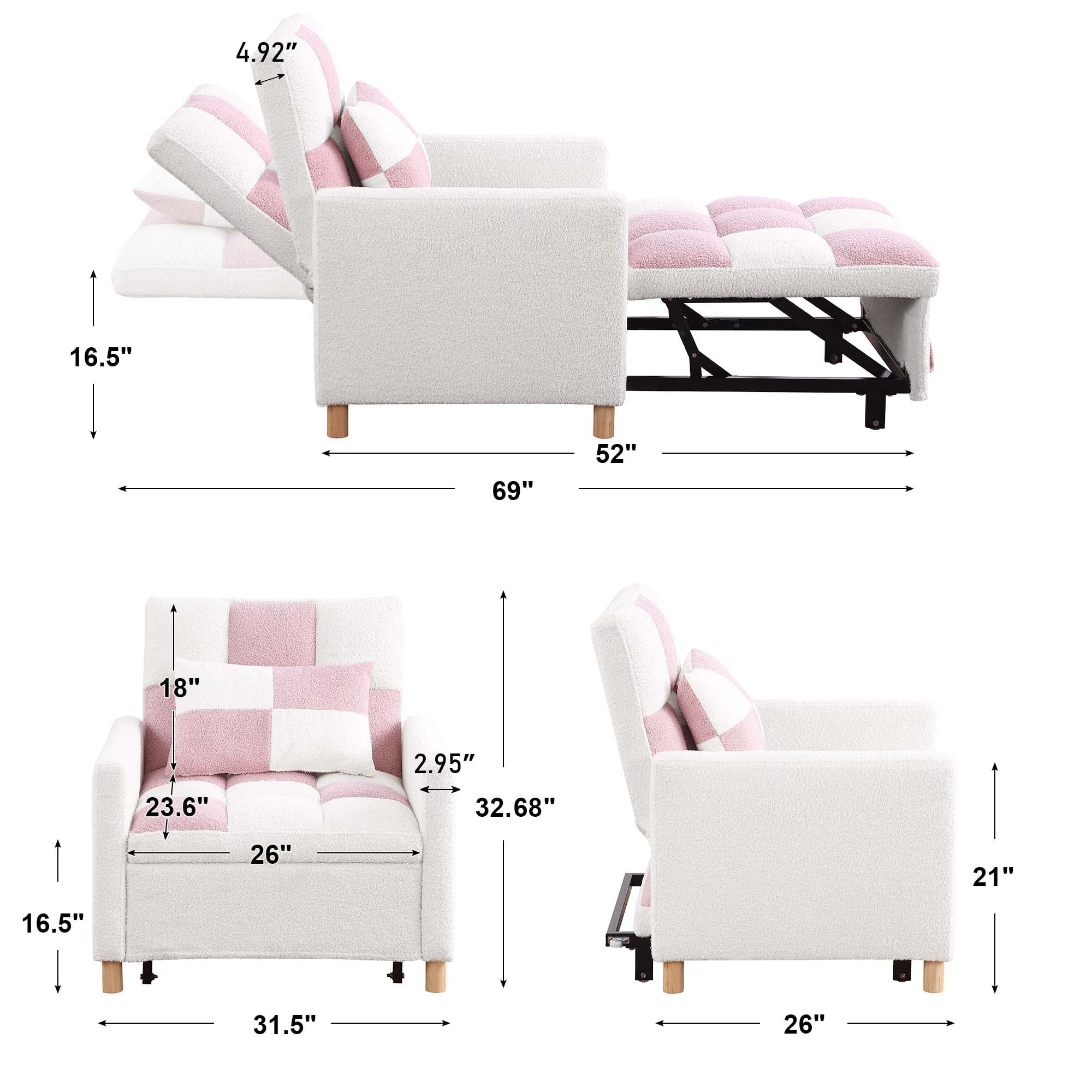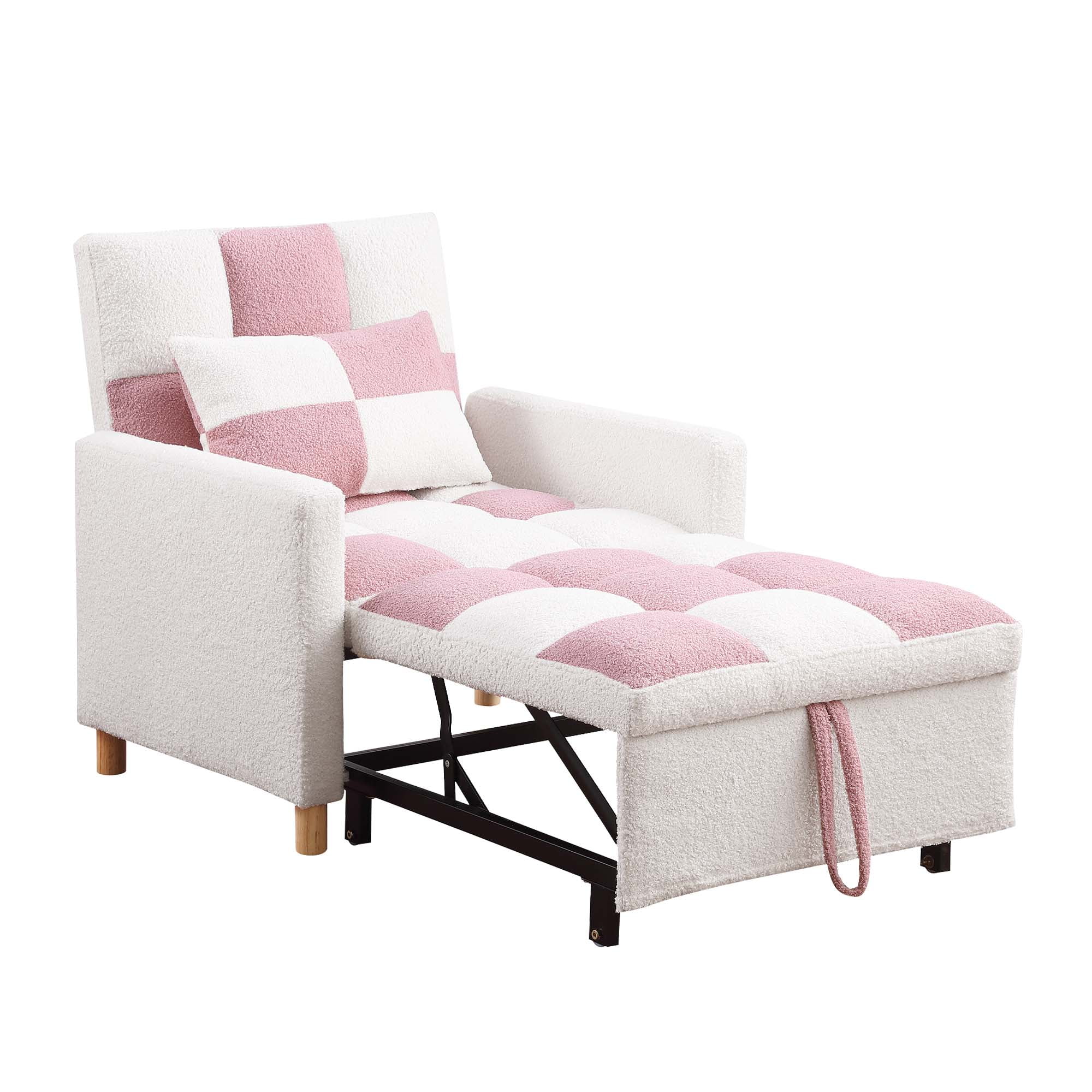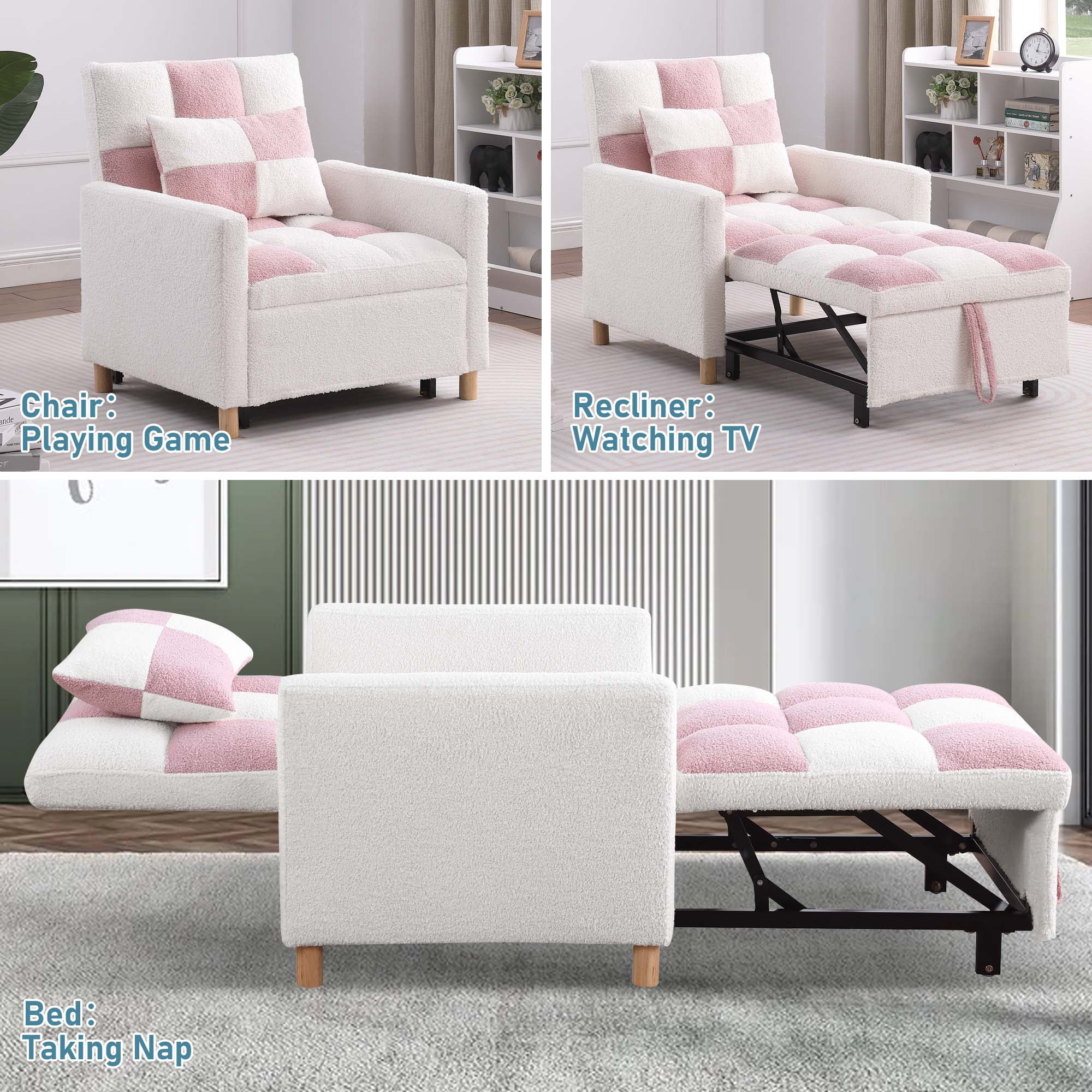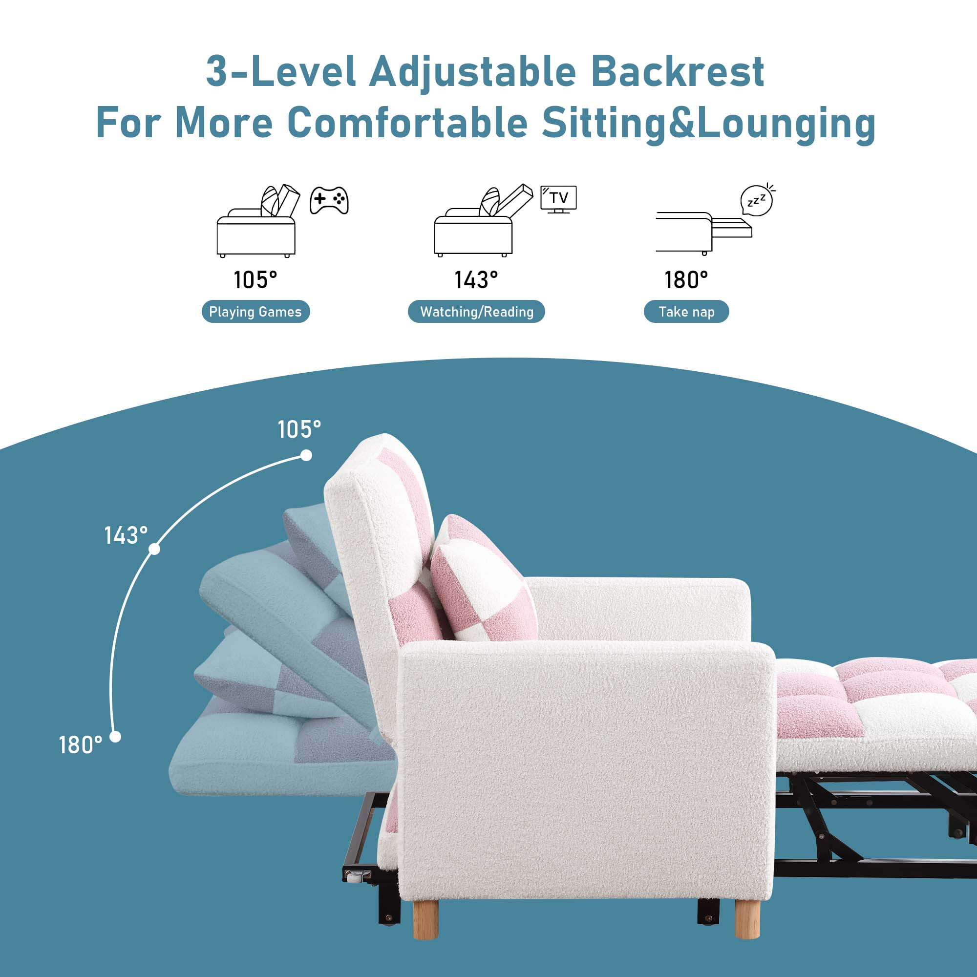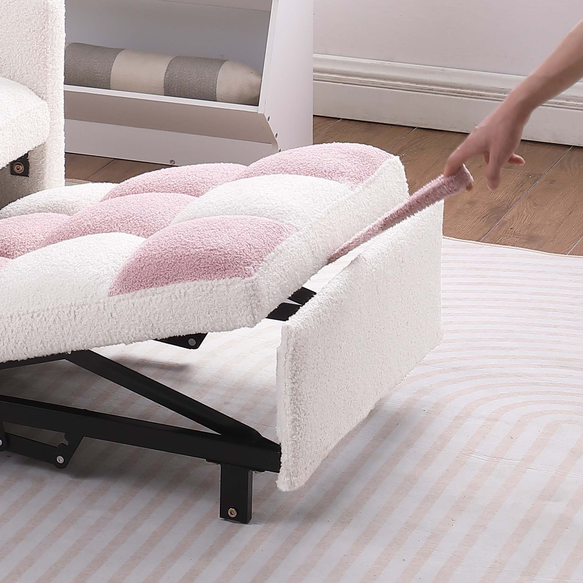 Aukfa Convertible Sleeper Chair Bed, Patchwork Pull Out Sofa Chair with Adjustable Backrest, Teddy – White/Pink
