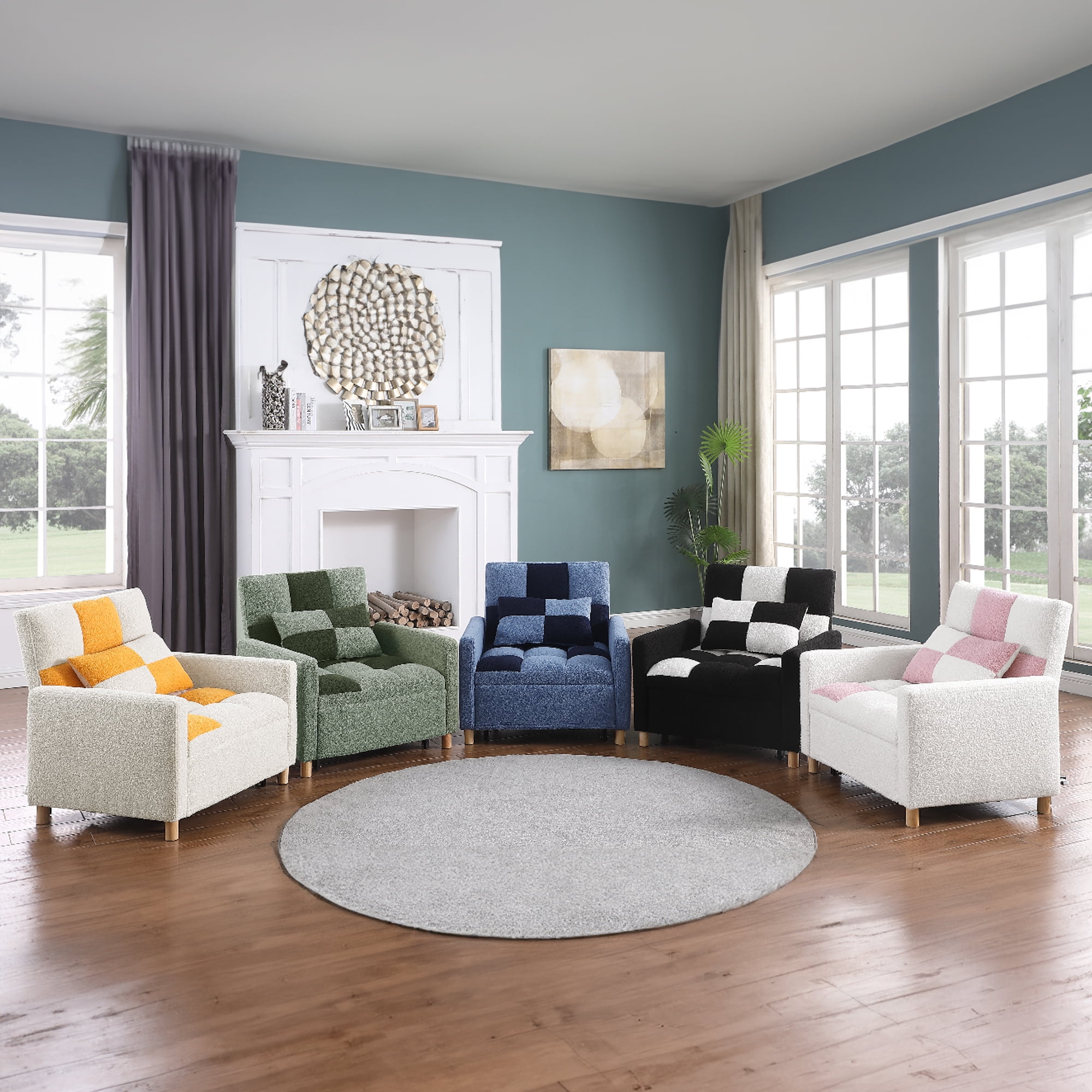 Features 3-IN-1 CONVERTIBLE DESIGN – This versatile patchwork sofa chair bed featured a creative splicing cloth surface can be easily and quickly converted into an armchair, a guest bed, as well as a recliner which is great for watching TV, reading, or taking a nap. Which is great chair beds for your family. ADJUSTABLE BACKREST – The backrest of the sofa bed is adjustable within 3 reclining angles (105°,143° and 180°) so that you can choose the perfect angle you like to accompany your work, leisure, and relaxation time all day long. You can adapt to different scenarios from different angles, whether you want to be sitting, lounging, or sleeping. More, the sleeper sofa comes with a soft pillow for sleeping or added lumbar support. CONVENIENT DESIGN – Handy strap makes it easy to pull out its leg part with moving wheels to create a bed, making comfortable sitting or lying experience for your body spine line. The serpentine springs in the seat cushion inside which makes the sofa will not deform when sitting for a long time. STURDY FRAME AND SOFT TEDDR FABRIC -The convertible chair sleeper bed is made of high-quality steel frame, ensuring best durability in daily use and weight capacity 330 lbs. Comfortable teddy fabric and high-density foam upholstery give a soft feeling and excellent support. And 4 widened wood support feet provide great stability. SUITABLE FOR ANY OCCASION – The compact folding design makes the sofa bed perfect for small rooms, like apartments, studios, offices, dorms. No need to worry about not having a place to entertain overnight guests. Sofa dimension: 31.5″ x 26″ x 32.68″(L x W x H), pull-out bed dimension: 69″ x 31.5″ x 16.5″(L x W x H). Please note that color difference may occur between different lights and monitors. Weight & Dimensions Accent Chair Size: 31.5″L x 26″W x 32.68″H Open size – sleeper: 69″L x 31.5″W x 16.5″H Back Cushion: 18”H Seat Width: 26” Seat Depth: 23.6” Seat High: 16” Minimum Door Width: 20” Product Weight: 63.93 lbs Carton Size: 46.46”L x 26.97” W x 12.6”H. 69 lbs Specifications Product Type: Convertible Futon Chair/ Multifunctional Sofa Bed Seating Capacity: 1 Frame Material: Metal, Hardwood Weight Capacity: 330 lb Sleeper Size: Twin Upholstery Material: Teddy Back Type: Tufted Back Storage Included: No Toss Pillows Included: Yes Upholstery Color: White/Pink Fill Material: Foam Seat Construction: Metal Supplier Intended and Approved Use: Residential Use Leg Material: Wood Leg Color: Natural Position Lock: Yes Cushion Construction: Foam Product Care: Wipe clean with dry cloth Assembly Required: Yes Warranty Length: One Year Package Information 1 x Sofa Chair 1 x Pillows 4 x Wheels 1 x User Manual: AK_AK-HLS0MT1001-K0_PUM_VY-090123 Notes Manual measurement has been used, there may be some reasonable error. All the pictures are taken by actual samples, slight chromatic aberration may occur due to lighting or display.