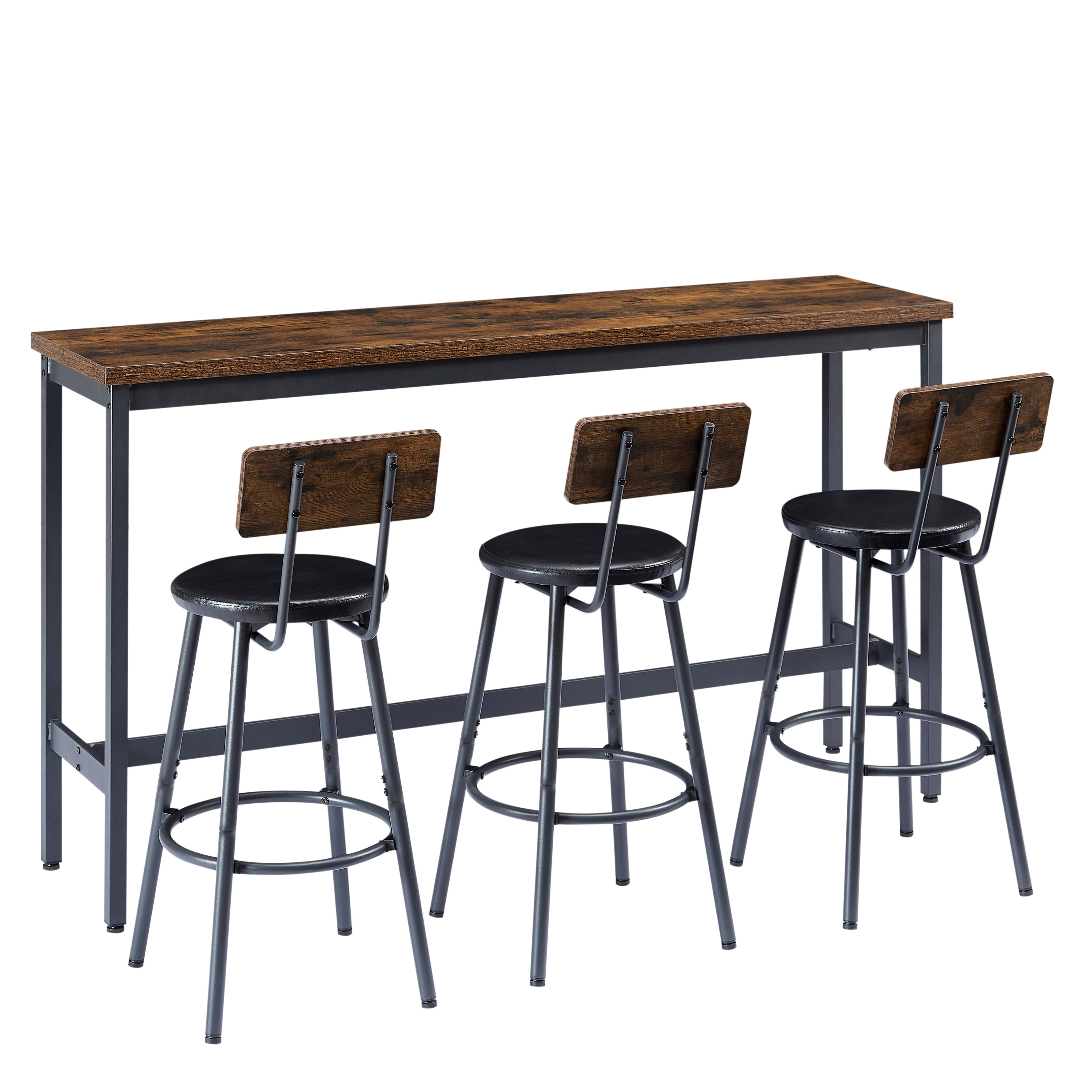 LONG BAR TABLE AND CHAIRS SET FOR 3 – This long bar table and chairs set includes one 63 “L x 15.7″W x 37.5 “H bar table and three 13 “L x 13 “W x 36.4 “H upholstered PU bar stools, which is suitable for placing anywhere in your home, perfect for sipping a drink with friends or enjoying a quick breakfast. STRONG AND STABLE CONSTRUCTION -Built to last, this dining table set boasts a steel construction with reinforced bottom beams, ensuring exceptional stability and durability. The high-quality particle board surface is not only easy to clean but also resistant to wear and tear, promising long-lasting use. COMFORTABLE BACK CHAIRS -The long bar table and chairs set comes with 3 ergonomically designed PU leather back chairs to provide you with a comfortable sitting experience. CHIC INDUSTRIAL DESIGN -Rustic brown and black paired with industrial flavor, this bar table set adds a touch of modern living to your living room, kitchen or dining room. ENHANCED STABILITY – We prioritize safety and stability, which is why our bar stools feature reinforcing rings at the bottom to increase stability and prevent tipping. Additionally, foot pads on both the table and stools can be adjusted to maintain balance on uneven floors while protecting your floors from scratches. EASY ASSEMBLY – No need to stress over assembly. With our step-by-step instructions, clearly labeled parts, and allen wrenches included, you can effortlessly assemble your new bar table and chairs set in no time, allowing you to start enjoying your space sooner rather than later. PRODUCT INFORMATION: Dining Table Size: 63 “L x 15.7″W x 37.5 “H Chair Size: 13 “L x 13 “W x 36.4 “H Static Load Capacity of Table: 260lbs Static Load Capacity of Stool: 350 lbs Features: Product Type: Dining Table Set;Bar Table Set Color: Gray/Brown Table: Yes Number of People Set Accommodates: 3 Chair Seating: Yes Number of Upholstered Chair: 3 Table Top Shape: Rectangle Table Top Material: Chipboard Panel with Melamine Veneer, Steel Structure Table Base Material: Steel Table Top Color: Brown/Gray Table Base Type: Four leg Back Style: No Back Imported: Yes Assembly: Assembly Required: Yes Level of Assembly: Full Assembly Needed Installation Required: Yes Warranty: Commercial Warranty: Yes Product Warranty: Yes Warranty Length: 3 Months Warranty Full or Limited Warranty: Full PACKAGE INFORMATION: 1 x Dining Table Set 1 x User Manual:AK_AK-HK02WPB015-N0_PUM_FX-030724
