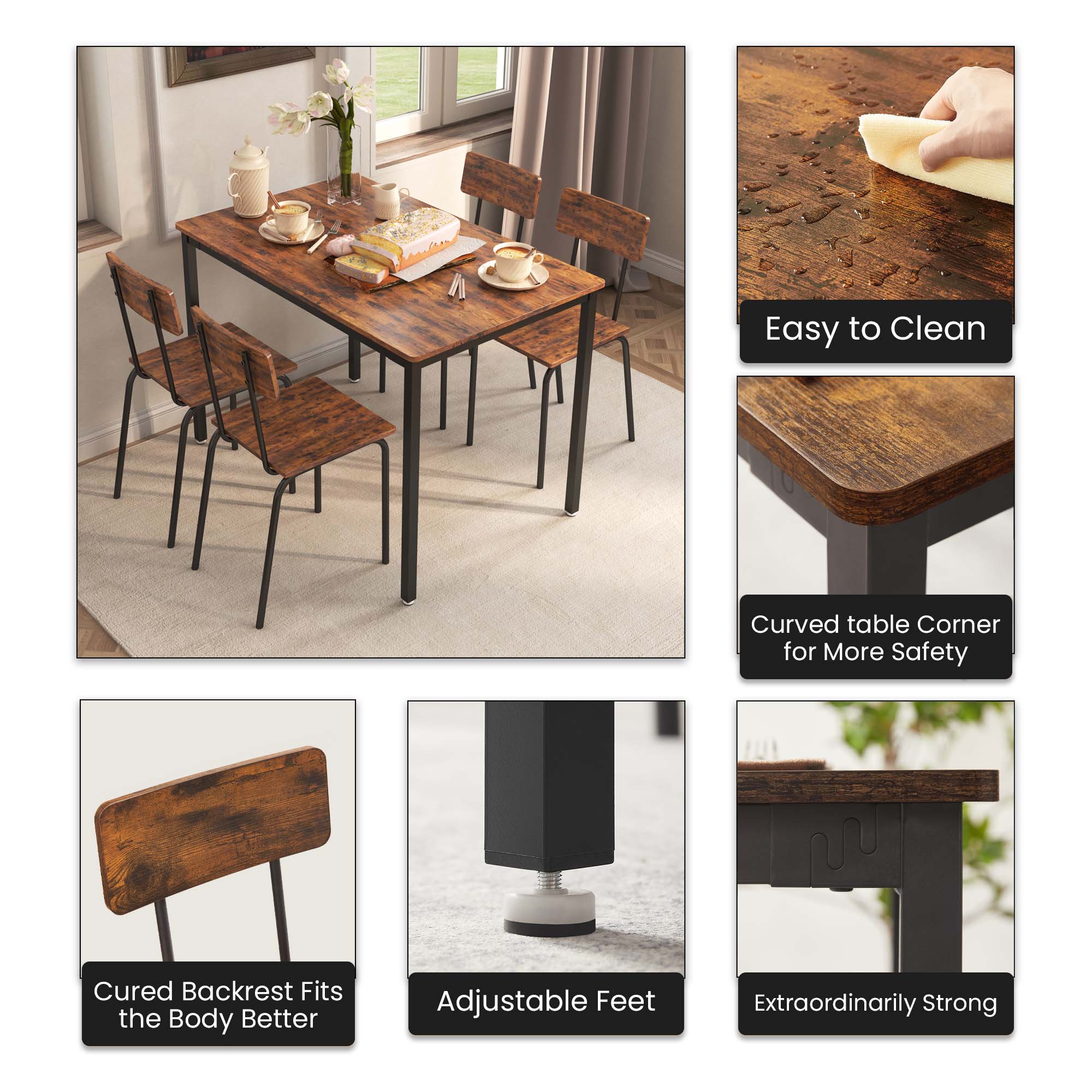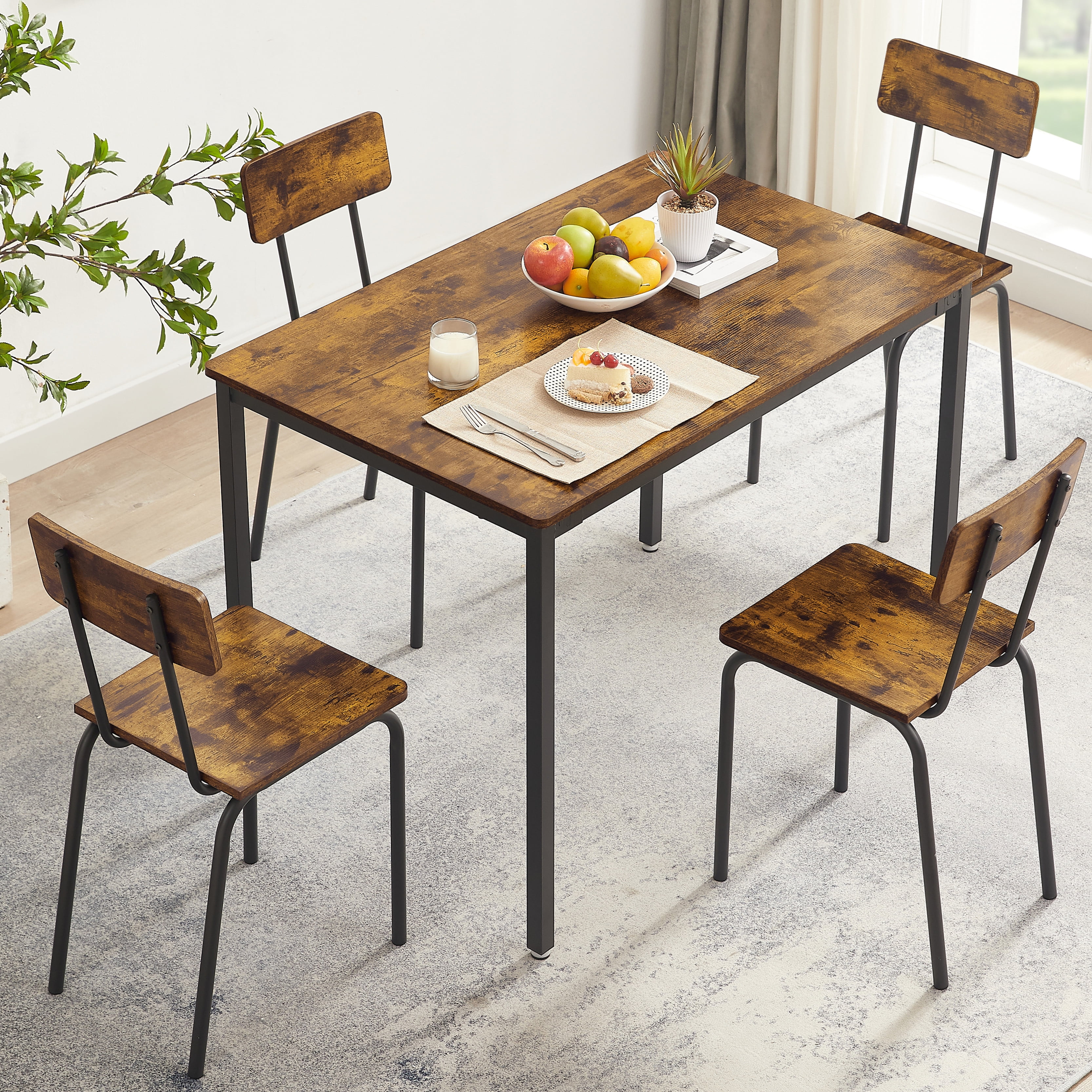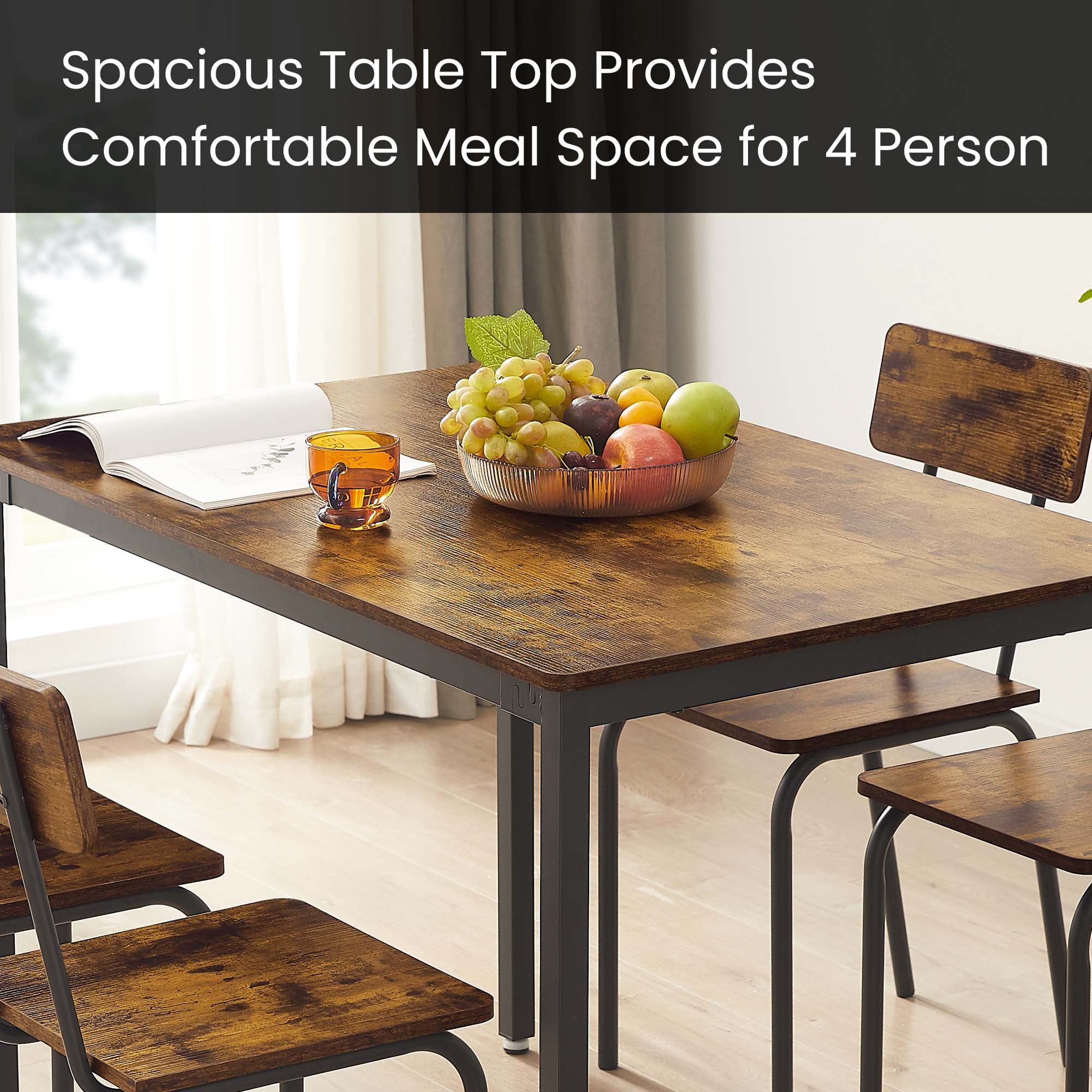 DINING TABLE SET FOR 4 – Enjoy perfect relaxation in these AK-FDT1-004dining chairs, thanks to their wide curved base and backrest that provide an ideal sitting experience. Whether for dining or other activities, these chairs offer comfort and support. DURABLE DINING TABLE AND CHAIR SET – This 5-piece dining table set is crafted from high-quality particle board with a new structure, ensuring exceptional load-bearing capacity. You can trust that it can handle the demands of daily use and more. SPACIOUS TABLETOP AND SEAT- The generously sized tabletop, measuring 43.31” L x 27.56” W, offers ample space for your morning coffee, croissants, and juices. Each of the four chairs provides a comfortable seat with dimensions of 15.74”W x 13.8” D. KITCHEN TABLE SET FOR MULTIPLE USES – The simple lines and vintage wooden tabletop create a stunning visual effect, making this dining table set suitable for various scenarios. Whether as a dining table, computer desk, writing desk, or industrial DIY workbench, it adds a touch of style to your space. STURDY AND EASY ASSEMBLY – The adjustable feet ensure stability on slightly uneven surfaces and protect your floors from scratches. The structure of this minimalist dining table for 4 is very simple and easy to set up. Exquisite hardware and detailed manual are included of the dining table. All parts of the dining room table set are listed and numbered and specific assembly steps are also shown in the instruction of the Dining Table Set. PRODUCT INFORMATION: Table: 43.31” L x 27.56” W x 30.3″H Chair:15.74”W x 13.8” D Features: Product Type: Clothes Rack/Freestanding Closet Organizer Color: Dark Brown/Gray/Brown Number of People Set Accommodates: 4 Chairs: Yes Number of Chairs Included: 1 Table Top Shape: Rectangular Table Top Material: Particle Board,Metal Top Manufactured Wood Type: MDF Table Base Material: Metal Table Base Color: Black Table Base Type: Four leg Back Style: Curved back Chair Weight Capacity: 250 lbs Table Weight Capacity: 350 lbs Supplier Intended and Approved Use: Residential Use Imported:Yes Assembly: Assembly Required: Yes Level of Assembly: Full Assembly Needed Installation Required: Yes Warranty: Commercial Warranty: Yes Product Warranty: Yes Warranty Length: 3 Months Warranty Full or Limited Warranty: Full PACKAGE INFORMATION: 1 x 5 Piece Dining Table Set for 4 1 x User Manual:AK_AK-HKDTWPB004-N6_PUM_FX-090823