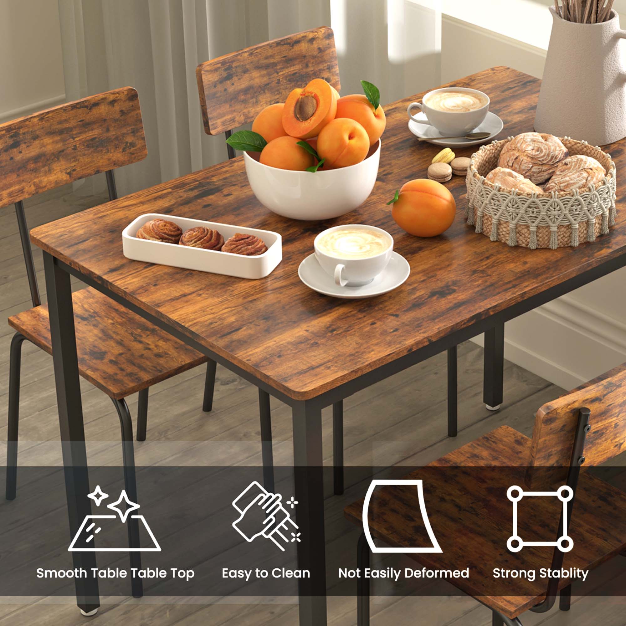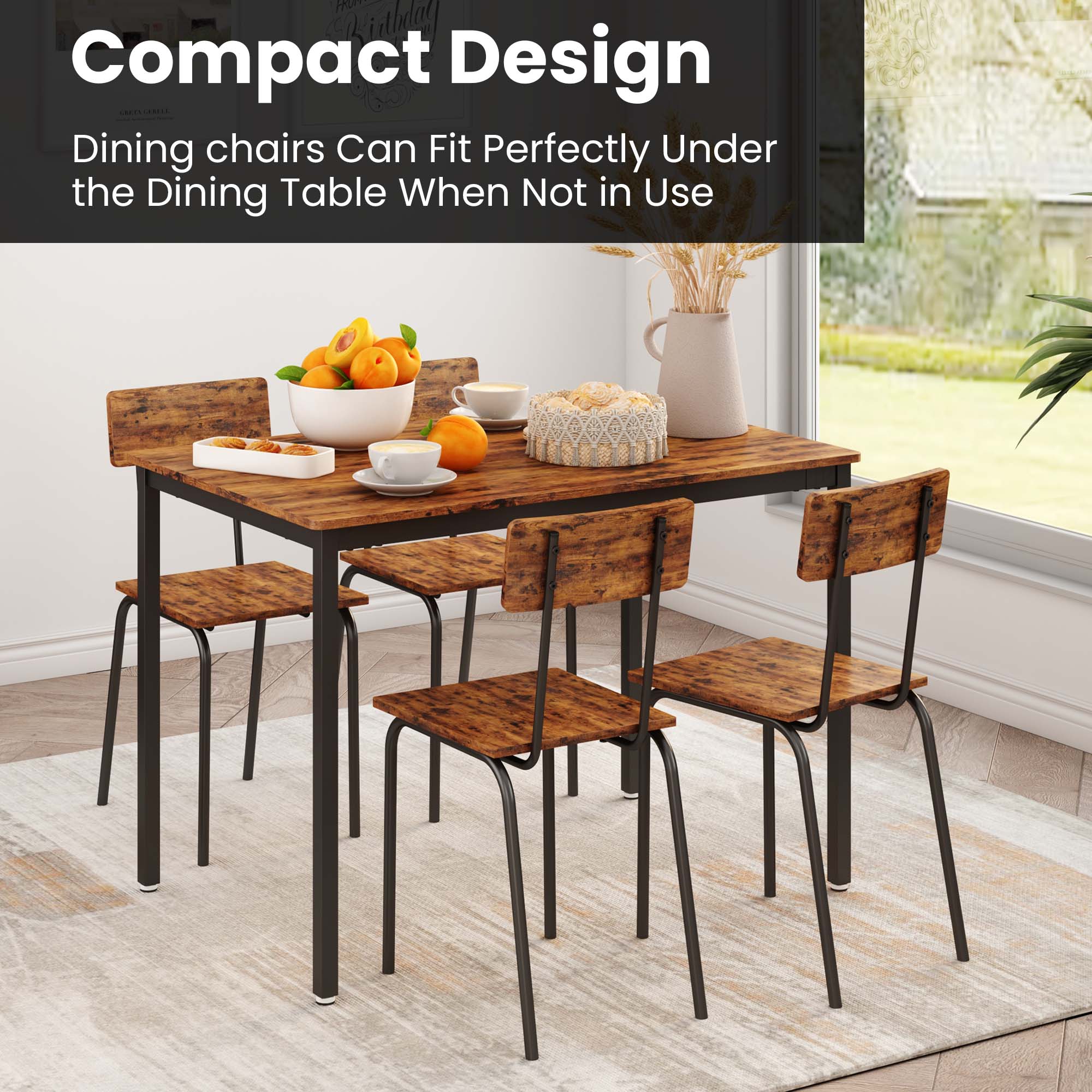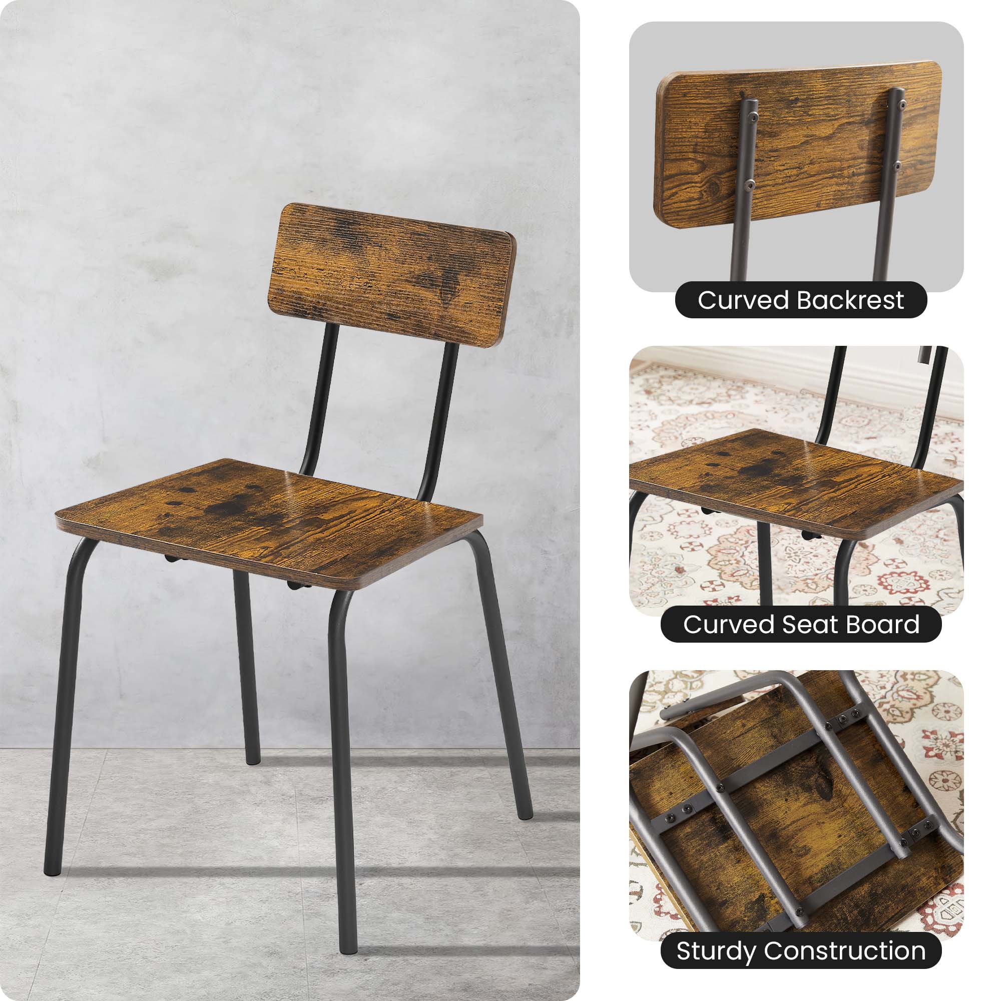 DINING TABLE SET FOR 4 – Enjoy perfect relaxation in these AK-FDT1-004dining chairs, thanks to their wide curved base and backrest that provide an ideal sitting experience. Whether for dining or other activities, these chairs offer comfort and support. DURABLE DINING TABLE AND CHAIR SET – This 5-piece dining table set is crafted from high-quality particle board with a new structure, ensuring exceptional load-bearing capacity. You can trust that it can handle the demands of daily use and more. SPACIOUS TABLETOP AND SEAT- The generously sized tabletop, measuring 43.31” L x 27.56” W, offers ample space for your morning coffee, croissants, and juices. Each of the four chairs provides a comfortable seat with dimensions of 15.74”W x 13.8” D. KITCHEN TABLE SET FOR MULTIPLE USES – The simple lines and vintage wooden tabletop create a stunning visual effect, making this dining table set suitable for various scenarios. Whether as a dining table, computer desk, writing desk, or industrial DIY workbench, it adds a touch of style to your space. STURDY AND EASY ASSEMBLY – The adjustable feet ensure stability on slightly uneven surfaces and protect your floors from scratches. The structure of this minimalist dining table for 4 is very simple and easy to set up. Exquisite hardware and detailed manual are included of the dining table. All parts of the dining room table set are listed and numbered and specific assembly steps are also shown in the instruction of the Dining Table Set. PRODUCT INFORMATION: Table: 43.31” L x 27.56” W x 30.3″H Chair:15.74”W x 13.8” D Features: Product Type: Clothes Rack/Freestanding Closet Organizer Color: Dark Brown/Gray/Brown Number of People Set Accommodates: 4 Chairs: Yes Number of Chairs Included: 1 Table Top Shape: Rectangular Table Top Material: Particle Board,Metal Top Manufactured Wood Type: MDF Table Base Material: Metal Table Base Color: Black Table Base Type: Four leg Back Style: Curved back Chair Weight Capacity: 250 lbs Table Weight Capacity: 350 lbs Supplier Intended and Approved Use: Residential Use Imported:Yes Assembly: Assembly Required: Yes Level of Assembly: Full Assembly Needed Installation Required: Yes Warranty: Commercial Warranty: Yes Product Warranty: Yes Warranty Length: 3 Months Warranty Full or Limited Warranty: Full PACKAGE INFORMATION: 1 x 5 Piece Dining Table Set for 4 1 x User Manual:AK_AK-HKDTWPB004-N6_PUM_FX-090823