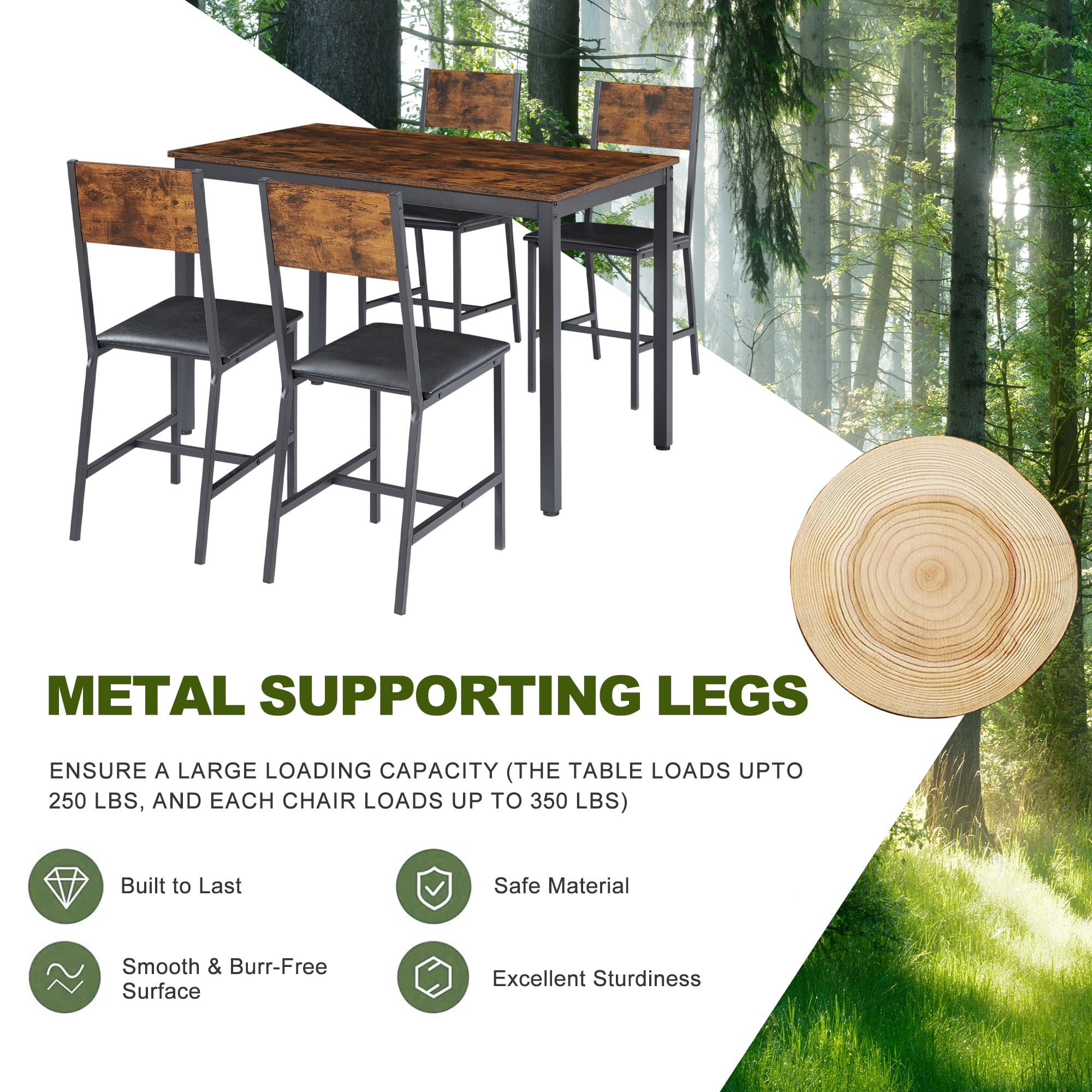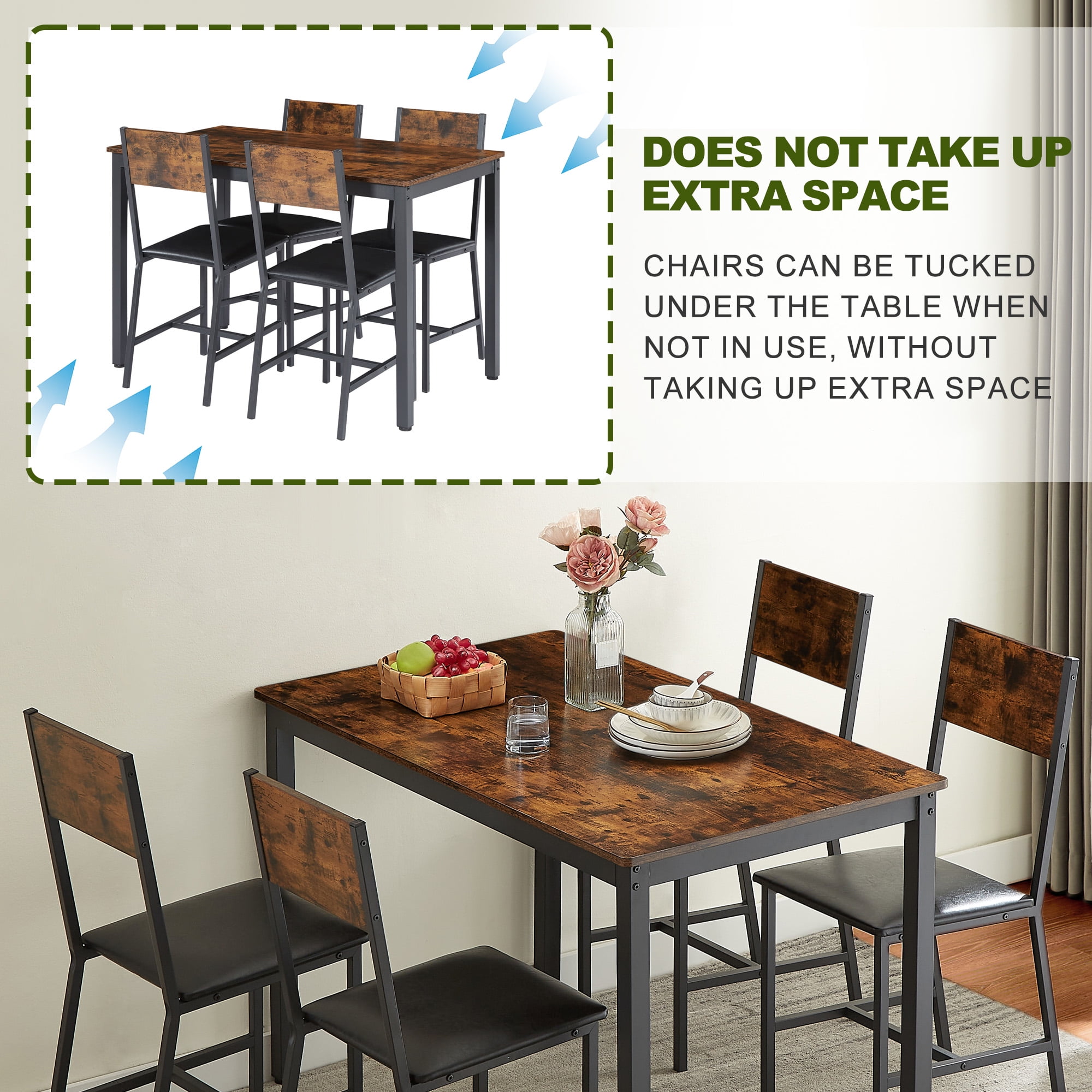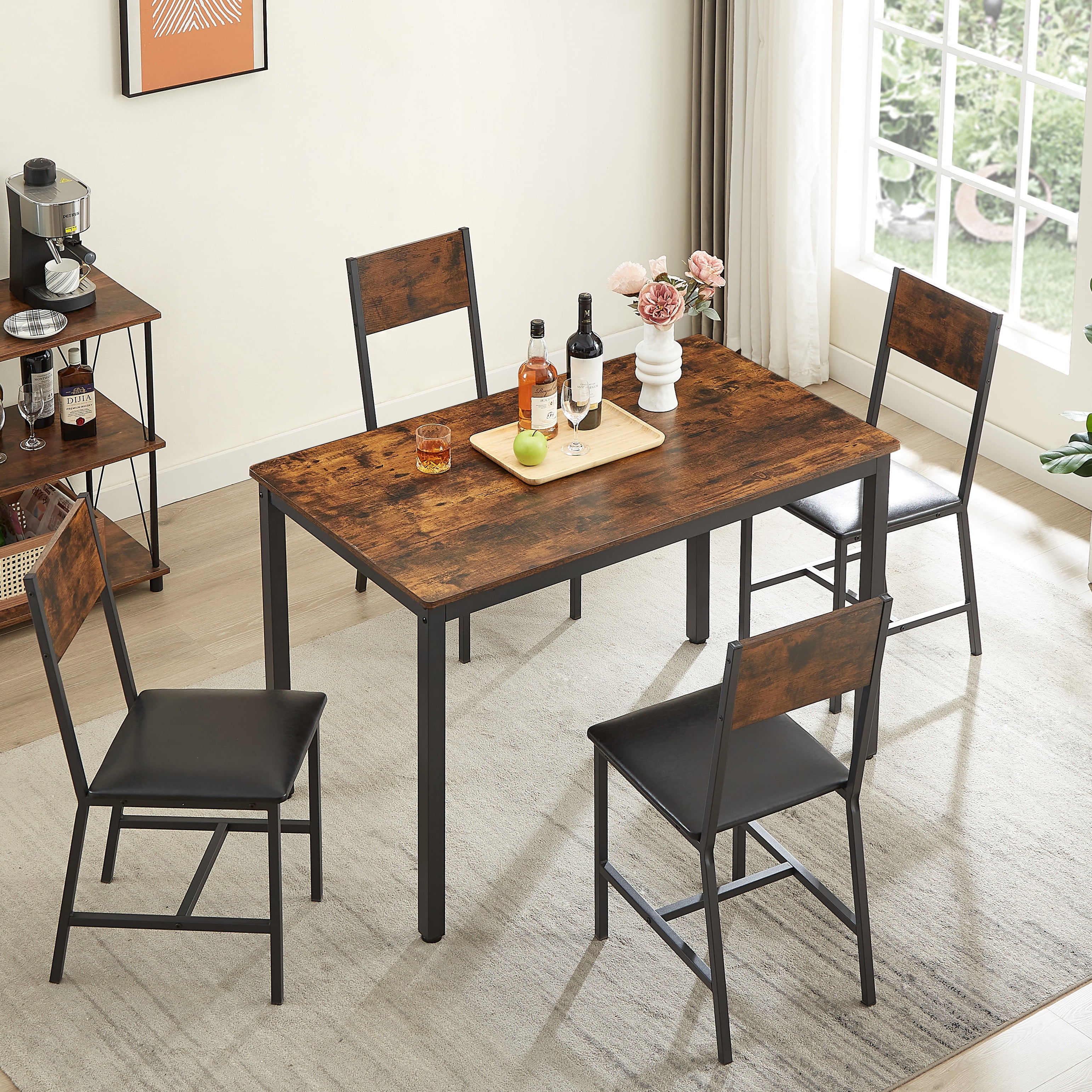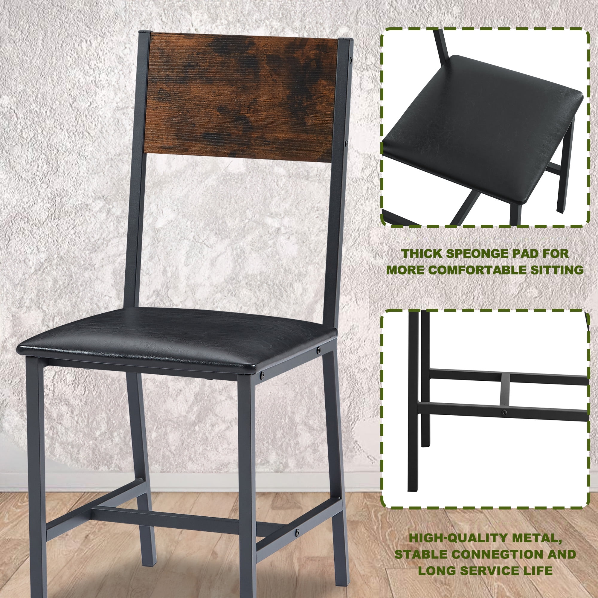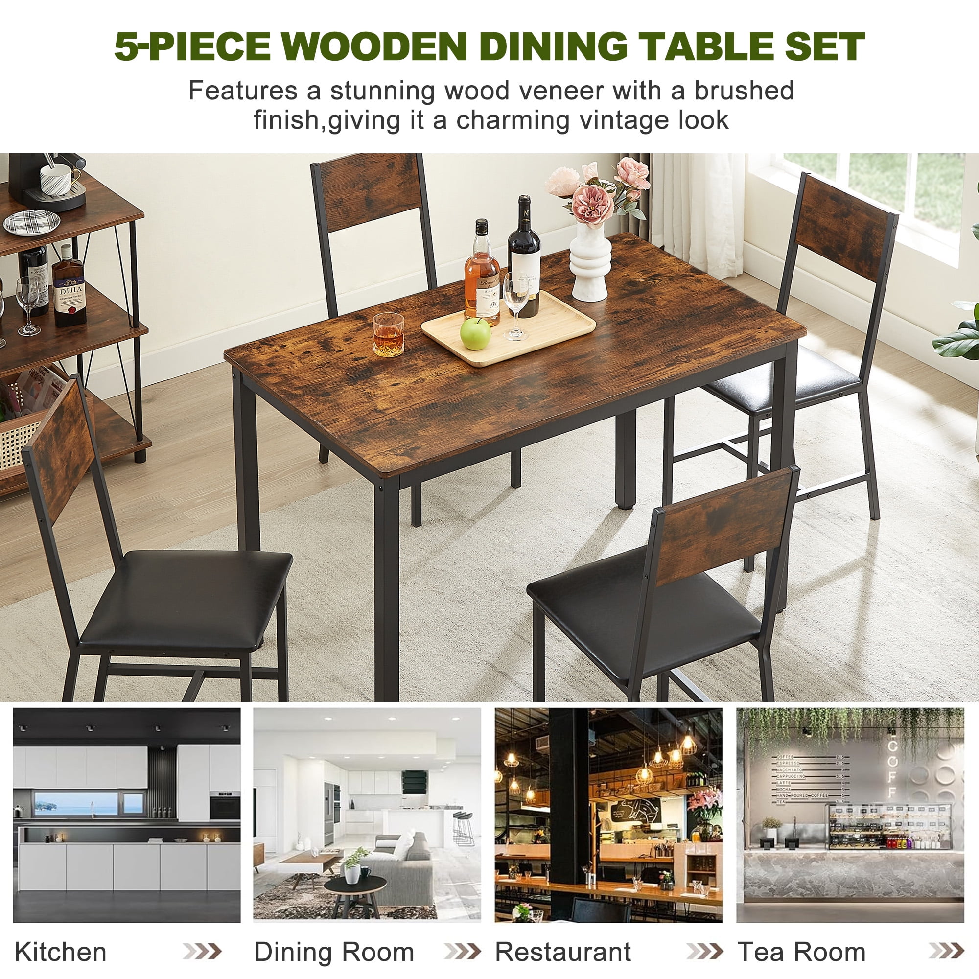 DINING TABLE CHAIRS SET OF 4 -The AK-FDT1-005 5-piece kitchen dining set includes a rectangular dining table and 4 wooden dining chairs, allowing you to enjoy delightful dining or drinking time with family or friends. The table measures 2” L x 27.6” W x 29.7” H, and the chair measures 13.8″L x 18.1″W x 34.3″H COMFORTABLE SEATING EXPERIENCE -The PU leather kitchen table set with chairs provide a comfortable seating experience, perfect for long meals with family and friends.The modern style black metal frame has a powder coating has an rust-resistant effect. SPACE-SAVING DESIGN – chairs can be tucked under the table when not in use, which can optimize the use of your living space and is suitable for small dining areas or apartments. Besides, the dining chair comes with a wide and comfy backrest, providing ergonomic and comfy support. CLASSIC & RETRO STYLE -The 5-piece Mdining table set features a stunning wood veneer with a brushed finish, giving it a charming vintage look. And it is suitable for various occasions, such as kitchens, dining rooms, restaurants, tea rooms, and more. RELIABLE WEIGHT CAPACITY -Each chair has a weight capacity of 350 lbs while the table can support up to 250 lbs, ensuring a sturdy and durable dining experience PRODUCT INFORMATION: Bar Table Size:47.2” L x 27.6” W x 29.7” H Chair Size: 13.8″L x 18.1″W x 34.3″H Overall Product Weight: 77.44 LBS Features: Product Type: Dining Table Set Color: Dark Brown/Brown Table: Yes Number of People Set Accommodates: 4 Chair Seating: Yes Table Top Shape: Rectangular Table Top Material: MDF Table Base Material: Metal Seating Material: Particle Board Table Top Color: Residential Use/Non-Residential Use Table Base Type: Four leg Supplier Intended and Approved Use: Residential Use; Non Residential Use Chair Weight Capacity: 350 lbs Table Weight Capacity: 250 lbs Back Style: Backrest Imported: Yes Durability: Waterproof Assembly: Assembly Required: Yes Level of Assembly: Full Assembly Needed Installation Required: Yes Warranty: Commercial Warranty: Yes Product Warranty: Yes Warranty Length: 3 Months Warranty Full or Limited Warranty: Full PACKAGE INFORMATION: 1 x Dining Table Set 1 x User Manual:AK_AK-HKDTWX1016-N0_PUM_FX-101023