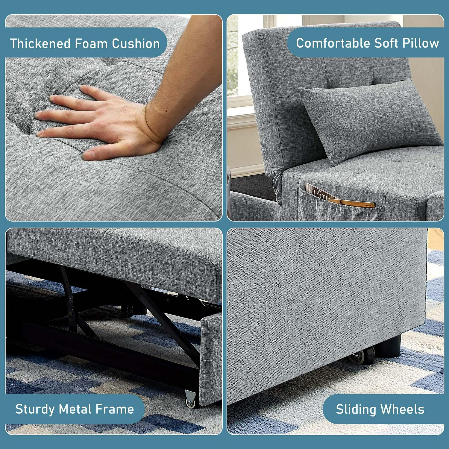 STURDY FRAME AND SOFT FABRIC -The convertible chair sleeper bed is made of high-quality steel frame, ensuring best durability in daily use and weight capacity 250 lbs. Comfortable linen fabric and high-density foam upholstery give a soft feeling and excellent support. And 4 widened wood support feet provide great stability.