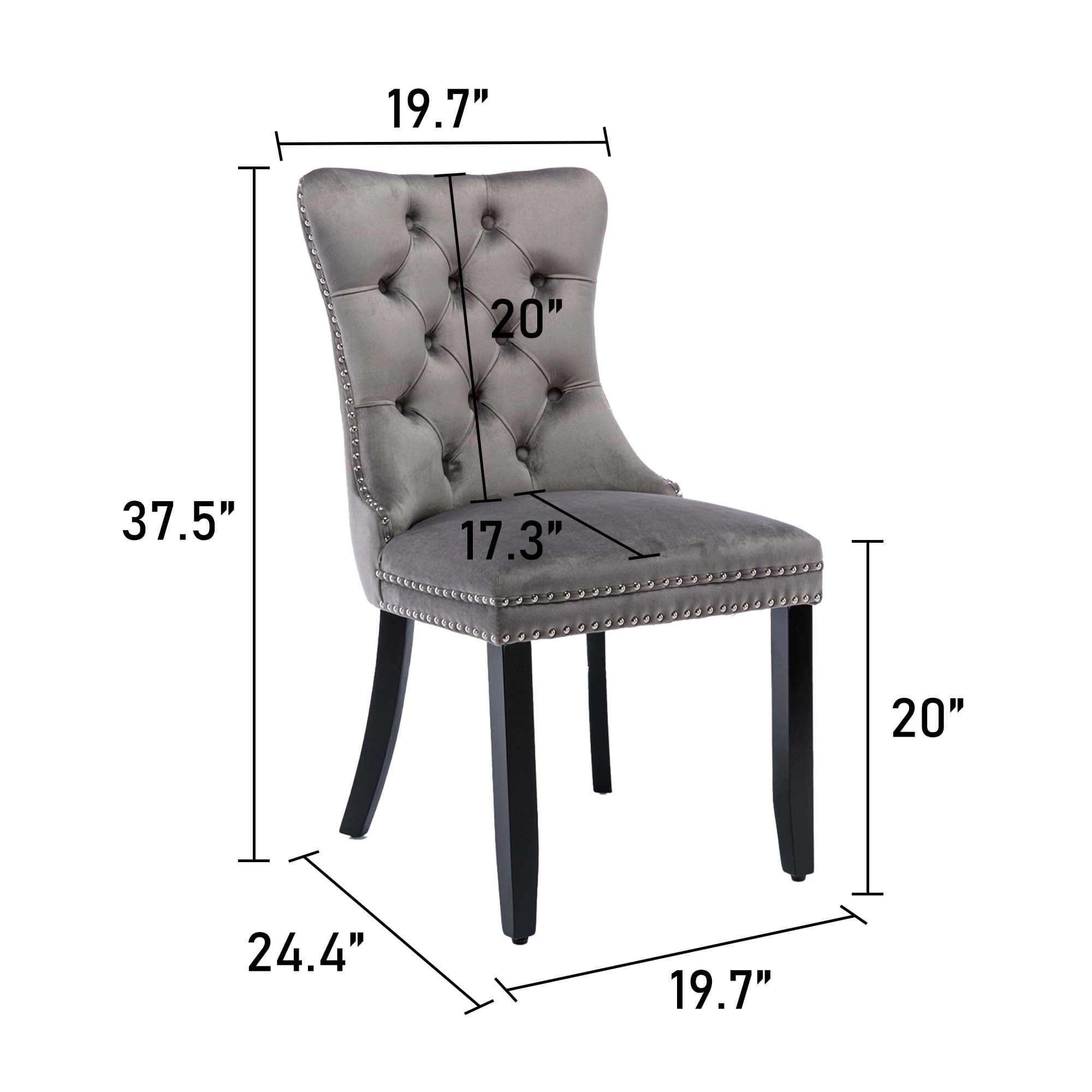 Features UNPARALLELED COMFORT AND STRENGTH – Experience modern luxury thickened velvet (280g/㎡) upholstered dining chairs. They are filled with high-density foam, ensuring unparalleled comfort and extraordinary strength. ARTISTIC DESIGN AND ENHANCED COMFORT – Featuring a distinctive button tufted velvet backrests, our dining chairs are designed with an artistic touch that contours your back for enhanced comfort. DISTINCTIVE NAILHEAD TRIM STYLE – Elevated by handcrafted decorative nailhead trim, these modern chairs infuse your dining space with a dash of distinction, this blend of style and sophistication seamlessly integrates with any home decor, offering an upgrade to your dining area that is as stunning as it is practical. EXCEPTIONAL STABILITY AND ELEGANCE – Built to last, the chairs boast solid wood legs that not only provide exceptional stability but also add a touch of elegance to your dining room. EASY ASSEMBLY AND HASSLE-FREE EXPERIENCE – Our velvet kitchen chairs are also designed with user convenience in mind. The assembly process is straightforward and easy, thanks to the comprehensive manual provided. This ensures a hassle-free experience, allowing you to enjoy your new dining chairs as quickly as possible. Weight & Dimensions Overall: 19.7″W x 24.4″ D x 37.5″H Seat: 19.7”W x 17.3”D x 20”H Overall Product Weight: 37.5”H Number of packages: 1 Specifications Product Type: Dining Chairs, Side Chairs Material: Cloud Velvet Foam Color: Pink/Olive/Blue/Gray/Black/Green/Gold/Orange/khaki/Light Blue/Red Leg Color: 2 Colors Main Material: Fabric Leg Material: Solid Wood Upholstered: Yes Upholstery Material: Cloud Velvet Natural Variation Type: No Natural Variation Back Style: Upholstered Back Foldable: No Wheels Included: No Supplier Intended and Approved Use: Residential Use Arms Included: No Weight Capacity of Each Chair: 300 lbs Package Information 2 x Dining Chairs 1 x Tool Kit 1 x User Manual: AK_AK-HK01FC3006-K2_PUM_VY-051923 Notes Manual measurement has been used, there may be some reasonable error. All the pictures are taken by actual samples, slight chromatic aberration may occur due to lighting or display.