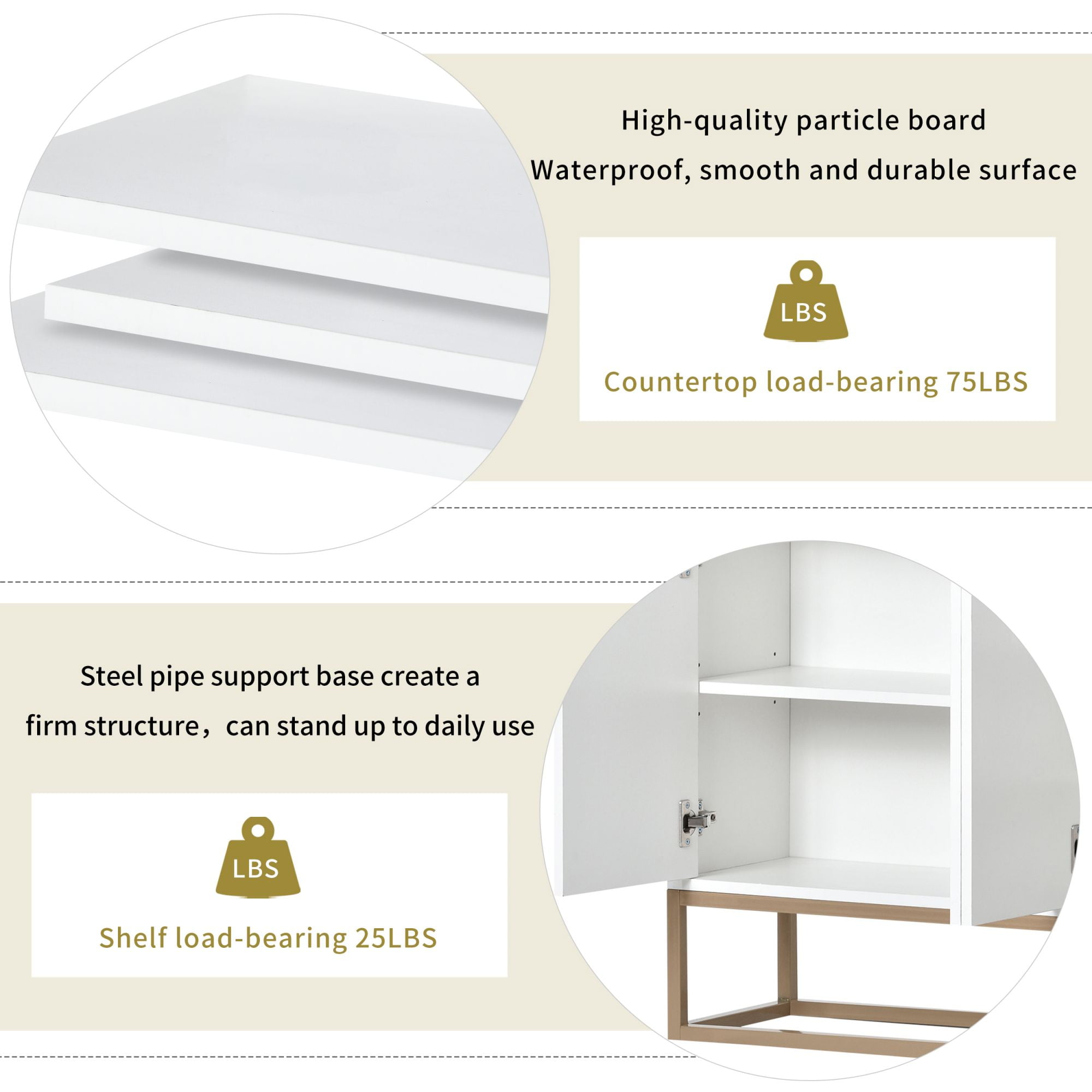 UNIQUE DOOR DESIGN – The unique feature of this AK-FKC2-009 Sideboard cabinet is that there is no regular door handle. The four straight-opening doors can be opened by the door rebound device only by pressing the middle. When closing,you can firmly close the cabinet door by pressing a little harder. EXPAND DINING STORAGE – The thoughtful countertop fence design allows you to use the countertop more safely. The internal three shelves provide enough storage space, the left single shelf can be adjusted to three heights as well or users can remove it if need. And the right two shelves divide the cabinet into three storage spaces. can be used to store small appliances, dishes, glassware, towels, wine, and anything else you have in mind. DURABLE AND DECORATIVE – High-quality particle board and steel pipe support base create a firm structure. The surface of the triamine sticker is waterproof, smooth and durable, the countertop load-bearing 75LBS, the shelf load-bearing 25LBS.It can stand up to daily use even in the long run without losing its stylish charm. MORDERN ELEGANT SIDEBOARD – This sideboard buffet cabinet features a white cabinet body with gold metal legs, compact look is very suitable for small space. Whole dimensions: 47.2”Lx11.8”Wx31.5”H. ASSEMBLY & SERVICE – An installation instruction manual is shipped with the product, and clear and logical illustrations in it are easy to understand, users just need to follow it and take about an hour to complete the installation procedure. PRODUCT INFORMATION Product Dimensions:47.2″L X 11.8″W x 31.5″H Weight:68.86 LBS Package Dimensions:53″LX 17″W X 8″H Weight:76.72 LBS Cabinet Interior Dimensions:22.6″L X 10.6″W x 19.9″H Tabletop:75 LBS Shelf:25 LBS Features Product Name:Sideboard Material:Particle board Back panel:3mm Other panels:15mm Finish:Yes Drawers Included:No Cabinets Included:Yes Number of Doors:4 Magnetic Door Catches:Yes Shelves Included:Yes Number of Interior Shelves:5 Cable Management:No Supplier Intended and Approved Use:Non Residential Use; Residential Use Product Care Instructions:Wipe with Damp Cloth PACKAGE INFORMATION: 1x Sideboard 1 x User Manual: AK_AK-HKKCWPB009-W0_PUM_YL-032723