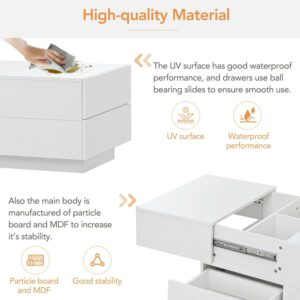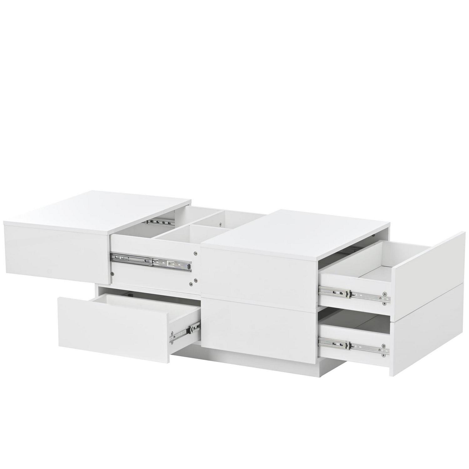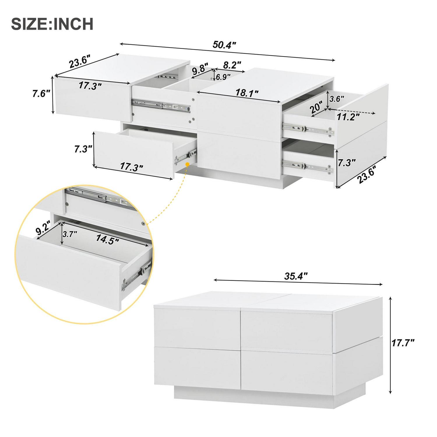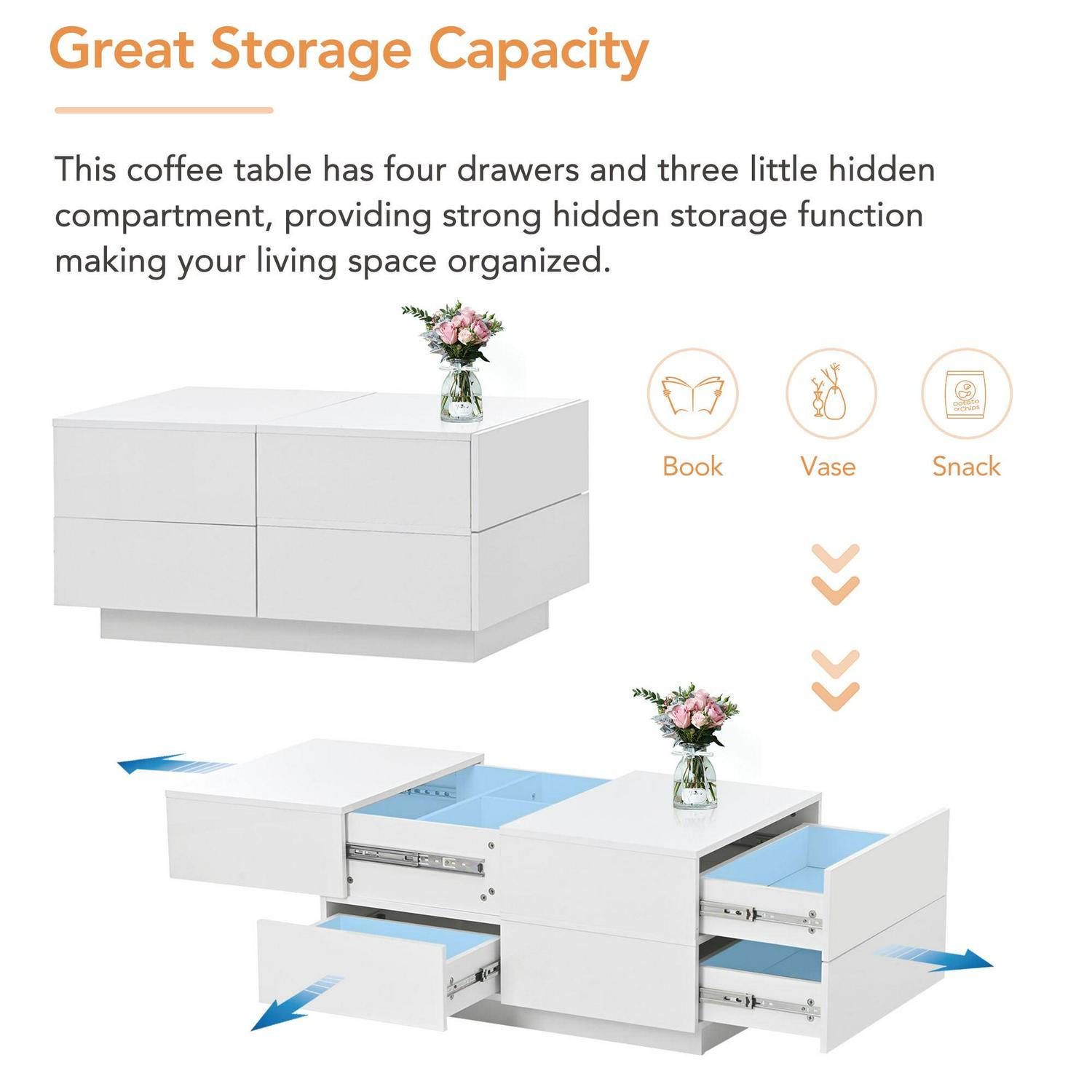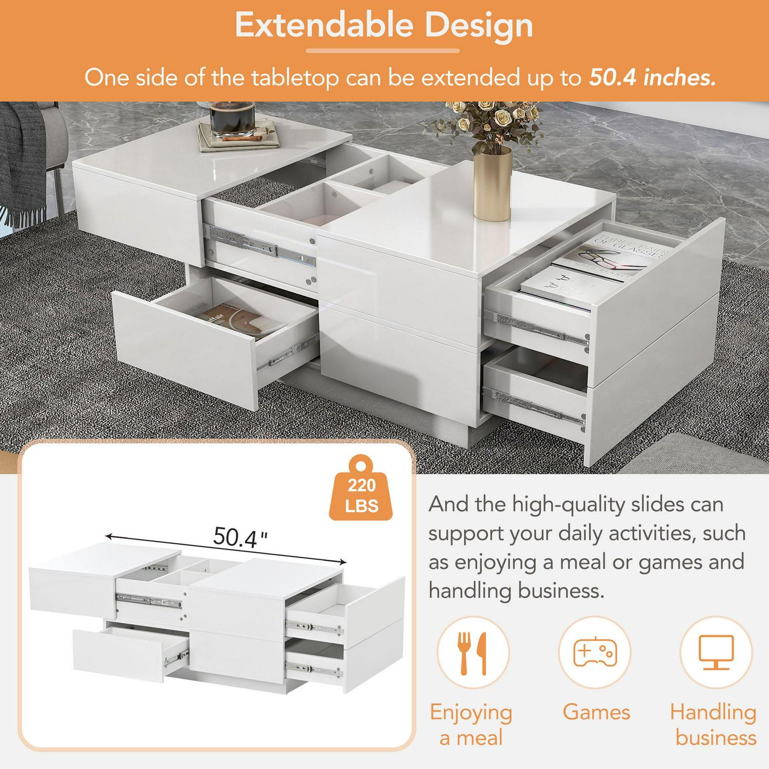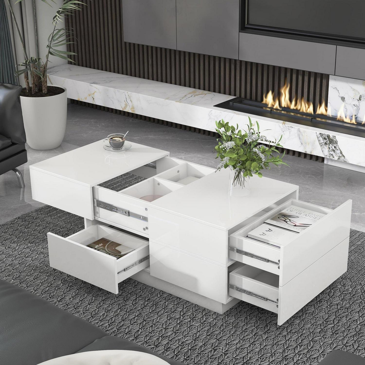 Aukfa Modern Extendable Coffee Table – Rectangle Cocktail Table with 4 Storage Drawers – White