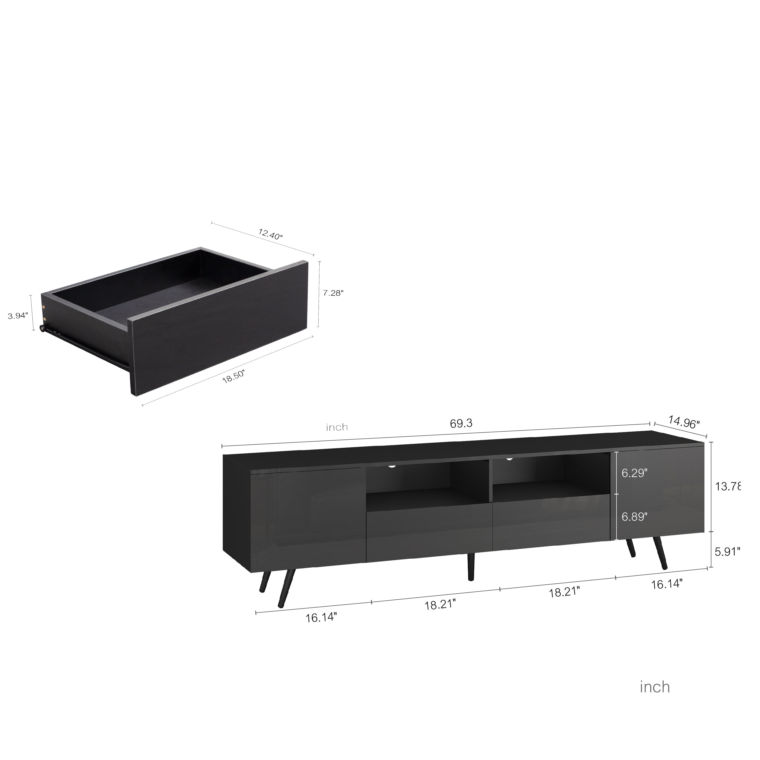 MODERN TV STAND – Featuring a classic two-door design with a look and pine legs, the simple lines of the long TV stand design can easily be incorporated into a variety of decorative aesthetics to enhance the look of any room. LARGE STORAGE SPACE -This entertainment center has two open shelves and 2 spacious cabinets to store DVDs, media players or gaming devices. The bottom-to-floor clearance is 5.91 inches, making cleaning all the easier. LED TV STAND – Entrintou TV stand has built-in LED lighting, 16 colors, 20 modes, and 4 adjustable brightness levels, and it’s equipped with a wire hole makes plugging in devices easy. The led TV stand will create the right atmosphere while you’re watching movies, playing games, or interacting with your kids. ENTERTAINMENT CENTER FOR 75 INCH TV -Both a entertainment centers and a console table, it can be used in living rooms, bedrooms, dens, and many other settings. It’s even better when used as a hallway entry table. 70″ TV stand for TVs up to 80 inch. EASY TO ASSEMBLE -Detailed instructions are included to help you assemble your TV stand easily. Whenever you have questions, we are happy to assist you. PRODUCT INFORMATION: Overall: 3″W x 14.96″D x 19.68″H Drawer: 18.5″W x 12.4″D x 3.94″H Cabinet: 16.14″W x 14.96″D x 13.78″H Overall Product Weight: 72.82LBS Features: Product Type: Modern TV Stand Color: Black/White Top Shape: Rectangle Furniture Design: Cabinet/Enclosed storage Top Material: Solid Wood Base Material: Solid Wood Wheels Included: No Built-In Lighting: Yes Shelves Included: Yes Drawer of Shelves: 2 Cabinets Included: Yes Natural Variation Type: No Cable Management: Yes Supplier Intended and Approved Use: Residential Use Assembly: Assembly Required: Yes Level of Assembly: Full Assembly Needed Installation Required: Yes Warranty: Commercial Warranty: Yes Product Warranty: Yes Warranty Length: 12 Months Warranty Full or Limited Warranty: Full PACKAGE INFORMATION: 1 x TV Stand 1 x User Manual:AK_AK-HL04WX1110-K0_PUM_FX-101223