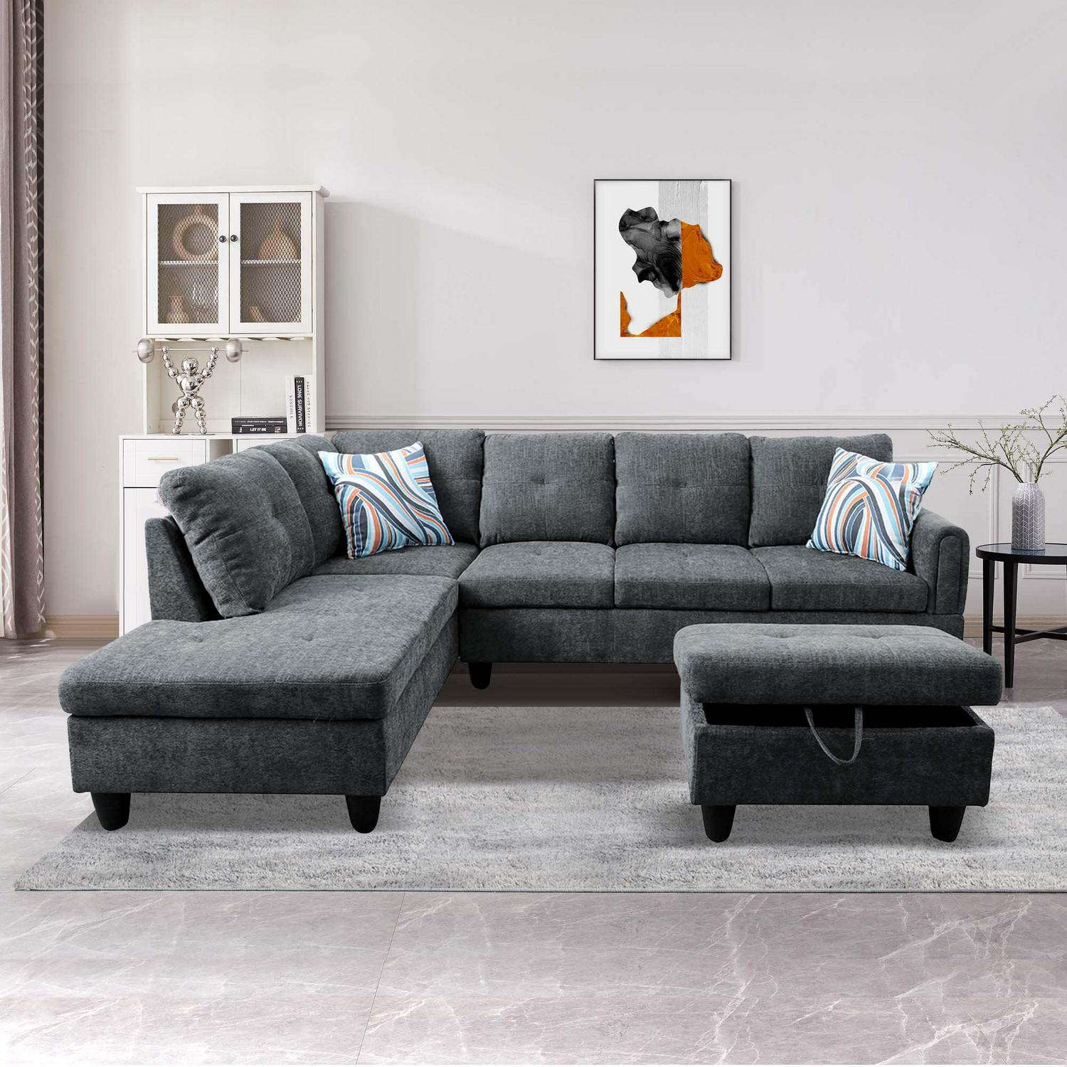 Aukfa Sectional Sofa, Living Room Couch with Storage Ottoman, Left Facing Chaise, Flannel, Dark Gray
