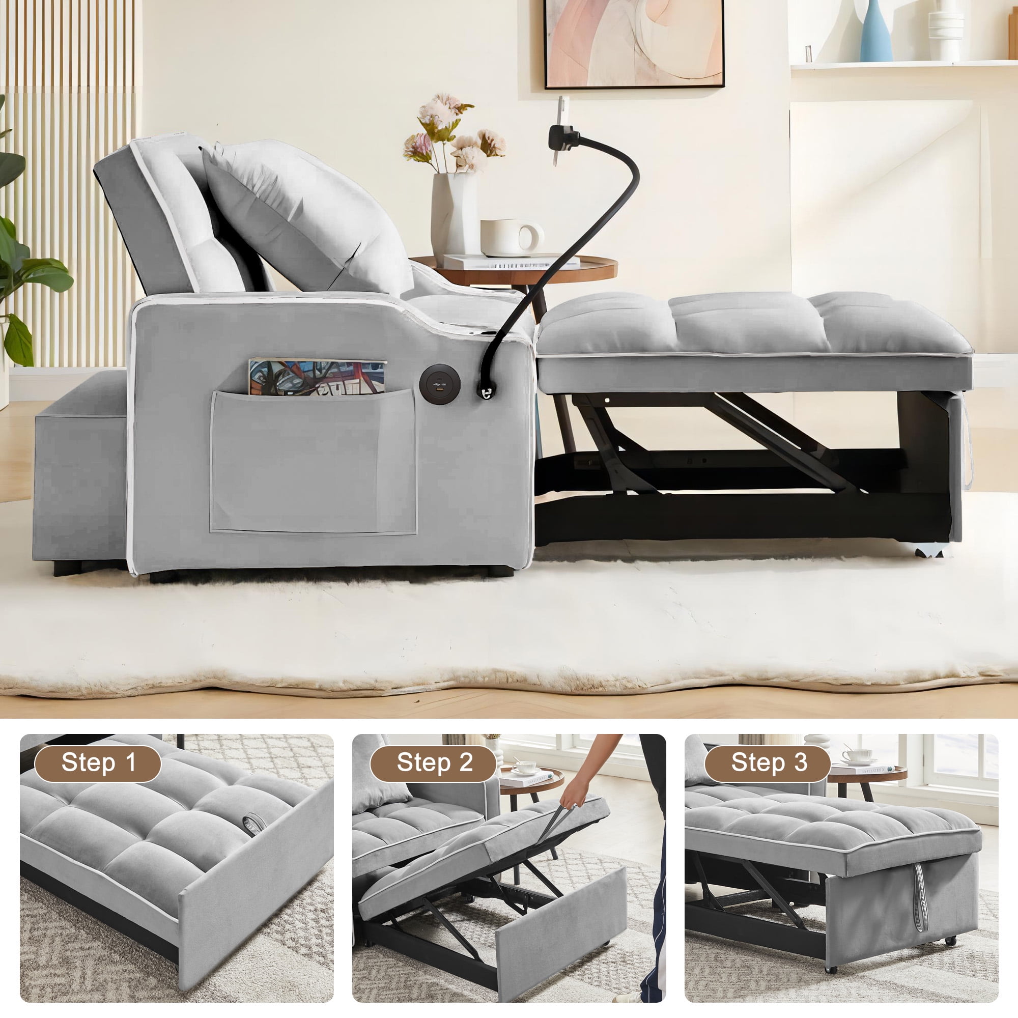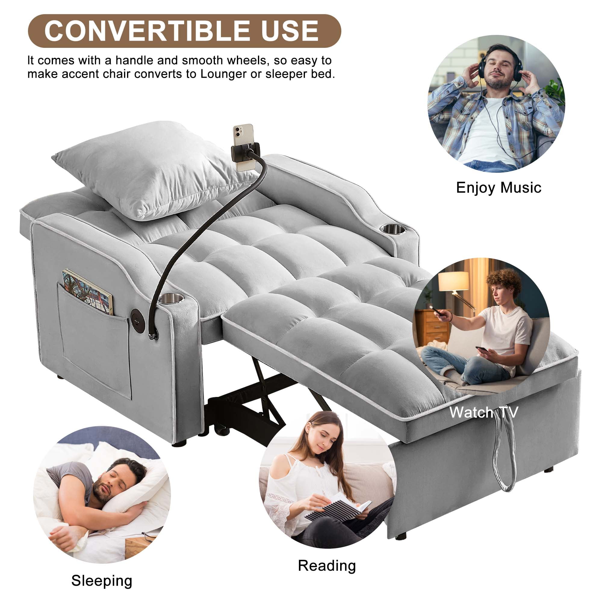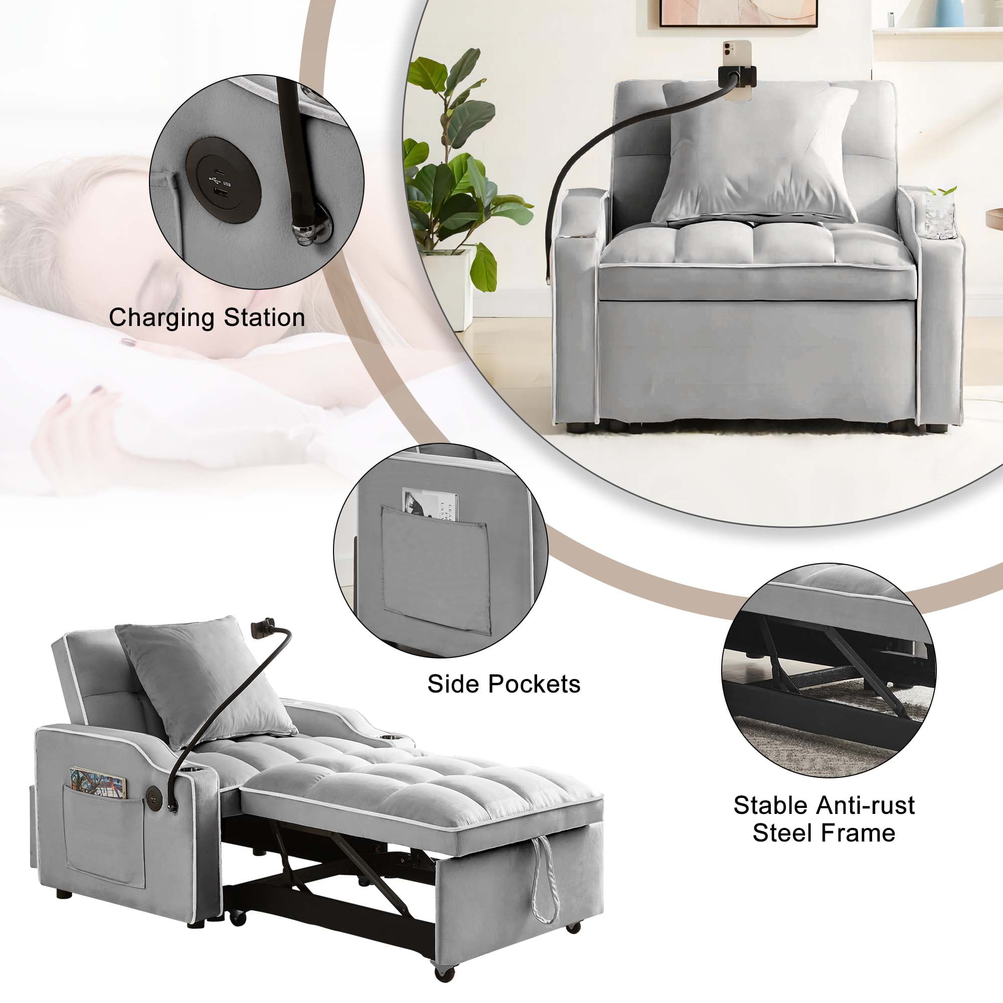 Aukfa Sleeper Chair Bed, Convertible Pull Out Sofa Bed with USB Port, Cup Holders and Swivel Phone Holder, Gray
