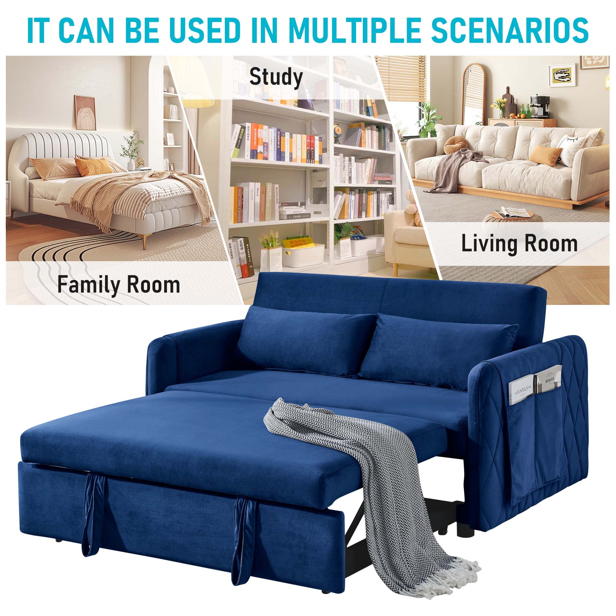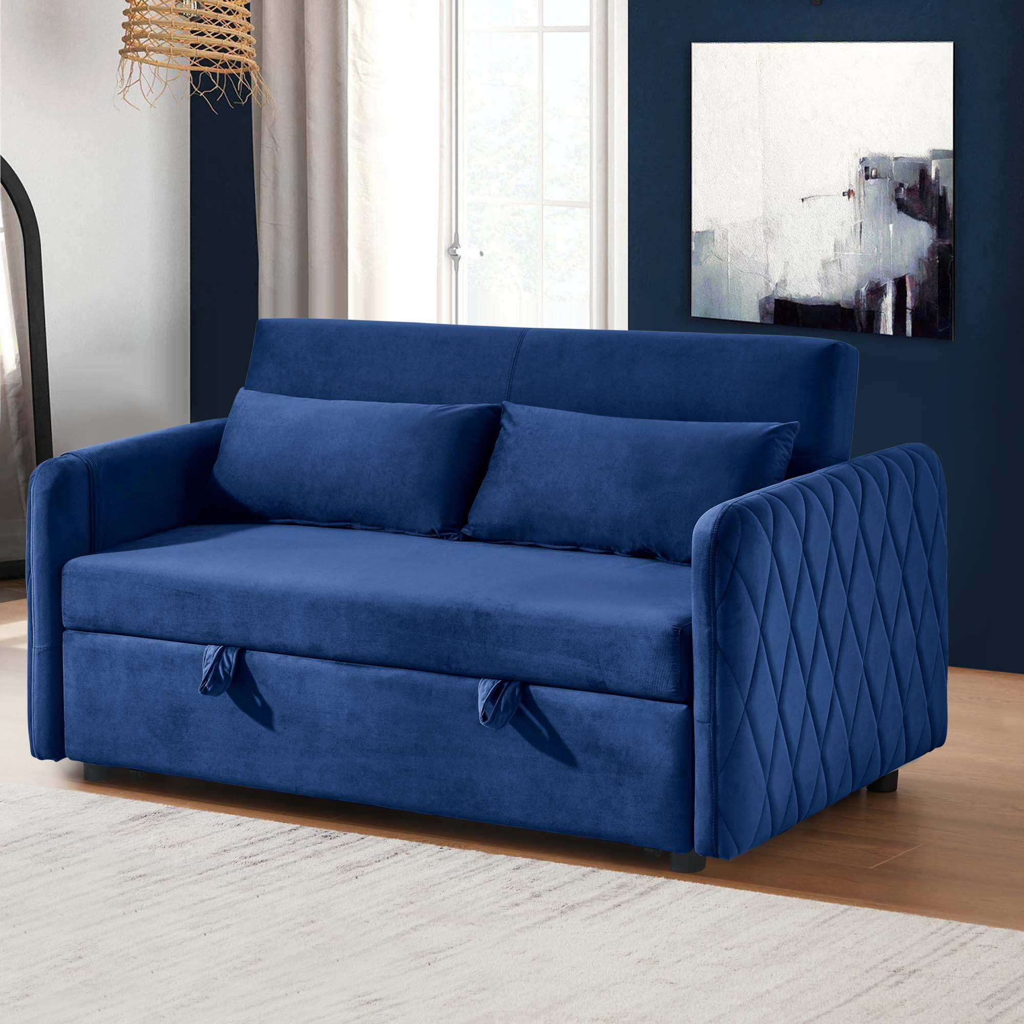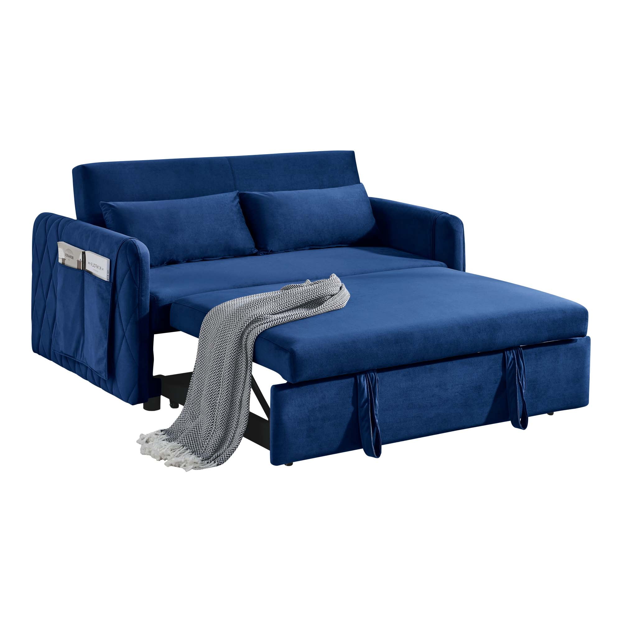 Features CONVERTIBLE PULL-OUT SOFA BED – This AK-FS02-008 multifunctional sleeper sofa bed can be easily and quickly converted into armchairs, visitor chairs, and recliners. Pull the included handle and it slides out on its rollers to make loveseat sofa converts to sleeper bed easily, no matter what room it is, whether it is a large room, small room, studios and offices, this is your best choice. The twin-sized sleeper bed can accommodate your overnight guests and is also used for boat, camper and RV. 3 LEVELS ADJUSTABLE BACKREST – Soft velvet fabric and high-density foam, the backrest can be adjusted to 3 positions, 105°-180° recline or lie flat, it can be used for listening, playing games, reading, and sleeping. This loveseat sofa couch will make you feel relaxed and comfortable. STRONGE STRUCTURE — This pull-out couch crafted of sturdy wood frame, strong sinuous spring, high-density foam, soft velvet fabric, good foam-filled seats, soft 2 lumbar pillows for added back support or sleep make you feels so comfortable to take a good rest. Maximum Weight Capacity is 500 lbs. SPACE SAVING DESIGN AND STORAGE POCKETS – This sofa beds sleeper is the perfect complement to any contemporary living space. With its folded compact size, it is easy to store and space saving when not use. Our sofa comes with a removable side storage bag for you to reach and use to store your TV remote, cell phone, glasses or books. EASY TO ASSEMBLE AND USE – Easy-to-follow instructions ensure the perfect build and pull-out recliner setup is quick and easy. 1 package, any problem please feel free to contact us. Weight & Dimensions Overall: 55″W x 38″D x 30.5″H Seat: 55”W x 16”D x 17.5″H Arm Height – Floor to Arm: 24″ Back Height – Seat to Top of Back: 15.5″ Overall Product Weight: 125 lbs Leg Height – Top to Bottom: 2″ Cushion Thickness: 4.5″ Dimensions when fully extended: 70″D x 45.5″ W Number of packages: 1 Specifications Type: Sleeper Sofa Design: Sofa Bed Color: Blue Seating Capacity: 2 Upholstery Material: Velvet Frame Material: Pine Wood, Metal Wood Species: Eucalyptus Leg Material: Plastic Seat Fill Material: Foam Seat Construction: Sinuous Springs; Solid Wood Back Fill Material: Polyester, Foam Removable Cushions: No Toss Pillows Included: Yes (2 pillows) Storage Pocket Included: Yes Durability: Stain Resistant; UV/Fade Resistant; Scratch Resistant Arm Type: Square Arm Seat Style: Single Cushion Seat Back Type: Cushion Back Cushion Construction: Foam Weight Capacity: 500 lbs Adjustable Components: Backrest Sleeper Sofa: Yes Sleeper Size: Twin Supplier Intended and Approved Use: Residential Use Product Care: Dust regularly. Clean gently with a clean, slightly damp cloth. Professional cleaning is recommended. Avoid direct sunlight. Never apply or clean with harsh chemicals. Cleaning Code: Clean with water-based or dry, solvent-based cleaners CAL TB 117-2013 Compliant: Yes Package Information 1 x Sofa Bed 2 x Pillows 1 x Tool Kit 1 x User Manual: AK_AK-HLS0FV1009-K3_PUM_VY-051723 Notes Manual measurement has been used, there may be some reasonable error. All the pictures are taken by actual samples, slight chromatic aberration may occur due to lighting or display.