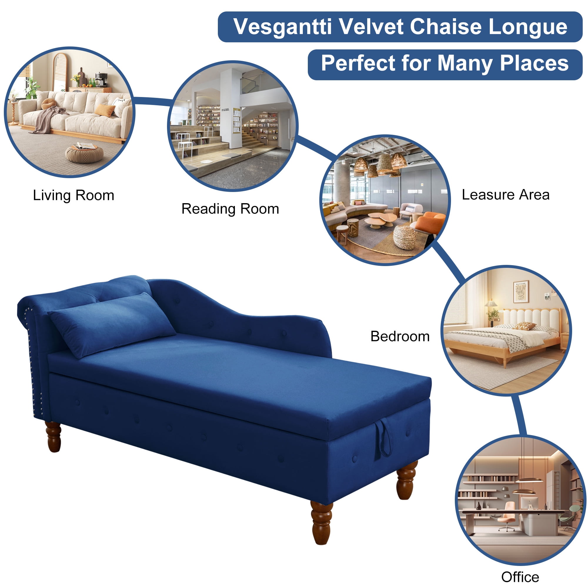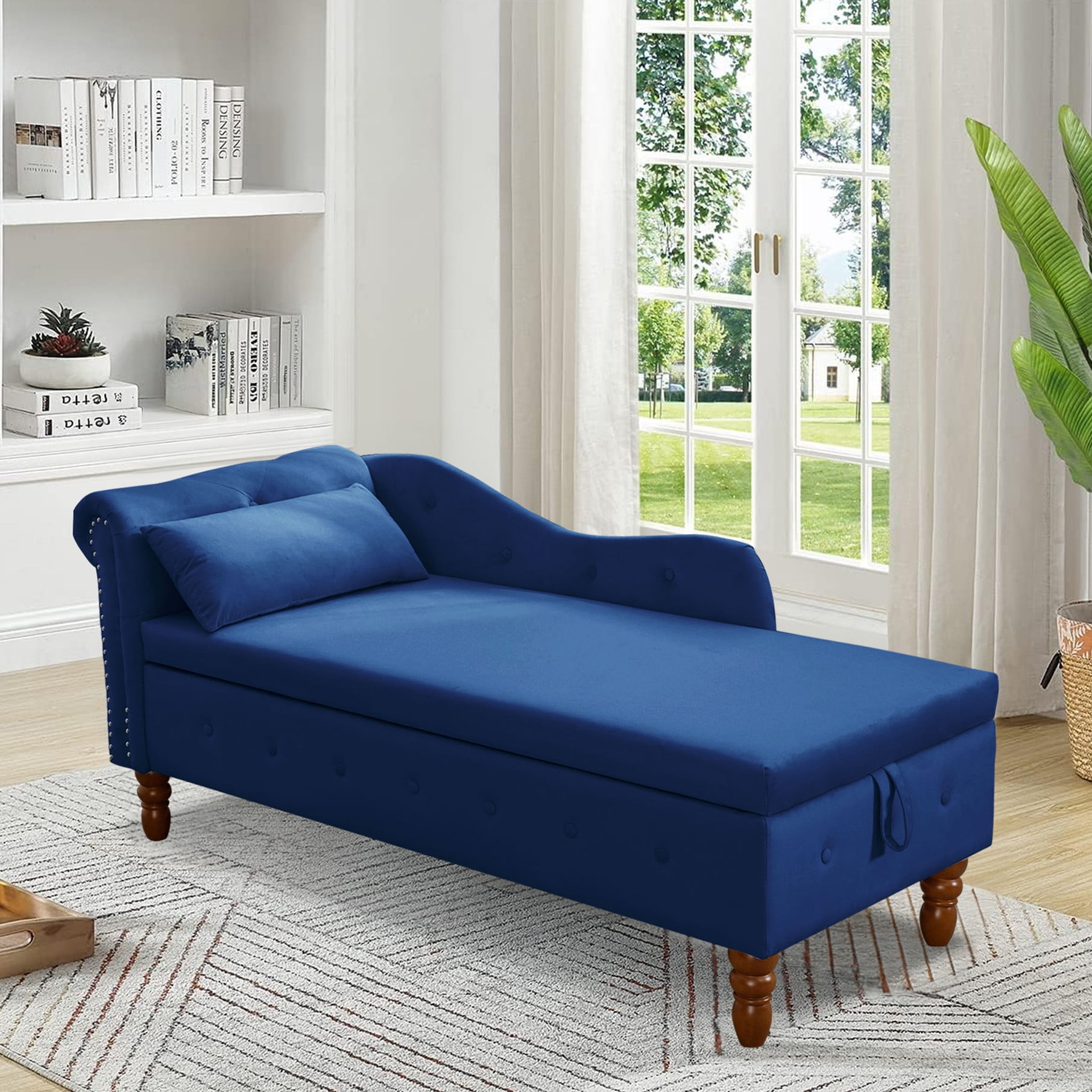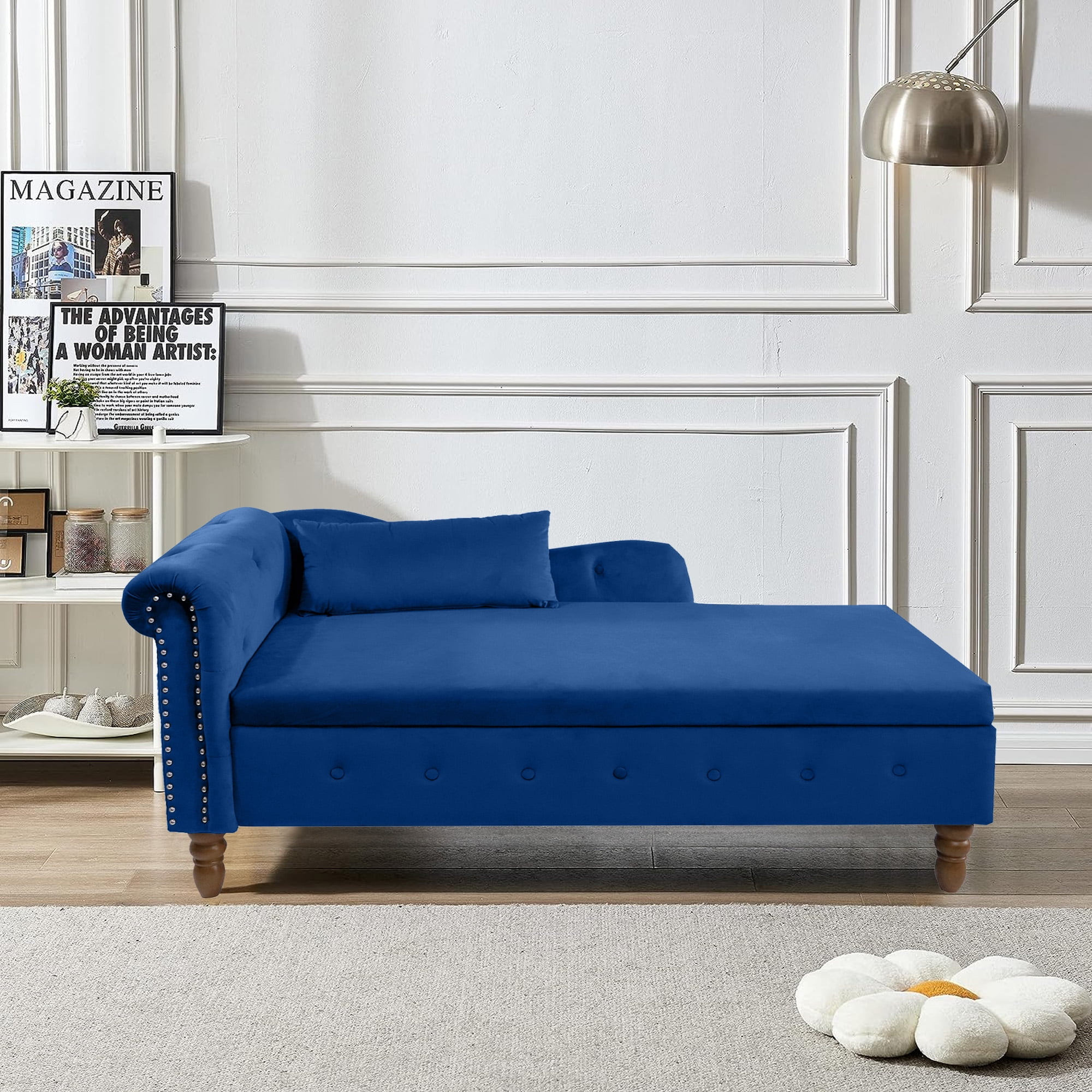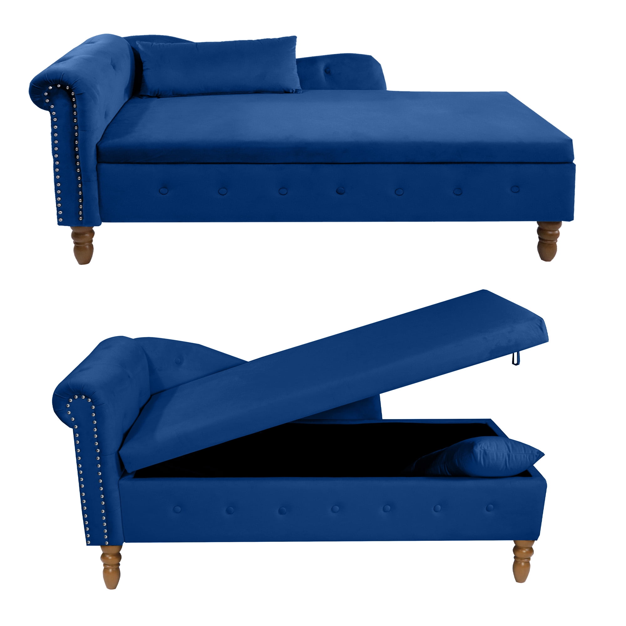 This AK-FC05-005 left-arm chaise lounge chair gives you another spot to relax and a place to store bulkier items.Add a touch of elegance to your home with the Aukfa living room Storage Chaise Lounge. This storage chaise lounge chair indoor features a sturdy wood frame with foam padding and a scrolled seat back, all adorned with button tufting and nailhead trim. Lift the hinged seat to reveal a hidden storage compartment, perfect for keeping your living space tidy. Keep your larger quilts, blankets, and throws in the lift-up storage compartment: Raise the entire seat to reveal the storage space. A toss pillow is also included with this chaise.Available in blue,pink,black,gray or beige velvet upholstery, this chaise lounge is the perfect addition to any transitional-style room.