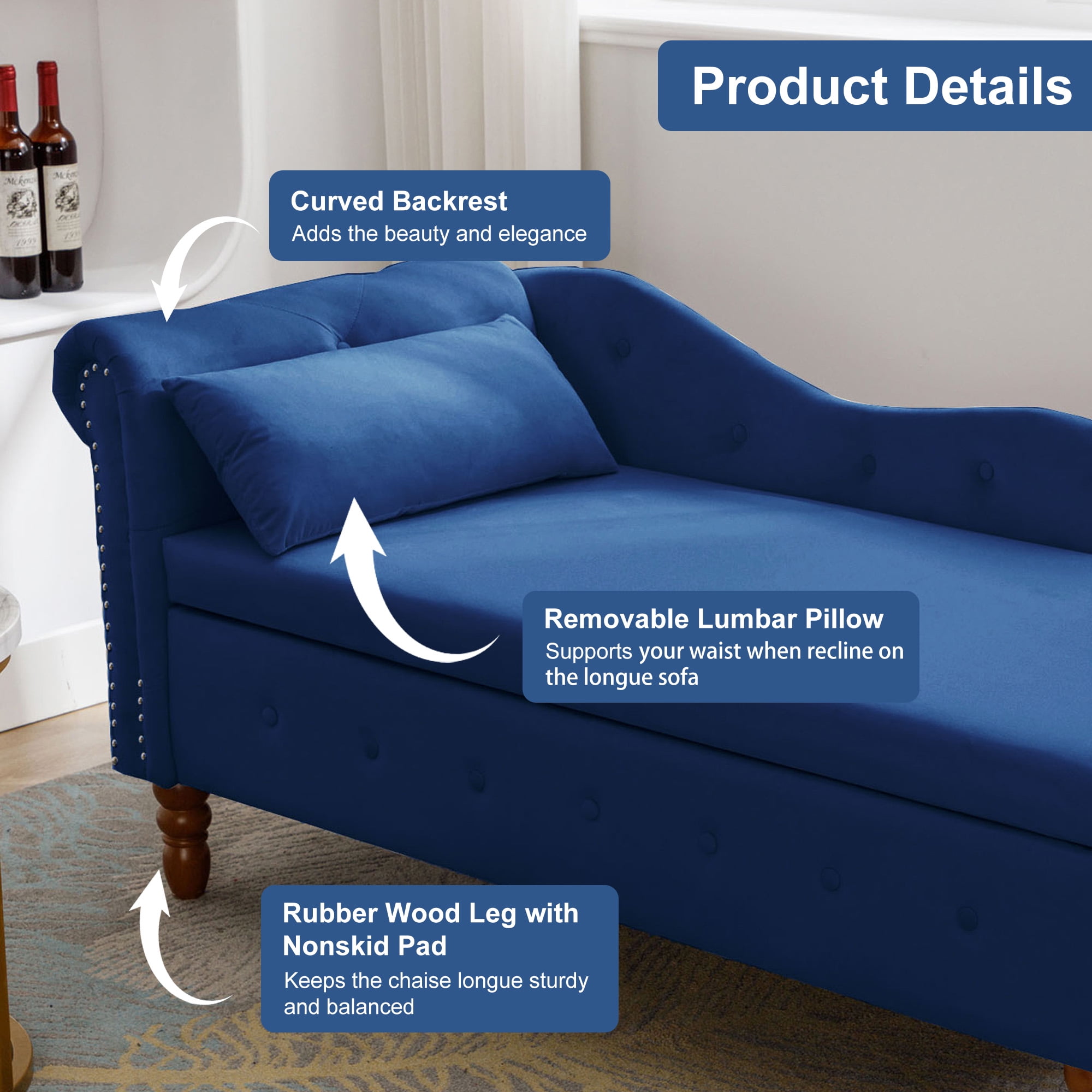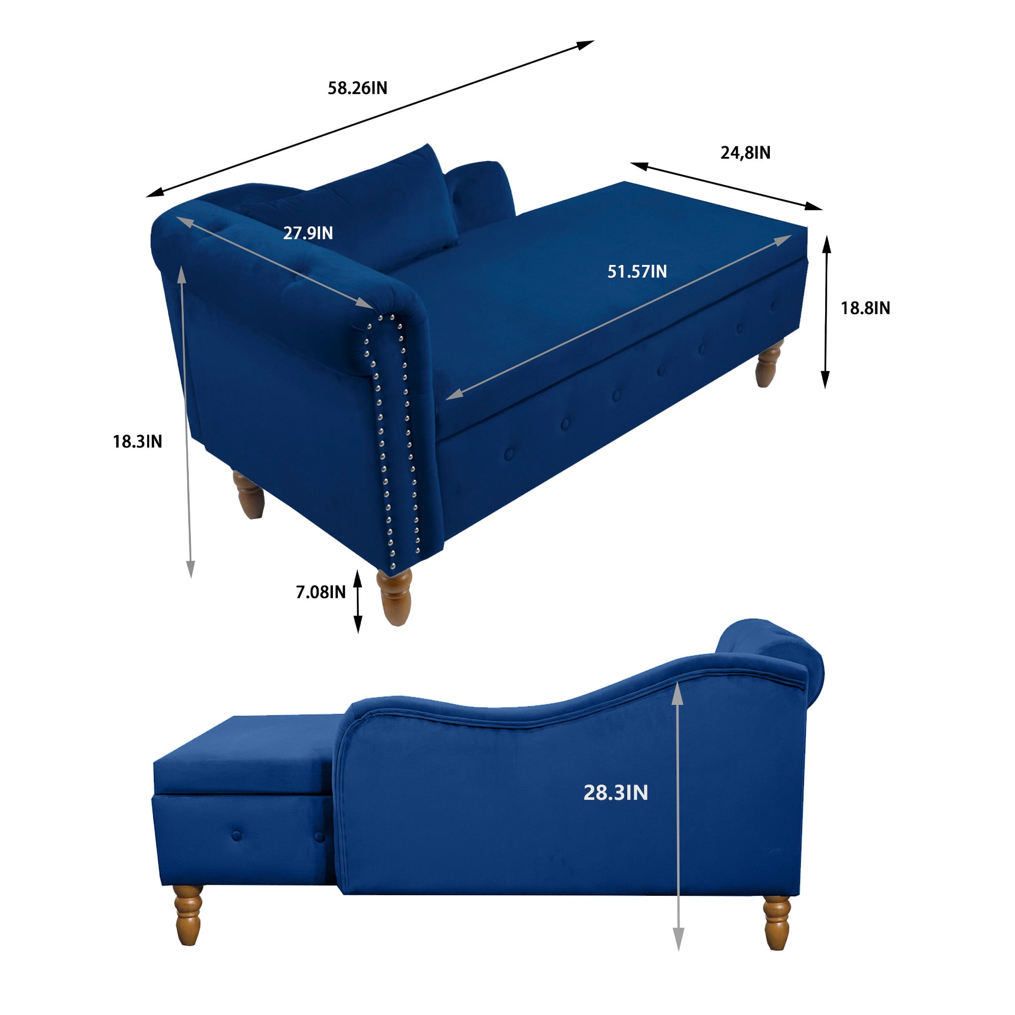 ELEGANT APPEARANCE – ThisAK-FC05-005 elegant and classic chaise lounge indoor, with tufted button exterior, design with perfectly curved armrests. This recliner chairs for adults as well as for children. This chaise lounge chair can also be used as a chaise lounge couch for indoors, give you comfort while reading, chatting and relaxing. CONVENIENCE STORAGE – Chaise lounge chair with storage, a hidden storage space under the seat. Internal storage dimensions: 48.43”L x 21.65”W x 5.91”H. This indoor chaise lounge has handles and hinges on the inside, can be easily opened and fixed at a certain height. You can put some magazines, books, shoes and baby toys. COMFY CHAISE LOUNGE -This chaise lounge indoor bedroom features a velvet-upholstered back and throw pillow, a soft cushion with high quality high-density foam. The ergonomic design of the chaise lounges, creates the perfect seating experience. You can sit or lie on this chaise lounge and rest your hand on the side armrest without feeling tired all day. DURABLE AND RELIABLE -This lounge sofa with a wooden construction and base with attractive sutures, provides excellent quality. Solid wood legs with rubber pads are durable. Weight Capacity: 500 lbs. The legs are 5.51 inches high for easy cleaning, and the robot can pass freely. This indoor chaise lounge is perfect for living room chairs or sleeper chair indoor bedroom. EASY TO ASSEMBLE -This modern chaise lounge follows our instructions and is easy to assemble. All the accessories are placed in the chaise lounge’s storage space, and simple instructions help you assemble quickly and easily. Chaise lounge Chair Overall dimensions: 58.26″L x27.9″W x 28.3″H PRODUCT INFORMATION: Overall: 67” W x 12” D x 20” H Overall Product Weight: 55LBS Features: Product Type: FarmhouseTV Stand; Sideboard,Console Table Color: Blue/Pink/Black/Gray/Beige Pattern: Solid Color Frame Material: Solid + Manufactured Wood Leg Material: Wood Removable Cushions: Yes Arms Included: Yes Number of Arms: One Arm Arm Type: Recessed Arms Orientation: Left-Arm Chaise Storage Included: Yes Seat construction: Sinuous Springs Seat Fill Material: Foam Tufted: Yes Toss Pillows Included: Yes Number of Toss Pillows: 1 Seating capacity: 1 Product Care: Spot clean by wiping with a clean cloth. Foam Density:1.9lbs./cu.ft. Weight Capacity: 300 LBS Removable Components: Legs Leg Color / Finish: Walnut Assembly: Assembly Required: Yes Level of Assembly: Full Assembly Needed Installation Required: Yes Warranty: Commercial Warranty: Yes Product Warranty: Yes Warranty Length: 12 Months Warranty Full or Limited Warranty: Full PACKAGE INFORMATION: 1 x Storage Chaise Lounge Chair 1 x User Manual:AK_AK-POS1FV1005-B0_PUM_FX-091423
