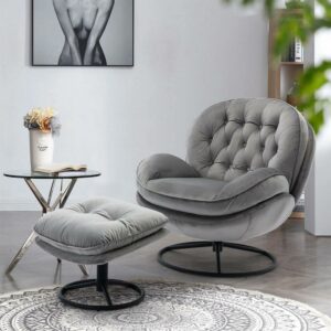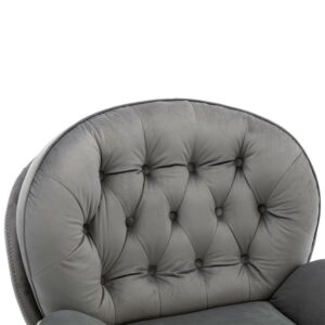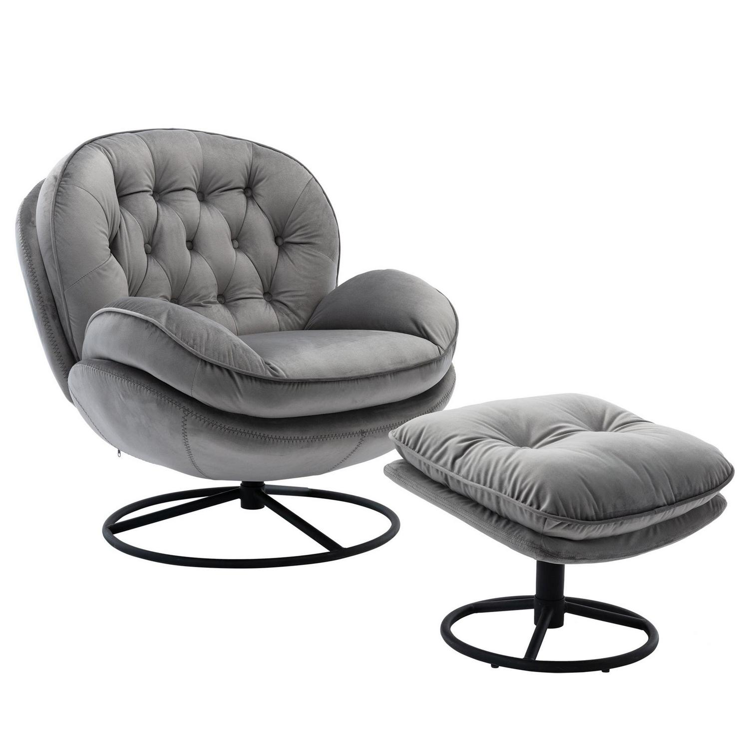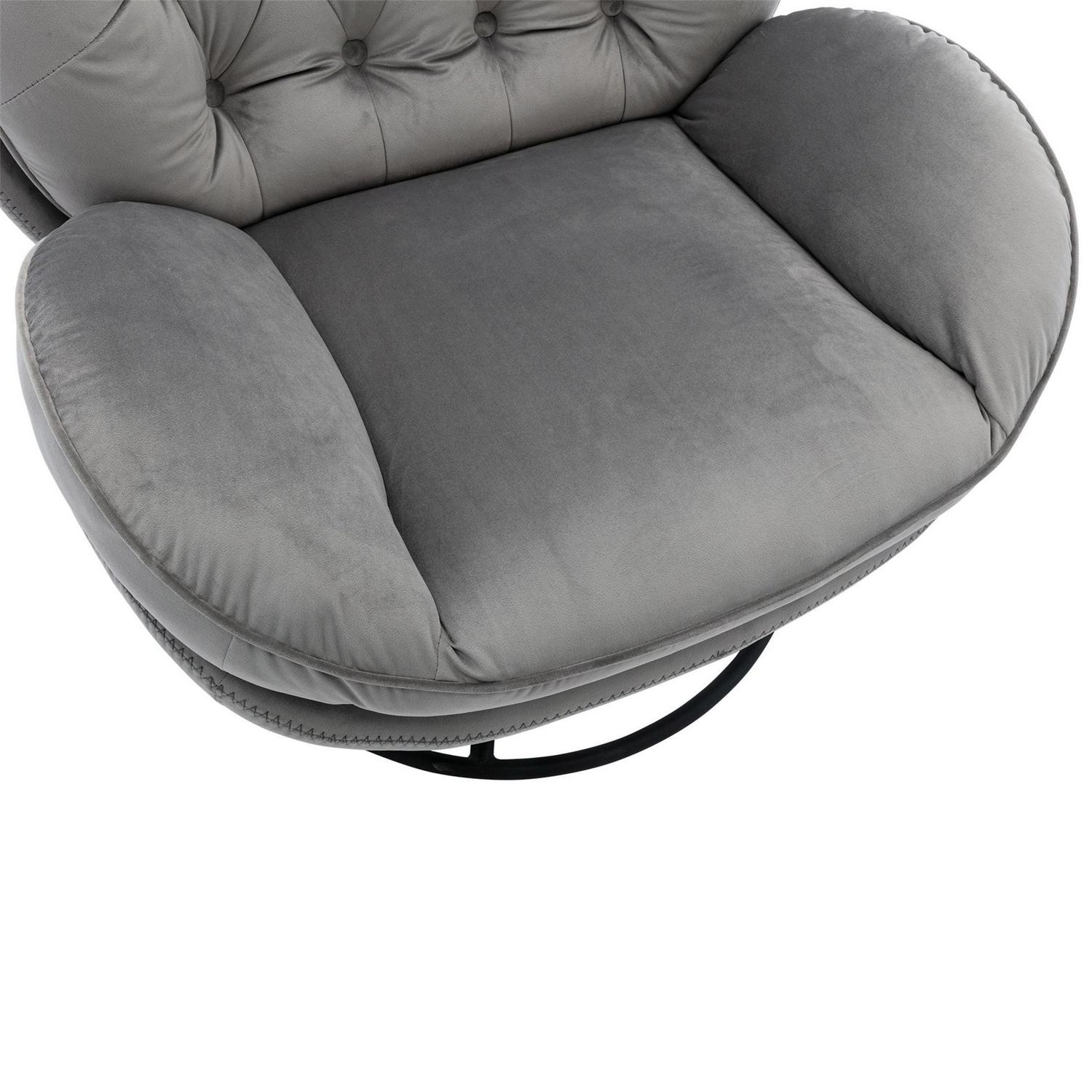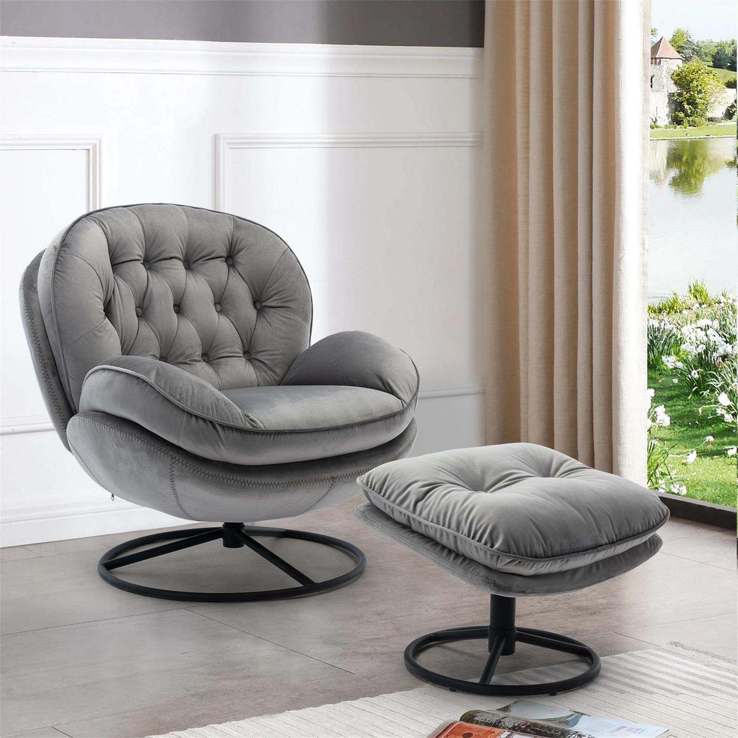 Aukfa Swivel Accent Chair with Ottoman- Tufted Back- Modern Velvet Recliner Reading Chair for Living Room Bedroom- Gray