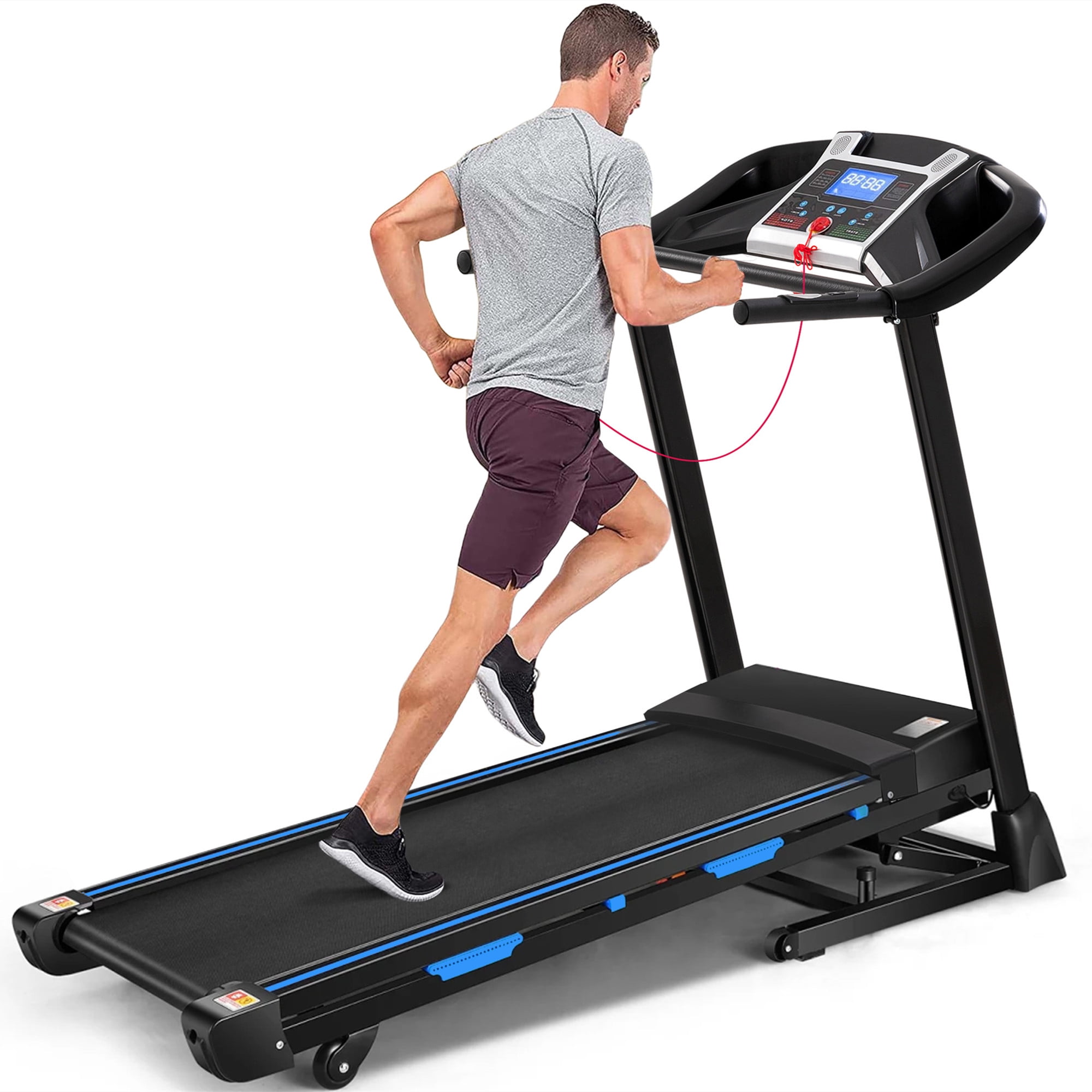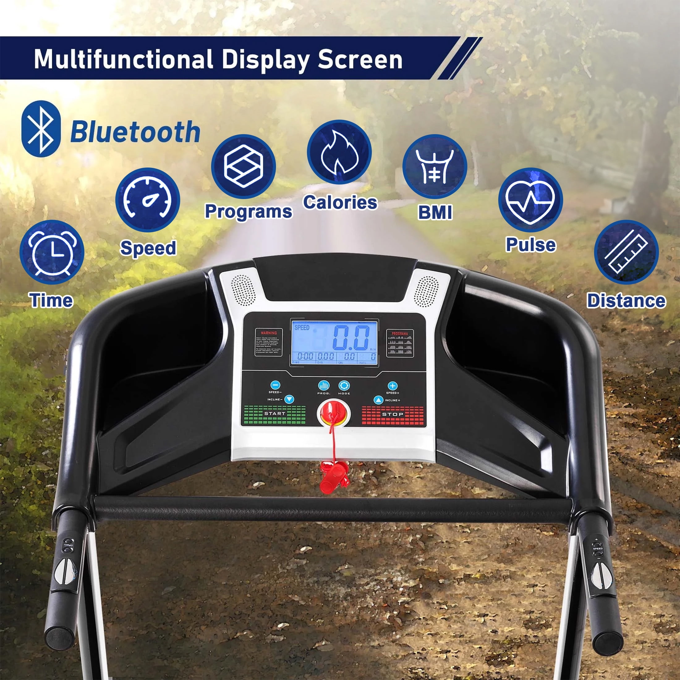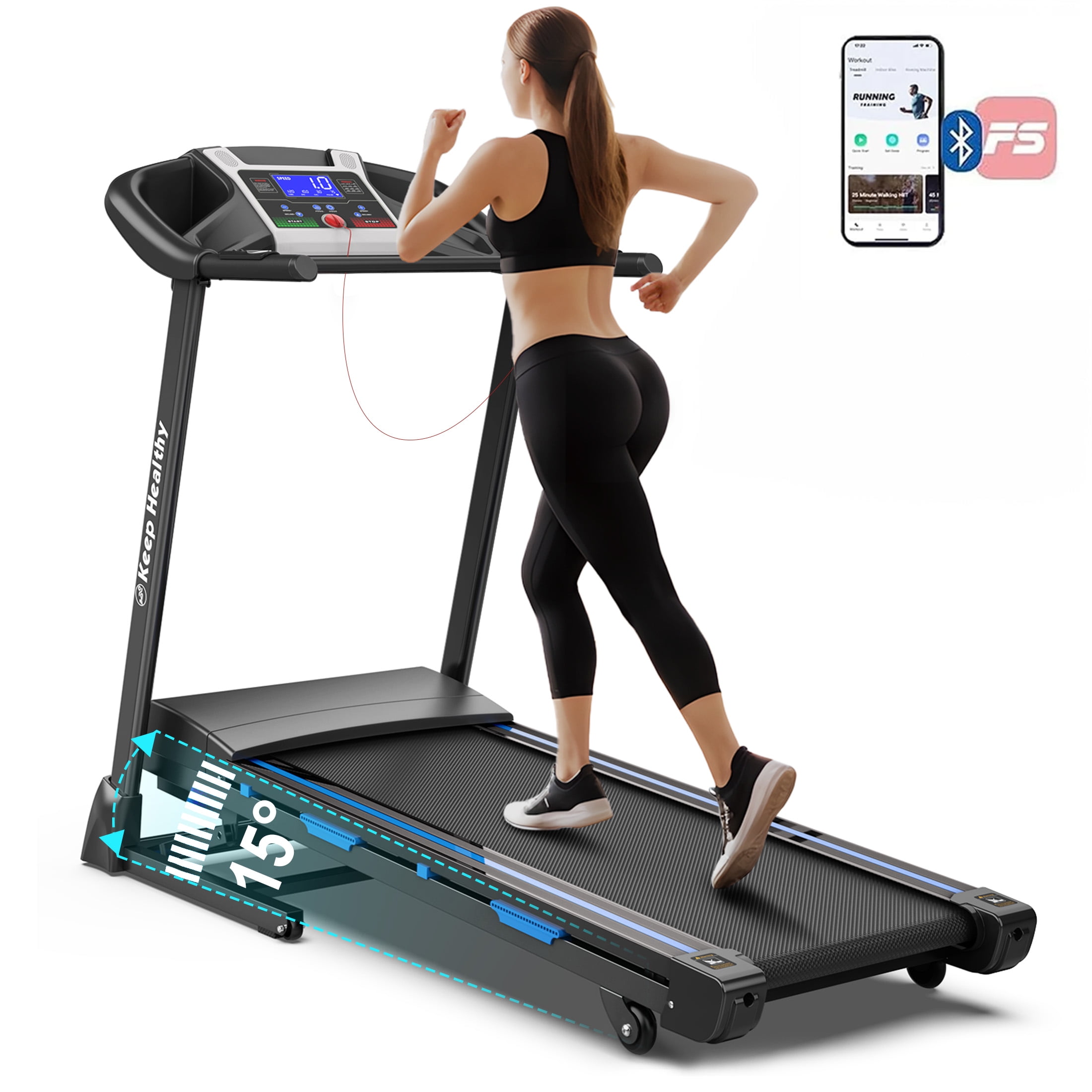 QUIET TREADMILL FOR HOME WORKOUT – Use Aukfa AK-SF02-012 auto incline treadmill, Enjoy a quiet workout with a powerful 3.25 HP motor perfect for walking, jogging and running in the comfort of your own home, with speed ranging between 0.5-9 MPH. 330 lb Weight Capacity. ADJUSTABLE AUTO INCLINE – 15 levels of incline: 0% to 15% auto incline for a fully optimized workout that meets your goals. More incline for treadmill, more calories burn. Embrace the power, convenience, and versatility this treadmill offers and achieve your fitness goals in the comfort of your own home. Invest in your health and wellness today with our top-of-the-line treadmill. FITNESS TRACKING LCD DISPLAY TREADMILL – Keeping track of your progress is essential for reaching your fitness goals. Our treadmill features a user-friendly LCD display that shows key workout metrics such as time, distance, speed, incline, and calories burned. Stay motivated and challenged by monitoring your achievements and pushing yourself to new limits. WIDENED DOUBLE SHOCK-ABSORBING DECK – We understand the importance of comfort during exercise, which is why our treadmill is equipped with a 17″ spacious running surface. With ample room to stride comfortably, you can maintain a natural gait and reduce the risk of injury. The cushioned deck absorbs impact, providing joint-friendly support, and reducing stress on your knees and joints. BLUETOOTH & ENJOY – Open Bluetooth, match the cardio machine, then enjoy music. The built-in speaker brings more fun to your fitness experience. Doing exercise at home is no longer a boring thing when running on this machine. POWERFUL VACUUM MOTOR AND SAFETY EMERGENCY STOP KEY – Premium vacuum motor reduces noise while you run indoors while the safeguard emergency stop key keeps you in control at all times, stopping the treadmill when pulled for your safety. EASY ASSEMBLY RUNNING MACHINE – The machine comes fully assembled, simply unfold it and tighten the screws – each treadmill comes with all required tools and instructions. SPECIFICATION: PRODUCT INFORMAITON Assembled Size: 62.2” L x 22.2” W x 48.8” H Folded Size: 52.3”H x 25.5” W Overall Product Weight: 105.6 lb Max. User Weight: 330 lb Motor power: 3.25 HP Speed: 0.5-9 MPH Training Programs: 12 Running Area/ Tread Belt: 46.4”L x 17” W Power Supply: 110 V Package Dimension: 66″L x 30.9″W x 11.4″H; 114.5 lb Features Product Type: Motorized treadmill Material Frame: Steel Panel; Plastic Color: Black & Blue Foldable: Yes Transportation Rollers: Yes Auto Incline: 15% Auto Incline Cup Holders: Yes Built-in Bluetooth: Yes APP FITSHOW: Yes LCD Display: Yes Display: Time, Calorie, Speed, Distance and Step Package List: Treadmill, Belt Lubricant, Hardware Kit, User Manual Supplier Intended and Approved Use: Residential Use Assembly Level of Assembly: Partial assembly Adult Assembly Required: Yes Suggested Number of People for Assembly/Install: 1 Additional Tools Required (Not Included): All Tools Included Warranty Product Warranty: Yes Full or Limited Warranty: Limited Warranty Length: One Year PACKAGE INFORMATION: 1 x Treadmill 1 x User Manual: AK_AK-SF02M09012-B0_PUM_NS-090523