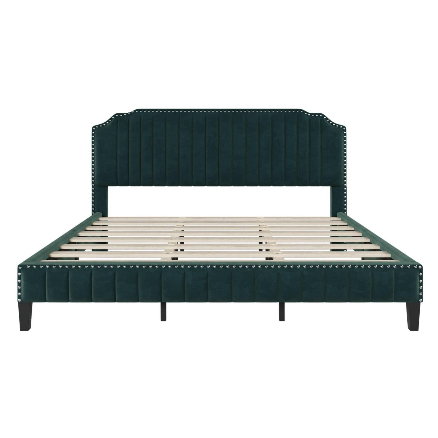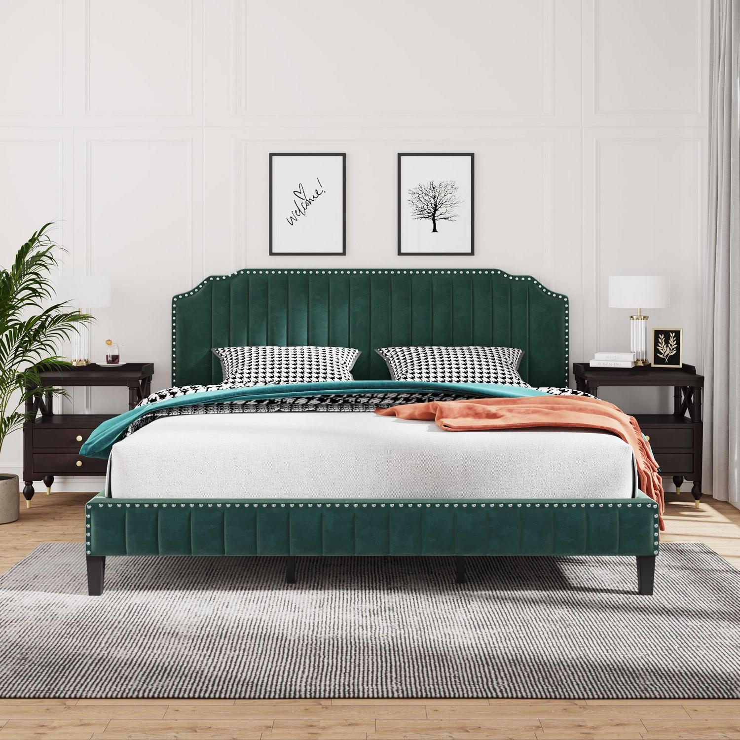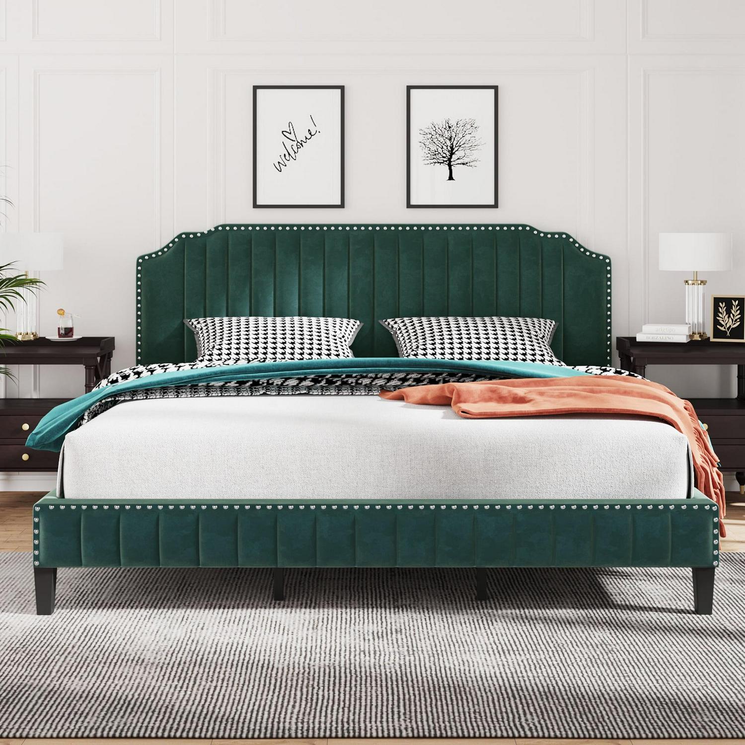 Aukfa Upholstered King Bed, Top Nail Trim Velvet Upholstered Platform Bed, Green