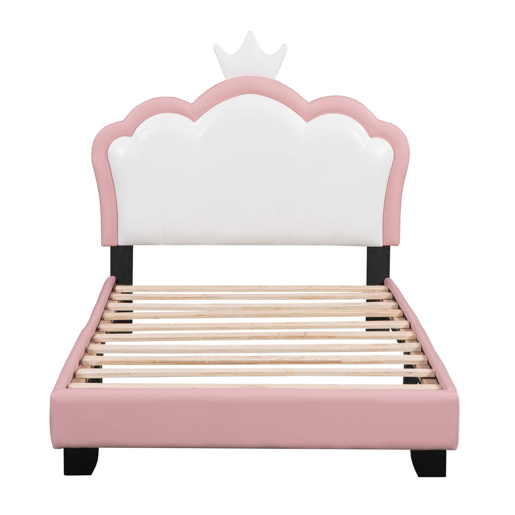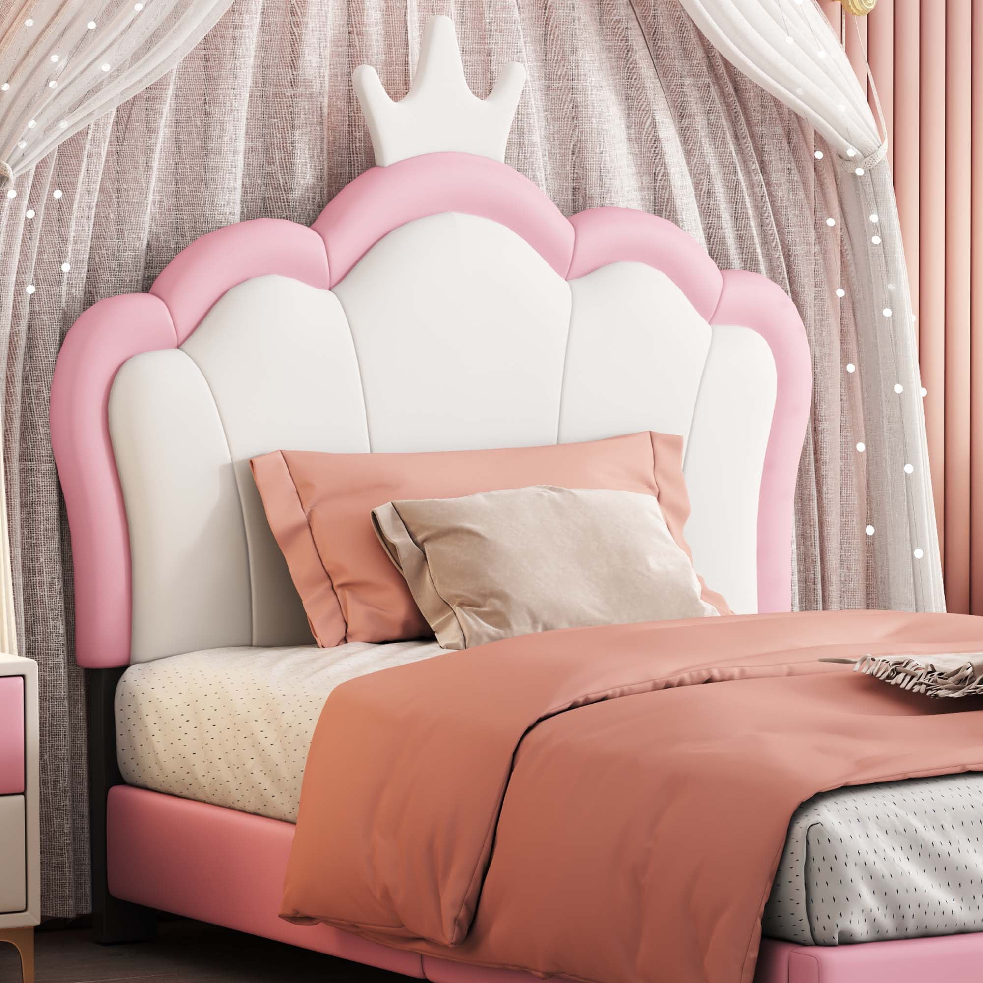 Aukfa Cartoon Kids Twin PU Leather Standard Beds, White/Pink
