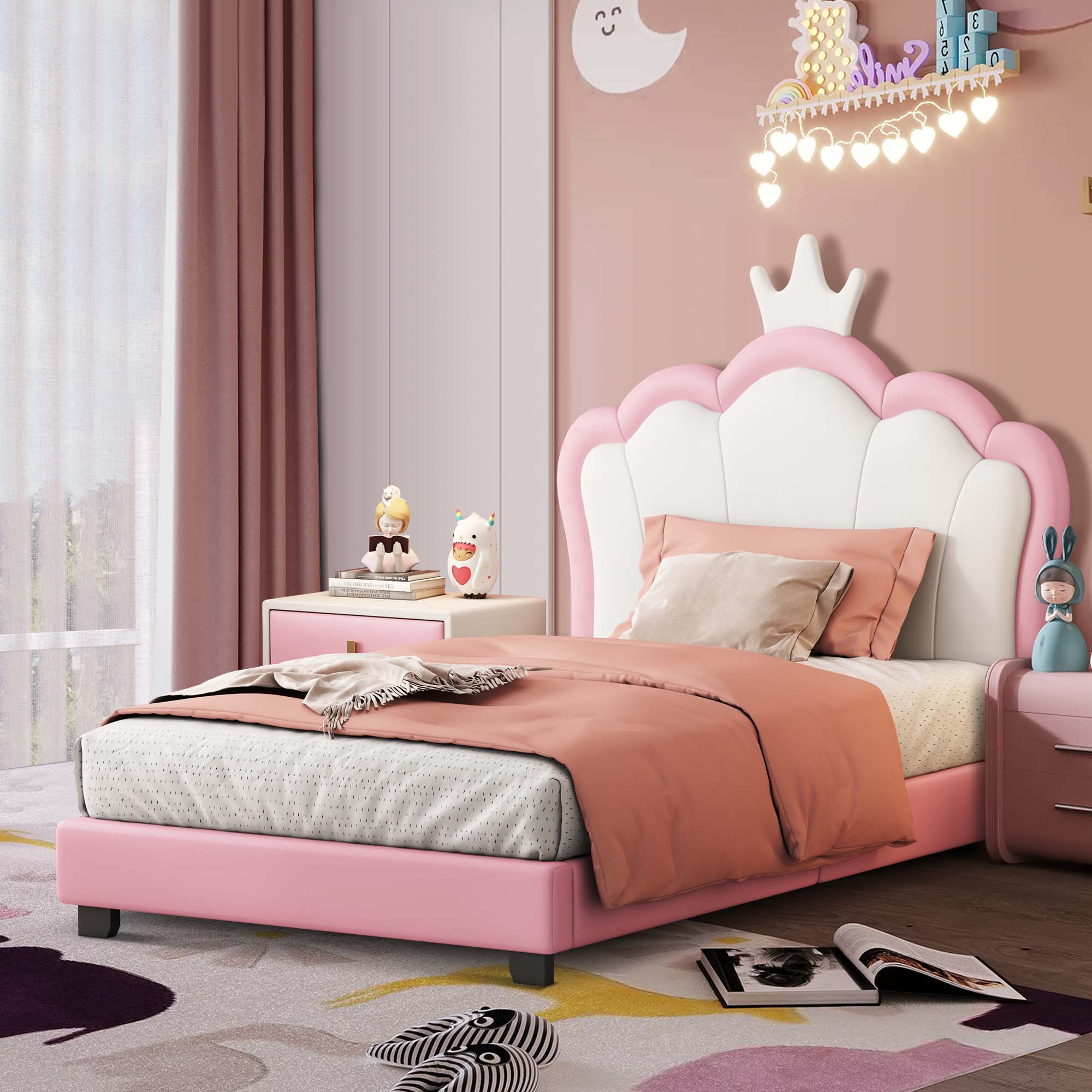 This Aukfa AK-FUB1-033 PU leather upholstered bed with Princess Crown ornament headboard bursts with character, and girlish charm, boasting enchanting crown on the headboard. Fully upholstered in faux leather with a sturdy and durable hardwood frame, this upholstered twin bed creates a cozy, magical, and safe sleep space for the little ones in your life. It’s a super-cool place where she can nap, sleep or catch up on her favorite show. It will be an attractive and appealing kids’ Princess bed to let your little girls play and sleep in sweet dream.