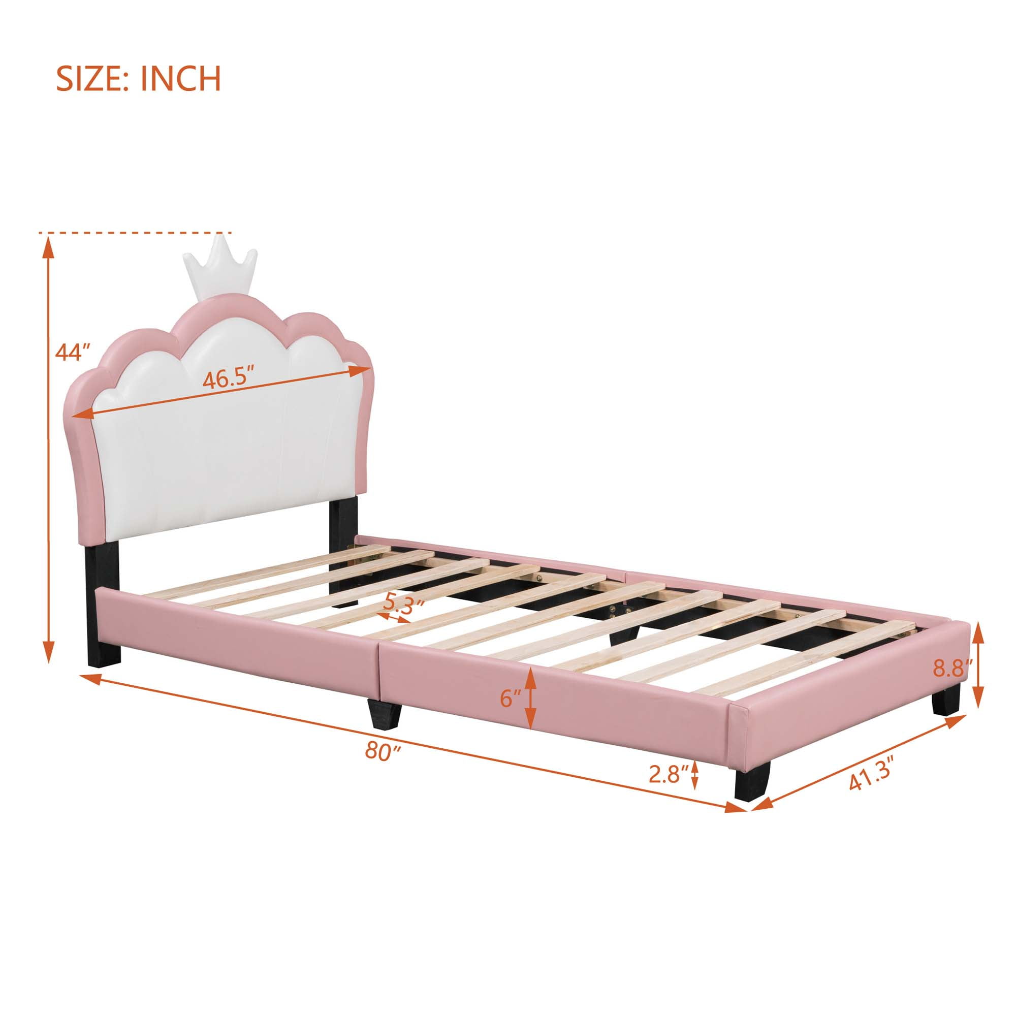Features Princess Crown HEADBOARD DESIGN – this Aukfa AK-FUB1-033 PU leather upholstered platform bed decorated with crown ornament touch, it’s an ideal bed for your lovely little one. The headboard in the shape of cartoon Princess Crown provides you with a soft backrest which is cute and practical. Any child will be thrilled to have this upholstered Princess bed. Surprise your little one with this beautiful gift. SOLID CONSTRUCTION – Made of high-quality pine wood, the twin bed frame is not easy to be affected by humidity change and lead to crack. The strong legs, wide boards and 10 slats for bed not only improve the weight capacity of the bed greatly but also ensure the stability. Weight capacity 250LBS. LOW PROFILE DESIGN – Low-profile platform beds add a laid-back touch to any space, help your little one get in and out of bed easily. Generous padding ensures long-lasting comfort and support while sitting up to read or watch TV. NO BOX SPRING IS REQUIRED – This twin size cartoon upholstered bed comes with many wooden slats, PU leather upholstered bed can stay firm and quiet while sleeping. Slats kit is included so you won’t need a box spring. Mattress is not included. EASY ASSEMBLY – All the instructions and hardware required for the assembly of this kids’ twin bed frame are included, the upholstered bed is easy to assemble without taking too much time. Two people are recommended when assembling this frame. If there are missing accessories, please tell us for the replacement. Weights & Dimensions Overall Product Dimension: 80″L X 46.5″W X 44″H Headboard Height: 44” Footboard Height: 8.8” Clearance from Floor to Underside of Bed: 2.8″ H Overall Product Weight: 63 lbs Number of Packages: 1 Specifications Product Type: Upholstered Platform Bed with Princess Crown Headboard Size: Twin Color: White/Pink Bed Type: Panel Bed Style: Princess, Kids Frame Material: Pine Wood, Plywood Upholstered Material: PU Leather Box Spring Required: No Number of Slats Included: 10 Legs: Yes Center Support Legs: No Weight Capacity: 250lbs Recommended Mattress Thickness: 6” Headboard Included: Yes Finished Back: Yes Footboard Included: No Bed Storage Included: No Drawers: No Compatible with Adjustable Bed: No Natural Variation Type: No Natural Variation Supplier Intended and Approved Use: Residential Use Care and Cleaning: Only mild, water-free cleaning solvents should be used. Country of Origin: Viet Nam Package Information 1 X Package 1 X Upholstered Bed Frame 1 x Allen Key 1 x User Manual :AK_AK-HB15FF1007-PK0_PUM_VY-070623 Notice Manual measurement has been used, there may be some reasonable error. Items may slightly differ from photo in terms of color due to the lighting or your monitor’s display.