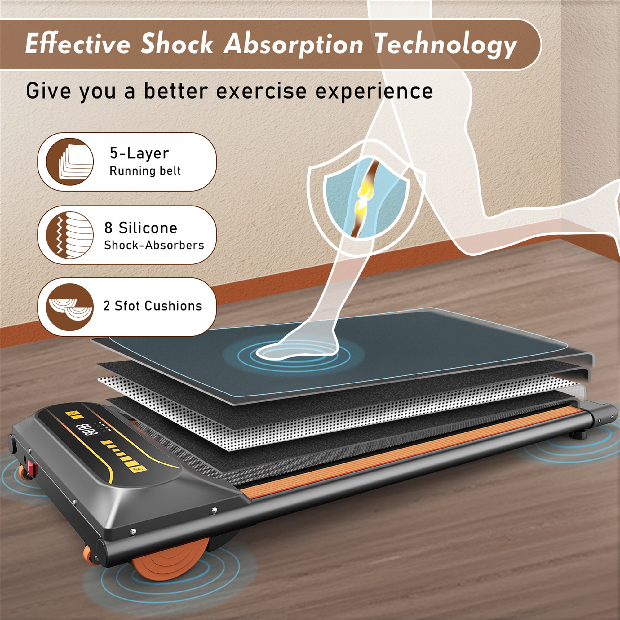 UNDER DESK TREADMILL – Restricted by the weather from running outdoors? Or maybe there’s too little space in your home to exercise? Not want to work out at a communal gym either? Stay active and fit while working with our state-of-the-art AK-FS02-010 under desk treadmill, Designed for individuals who spend long hours sitting at a desk, this innovative fitness solution seamlessly integrates exercise into your daily routine, which is convenient to keep exercising while working. QUIET & POWERFUL MOTOR – Equipped with a 2.25 HP quiet motor, adjustment speed range of 0.5-4 mph, and features a dual shock absorbing system with a noise level of less than 50 dB, like a pet running around the house, which allows you to work out at home or in the office anytime. This electric treadmill for home office use is suitable for use with a maximum weight of up to 265 lb. SLIM WALKING PAD – Our treadmill is only 46.01″ x 20.05″ x 5.39” in size, fitting easily under your office desk and convenient for storage under a bed or sofa. CONVENIENT – This under desk treadmill arrives fully assembled and exercises directly after unboxing. Great for those who have difficulty assembling products, clear instructions also make it easy to teach you how to use this treadmill. DIGITAL MONITOR – Measure your calories burned, speed, time and distance on large display. You can pause the walking pad at any time, he will save your running data very conveniently, and keep you informed of your exercise. Sport makes life better. 12 PROGRAM & REMOTE CONTROL – The remote control is convenient to adjust the speed while you were running, and stop instantly. There are 12 programs available for you to choose, and these easy-to-use exercise programs help to improve your cardiovascular fitness, boost your health, and burn fat. SPECIFICATION: PRODUCT INFORMAITON Assembled Size: 46.01″ L x 20.05″ W x 5.39” H Overall Product Weight: 30 lb Max. User Weight: 265 lb Motor power: 2.25 HP Speed: 0.5-4 MPH Training Programs: 12 Running Area/ Tread Belt: 38.18”L x 14.17” W Power Supply: 110 V Package Dimension: 47″L x 22″W x 6.2″H; 37 lb Features Product Type: Under Desk Treadmill Material Frame: Steel Panel; Plastic Remote Control: Yes Color: Black&Orange Transportation Rollers: Yes Display: Time, Calorie, Speed, Distance and Step Package List: Treadmill, Belt Lubricant, Hardware Kit, User Manual Supplier Intended and Approved Use: Residential Use Assembly Assembly Required: No Warranty Product Warranty: Yes Full or Limited Warranty: Limited Warranty Length: One Year