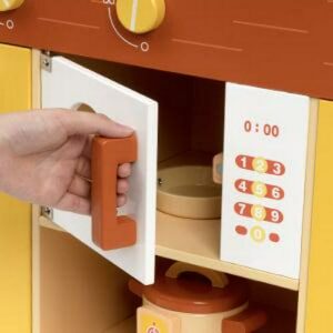 – MULTIPLE ACCESSORIES – Equipped with stove, sink, microwave oven,pot, seasoning bottles, kitchen wooden knife,alarm clock, a pan, spatula and a Kettle etc.All-in-one kids play set can realize kids chef dream.