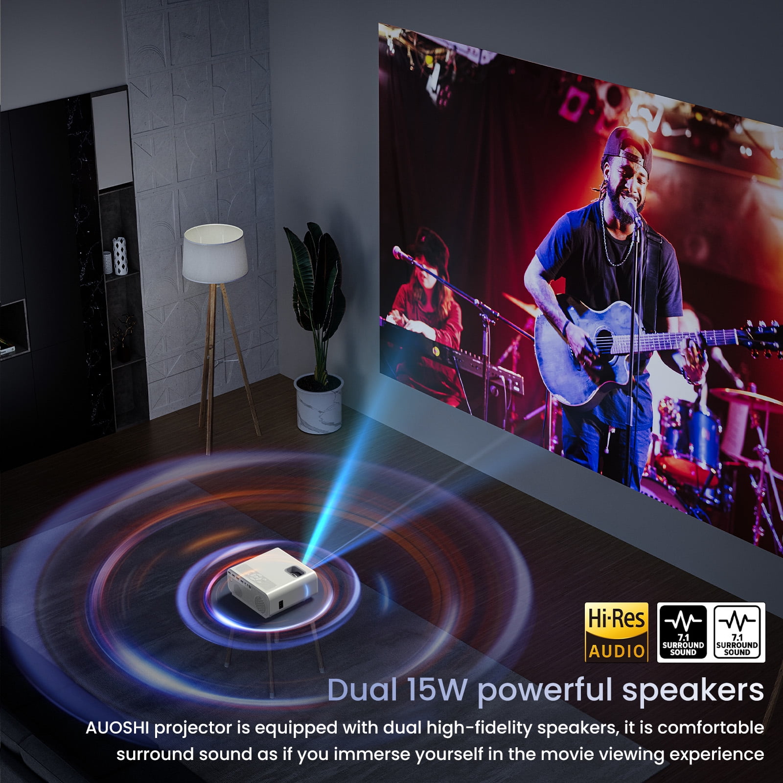 AUOSHI Portable Mini Projector Great for movie night, garden parties, outdoor camping, 5G WiFi 5.1 Bluetooth transmission, Native 1080P 4K support, Built-in Stereo Speaker, Advanced cooling system with lower noise, sleep timer, Eye protection, Compatible with TV Stick, Phone, PS5, Laptop, Tablet, HDMI, USB SPECIFICATIONS: Type: Mini Portable Projector with Bluetooth and WiFi Brand: AUOSHI Model:F1 Imaging Technology: LCD Native Resolution: 1920 x 1080P Supported Resolution: 1920 x 1080P Brightness: 240ANSI Contrast Ratio: 10,000:1 Keystone Correction: 15 Projection Distance: 4.9ft – 14.7ft Projection Size: 50-200inches LED Lamp Life: 50,000Hours Input: HDMI*2/USB*2/AV*1 Output: 3.5mm Audio Aspect Ratio: 16:9/4:3 WHAT’S IN THE PACKAGE: 1 x F1 Projector 1 x HDMI Cable 1 x 2.4+5G Wireless Remote Control 1 x AV Cable 1 x Power Cable 1 x User Manual