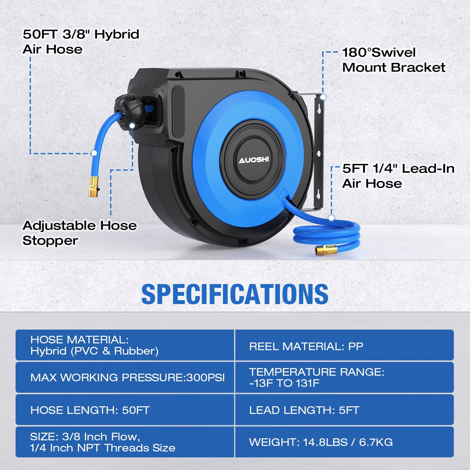 Product Description Retractable air hose reel AUOSHI automatic rewind air hose reel is a multifunctional tool for garages or workshops. Lock the hose in the desired position to ensure that it does not slip. Automatic retraction: With just a gentle pull, the reel will smoothly retract the hose. Specifications Item Model Number: ZYA016-Q10D Hose Length: 50ft Leads: 5ft Hose ID: 3/8 Inch Shell Material: PP Hose Material: PVC Max Hose Working Pressure: 300 psi Hose Threads: 1/4″ NPT Copper Joint Temperature Range: -4°-131°F Net Weight: 14.7 lbs / 6.7 kg