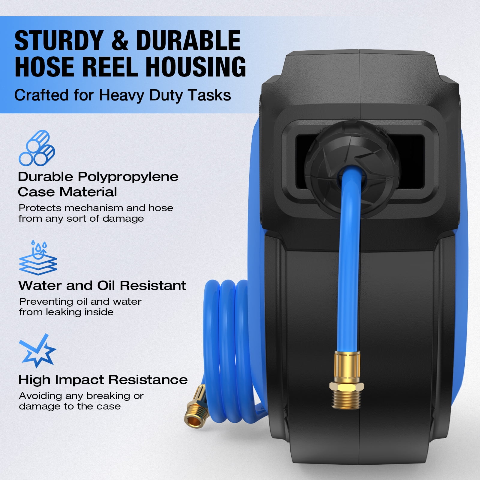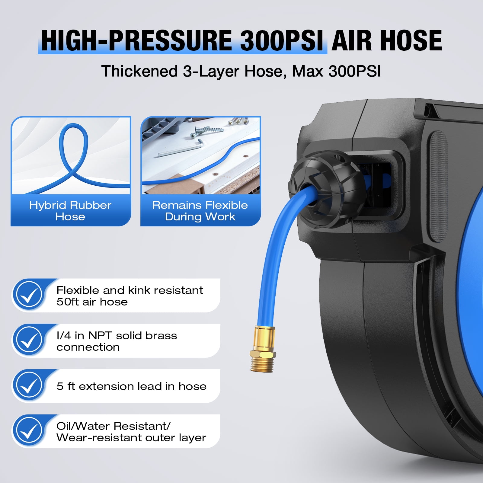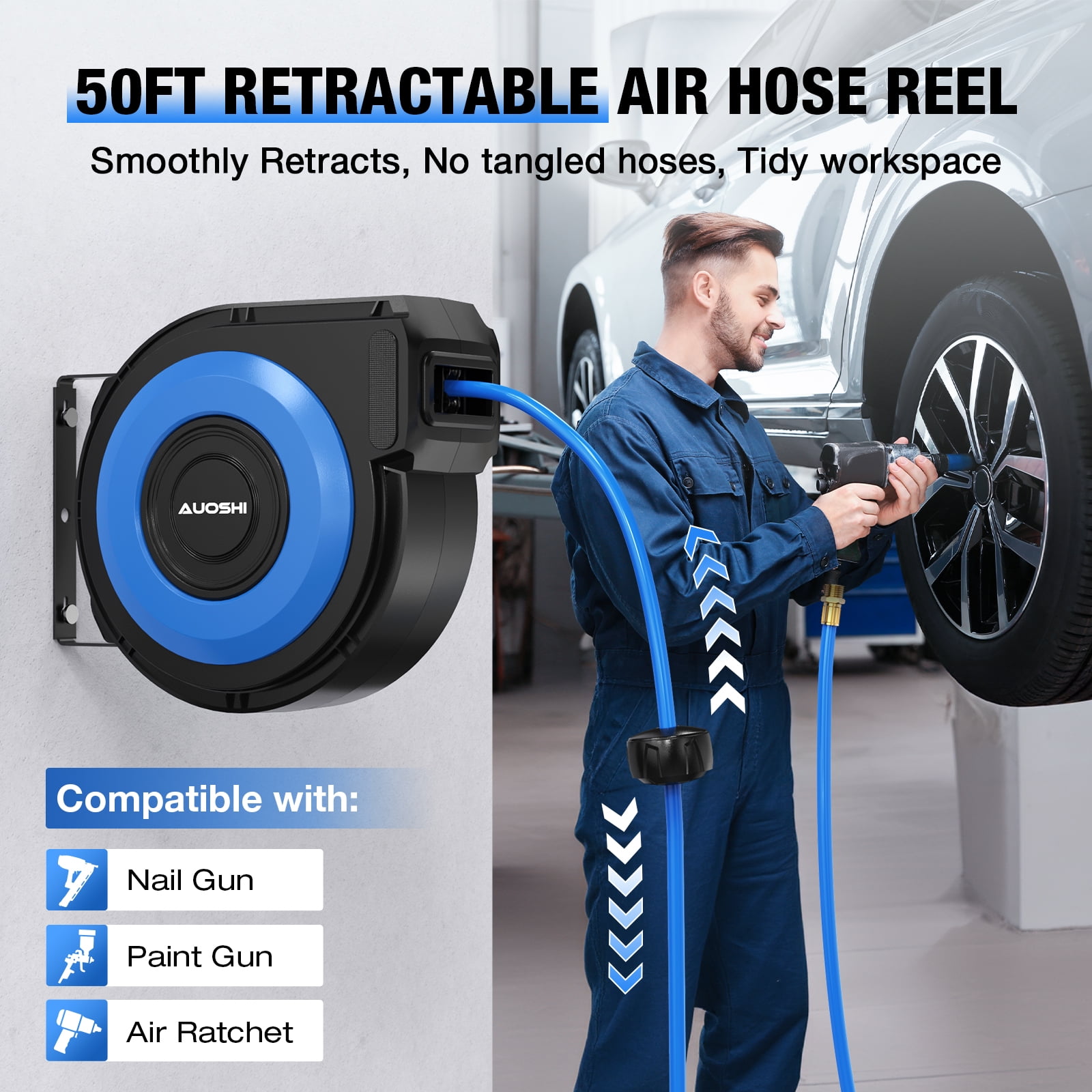 【Premium Retractable Air Hose】 AUOSHI air hose with a 50 + 5ft oil and abrasion-resistant air hose that offers all-weather flexibility with a temperature range from -13 to 131 ℉, making it ideal for year-round use, including cold winters. 【Automatic Rewind】Simply give the air hose a gentle tug, and the air compressor hose reel will retract effortlessly, eliminating tangled hoses. 【Hose Guide & Lock】Lock the hose at any desired length with ease. Two non-snag rollers guide the hose, minimizing abrasion and wear while preventing kinks and tangles under pressure. 【Durable & Sturdy – Solid Brass Fitting】Built with professional-grade all-steel construction and brass fittings, featuring a corrosion-resistant powder coat finish for exceptional durability, ensuring years of reliable service.