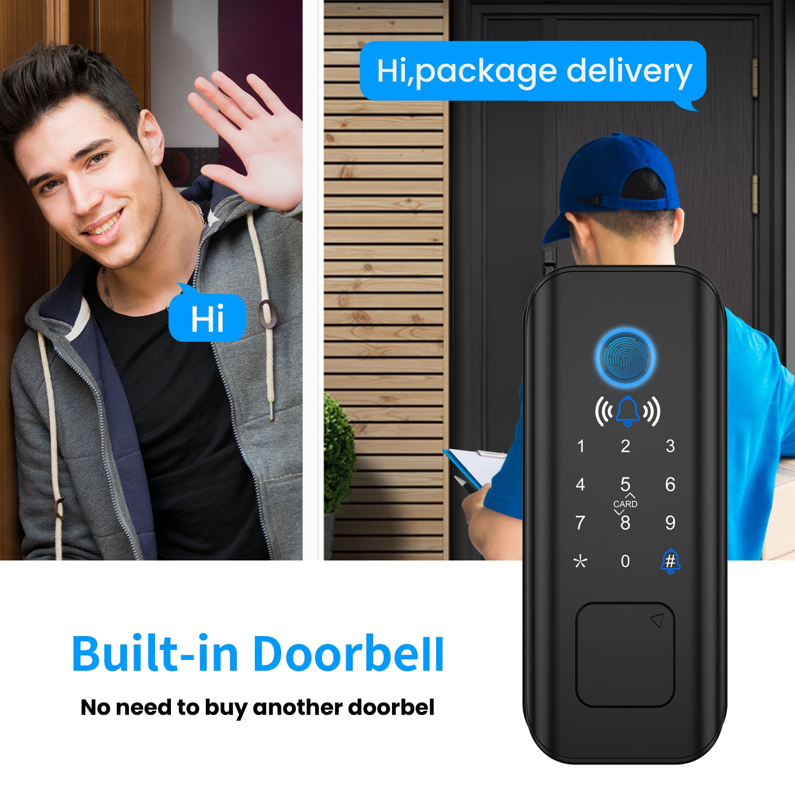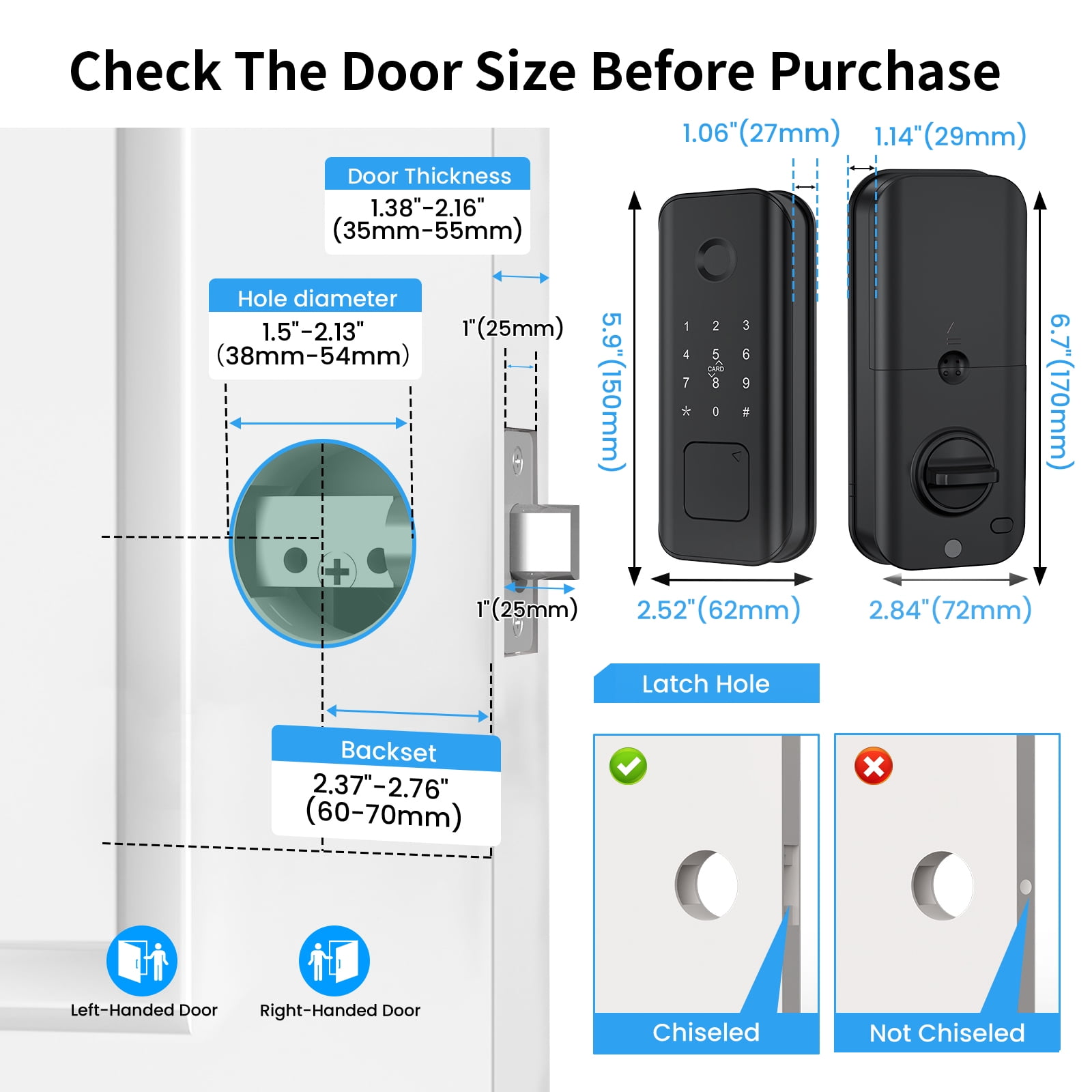 Get access to your door in 1s! Our cutting-edgebiometric fingerprint tech identifies your fingerprint in just 0.3 s, boasting a 99.99% accuracy rate. You can set up to 200 unlocking fingerprints. Features durable matte material, and will not leave fingerprint marks.. The numbers keypad illuminates upon touch, easy code entry in the dark. The anti-peeping function allows you to enhance security by adding extra digits before or after your code, and the AUOSHI electronic door lock will still unlock. AUOSHI keypad lock provides up to 100 access codes for family members. You can also use the App create one-time codes and schedule access windows for guests or another person. These one-time PIN codes are automatically deleted after use, ensuring maximum security. Just touch the IC card to the smart lock’s keypad to instantly unlock it. Quick, easy, and convenient. AUOSHI smart lock comes with two spare mechanical keys for emergency use in case of power depletion. With an automatic locking function that engages after entry or exit. By default, the system initiates a 5-second countdown after unlocking. You can also customize the automatic locking interval, setting it anywhere between 8 to 69 seconds. Quickly lock/unlock with a 1s turn of the knob from inside. Activate deadlock mode by holding the inside on/off button for 2s; In this mode, the lock cannot be unlocked even with the correct code unless the admin passcode is used. Press 2s again to cancel this feature. Easily replace your existing deadbolt without any special skills. Installation takes just minutes with only a screwdriver, and there’s no need for hardwiring. Suitable for both men and women. The door handle is reversible for both left and right handed doors. Fits doors between 1.38″ and 2.17″ thick. 4 AA batteries(not included) last 12 months or longer. AUOSHI smart door lock is the ideal solution for short-term rental hosts, rental property managers, homeowners, and self-housing residents. Ideal new home gifts and any apartment essentials.