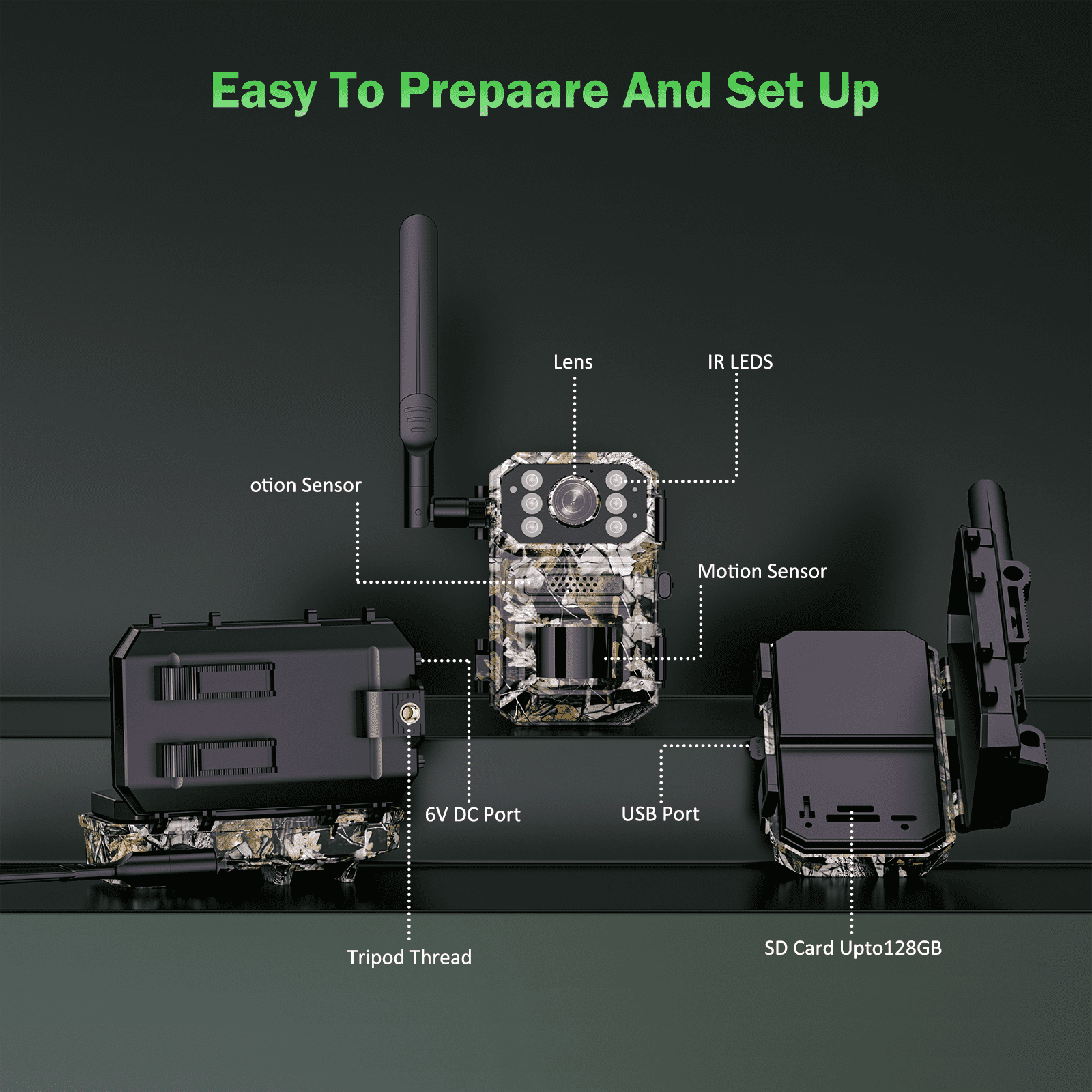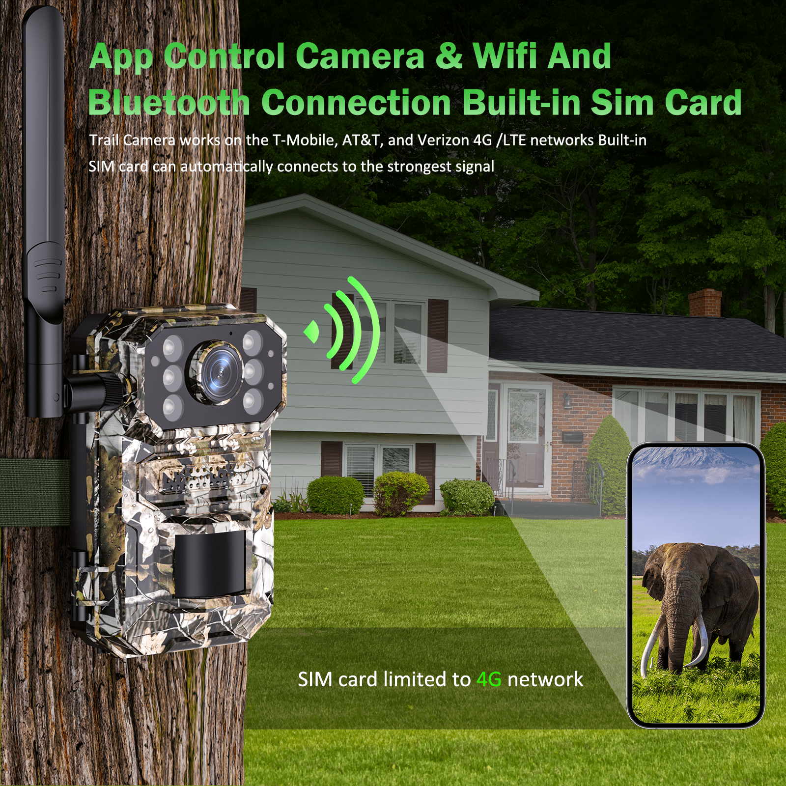2024 Newest Upgraded Dual Lens 4G LTE cellular Trail Cameras which Built-in SlM Card , provide you 2 perfect view with No blind spots! 4G Cellular Trail Camera with Dual Lens 1.Camera Built in 4G SlM card(can’t be changed)e 2.SlM card comes with 300M of free data Powered by solar panels The hunting camera has a 12-month standby time, can be charged by USB or solar powered, has a built-in battery and has a long battery life. WIFI Connection & APP Control You can connect your mobile phone to your hunting camera to observe things,with 4K Ultra HD Vedio&48MP Dual Lens Security Camera Built-in SIM Card With 300M sim card(Valid within one month of activation) 32GB sD card(supports up to 128GB) Cloud storage Offers a free trial for 30 days 0.5s Trigger&Night Vision&IP66 Waterproof The trail camera is waterproof and is not afraid of cold, hot, windy or rainy weather. When tracking things, the fastest time to start shooting is 0.05 seconds, lightning speed! Packaging: a hunting camera, a solar panel, a 4G SIM card, a 32GB memory card, USB cable