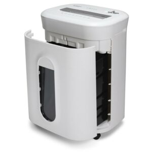Micro-Cut with 10 sheet capacities; destroys credit cards and small paper clips, Shreds paper and credit cards into small pieces (3/32 by 15/32 inches_2 x 12mm), security level P-5, Ultimate protection with particles 10 times smaller than standard cross-cut. Approximately 2592 particles per letter size paper, Nonstop 60-minute continuous run time; Anti-jam Auto-reverse to clear paper jams. Ultra-quiet operation, 6-gallon pullout bin with LED indicator lights Standby/ Overheat/ Bin-full/ Overload/ Door open status,