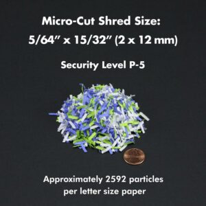 – Micro-cut turns paper into tiny confetti-like pieces measuring 5/64 by 15/32 inches (2 by 12 mm); meets high security level P-5 standards; shreds 10X smaller than standard cross-cut shredders