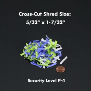 – Shreds paper, CDs, DVDs, credit cards into small pieces (5/32 by 1-7/32 inches), security level P-4