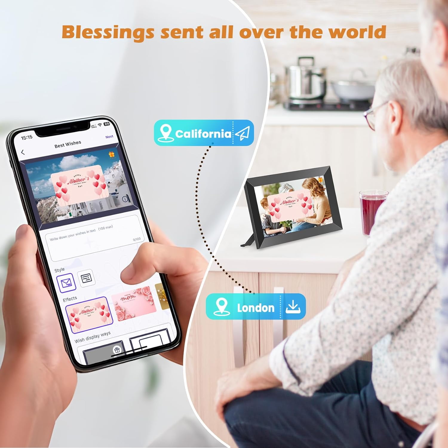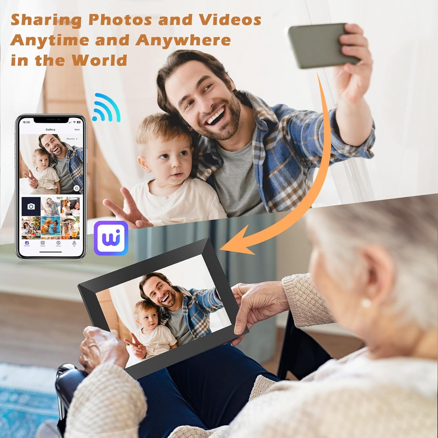 【Sharing Photos/Videos Instantly via Fr-ee “Frameo” APP With Family & Lover】Capture every moment and instantly share it with your family/lover. With a digital picture frame connected to Wi-Fi, free download the “Frameo” app which is available for both Android and iOS mobile phones, then you can send photos or videos to the digital frame from anywhere in the world. 【10.1 Inch IPS Touch Screen】The 10.1” WiFi digital picture frame is featured with a high-quality 1280*800 Resolution IPS touch screen which allows you to get a wonderful picture visual from any angle. Superior Color Fidelity perfectly preserves the vividness and cuteness of each of your photos. 【Absolute Privacy and Security】Frameo is a professional photo management application with absolute privacy and security. Except for the users you have added, no one can access your digital photo frame, so you don’t have to worry about any photo leakage. 【Videos with Sound Make Memory Come to Life Vividly】This is more than just a traditional photo display frame; it also features video playback by inserting an SD card or importing videos through the SD card. Additionally, you can upload videos to the digital frame via the Frameo app on your mobile phone. 【Impressive Functions】①Auto rotate photos, You can switch between horizontal and vertical versions at will, and you can also hang frames on the wall for decoration. ②Display caption. Every photo has its story and you can record the story of the photo, it will be displayed in the lower-left corner of the frame. ③Multi-functional custom settings.