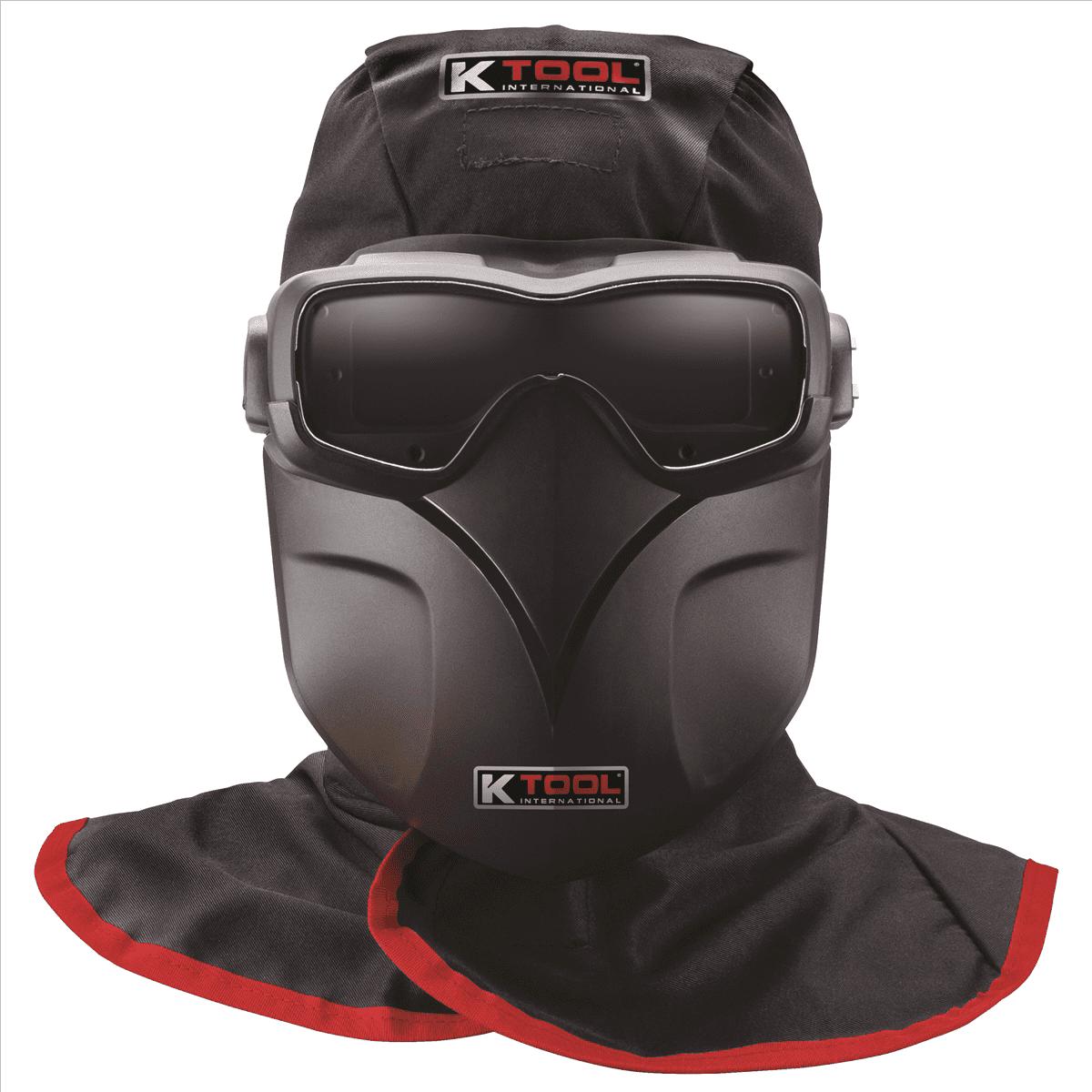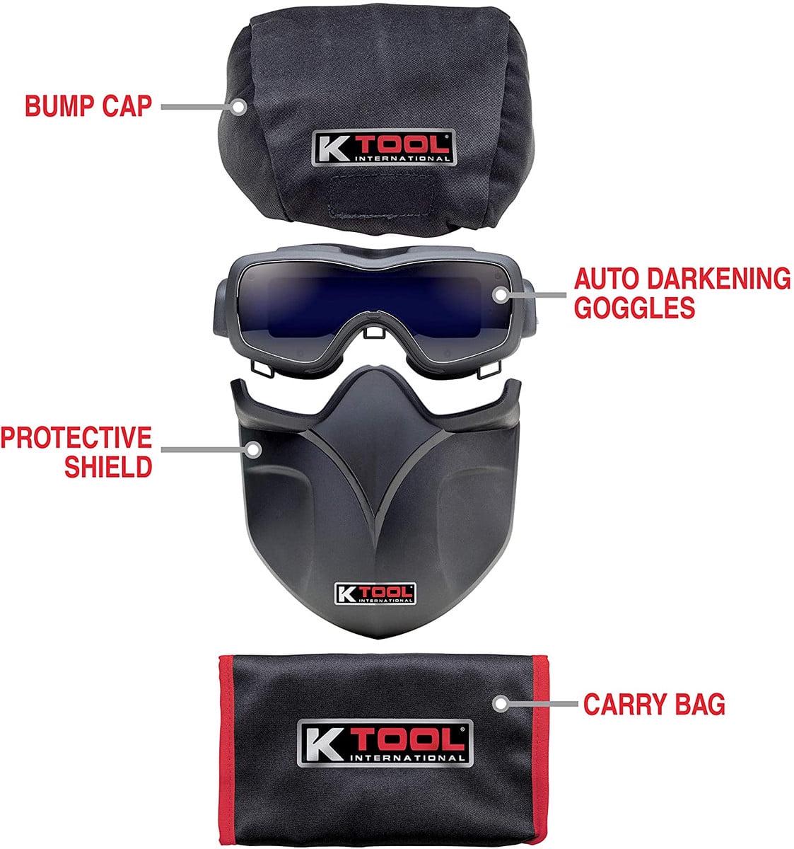The K Tools InternationalAuto-Darkening Welding Mask Kit is a high-tech product manufactured withspectral filtering technology, photoelectric sensors and control unittechnology. The photoelectric sensors makes liquid crystal change from brightto dark state as soon as it receives arclight. It also changes from dark tobright state when welding is finished to protect the eyes of users fromarclight, splash and harmful radiations of IR/UV lighting.