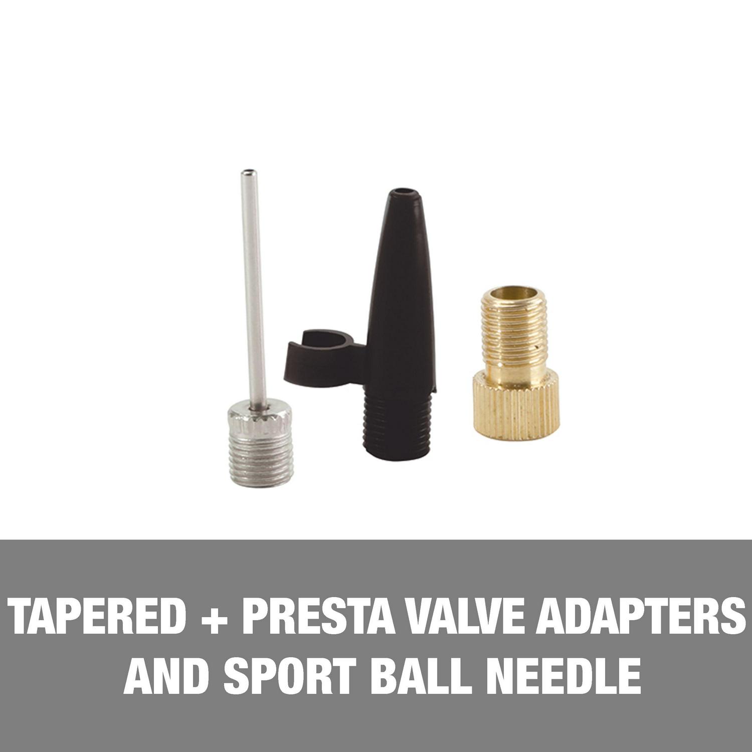 - Includes Tapered adapter, Sport ball needle, Presta Valve adapter, & Case