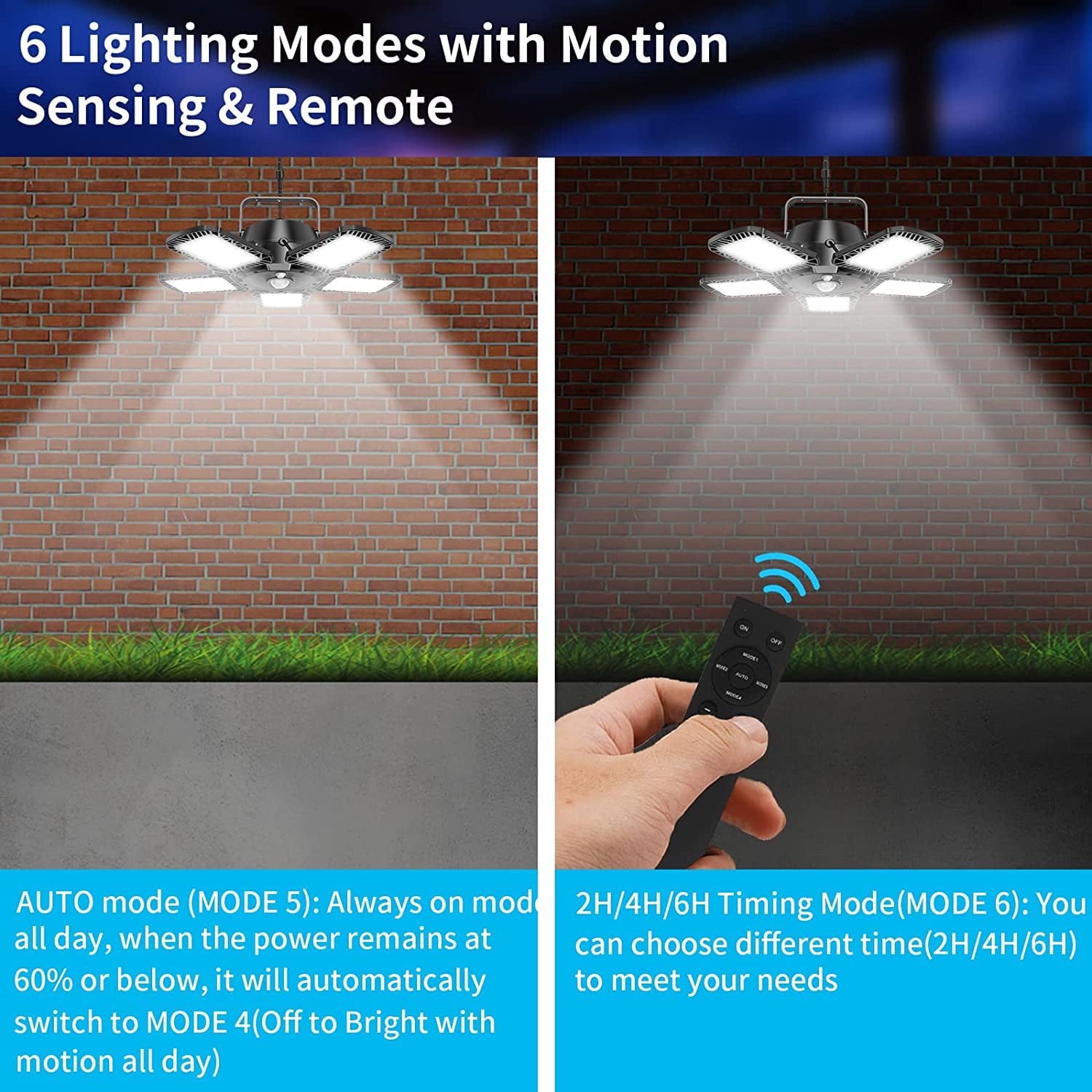 【6 Lighting Modes + Motion Sensing Function】This solar shed light has 6 lighting modes: MODE 1: Dim to Bright with motion at night. MODE 2: Off to Bright with motion at night. MODE 3: Constant ON at night. MODE 4: Off to Bright with motion in the Daytime. MODE 5(AUTO Mode): Always on mode all day, when the power remains at 60% or below, it will automatically switch to MODE 4(Off to Bright with motion all day). MODE 6(2H/4H/6H): You can choose a different time(2H/4H/6H) to meet your needs. 【2 Modes for Daytime Use】MODE 4: Off + Motion Sensor High Light, AUTO Mode: Always on mode all day, when the power is left 60%, it will automatically switch to MODE 4. There is no need to cover the solar panels or unplug the wires to make the solar powered shed light work during the daytime. Note: If the solar light has been connected to the solar panel, Mode 1/2/3/Timing Mode(2H/4H/6H) will only work when the solar panel is covered or in darkness (at night), MODE 4 & AUTO Mode for Daytime use. 【Power Indicator & Split Design】The solar powered shed light has added a power indicator light, you can directly see the power of the solar light, and make your life easier. The solar light and solar panel are separated, and the waterproof wire length is 5 meters/16.5 feet, so this solar light can be used indoors and outdoors, such as shed, chicken coop, gazebo, balcony, garage, barn, loft, home, backyard, basement, garden, yard, pathway, deck, tent, van, camp, tools room, storage room, etc. 【Mode Switch Button & Remote Control】Solar indoor lights with a remote and MODE switch button. You can choose different modes through the MODE switch button on solar light. And you can turn on/off the light and select different modes by remote control, and press “+/-” button to change the brightness. The five head led panel can be adjusted 120° to direct the light exactly where it’s needed. Built-in 160 white LEDs, it is designed to provide ultra-high brightness illumination for a wide area. 【IP65 Waterproof & Easy to Install】This solar barn lights indoor with remote. IP65 waterproof and ABS material can withstand rain and other extreme weather conditions. This solar garage lights indoor can be mounted directly on the wall with screws or hang the solar light anywhere light needed, just insure the solar panel to face the sunlight. The waterproof cord is 16.5ft long which is sufficient to route pretty much anywhere. (Including instruction, screws and screw sleeves.)