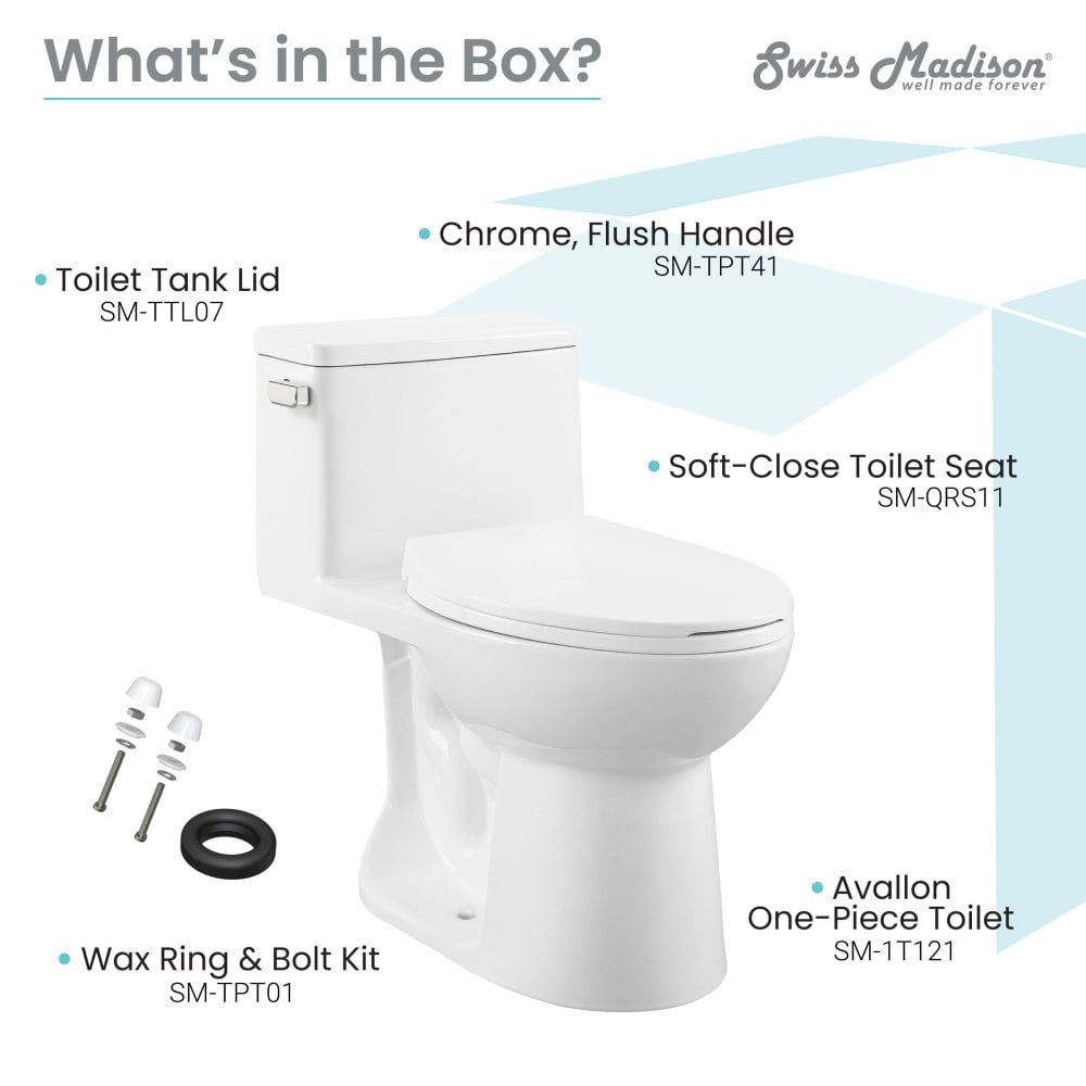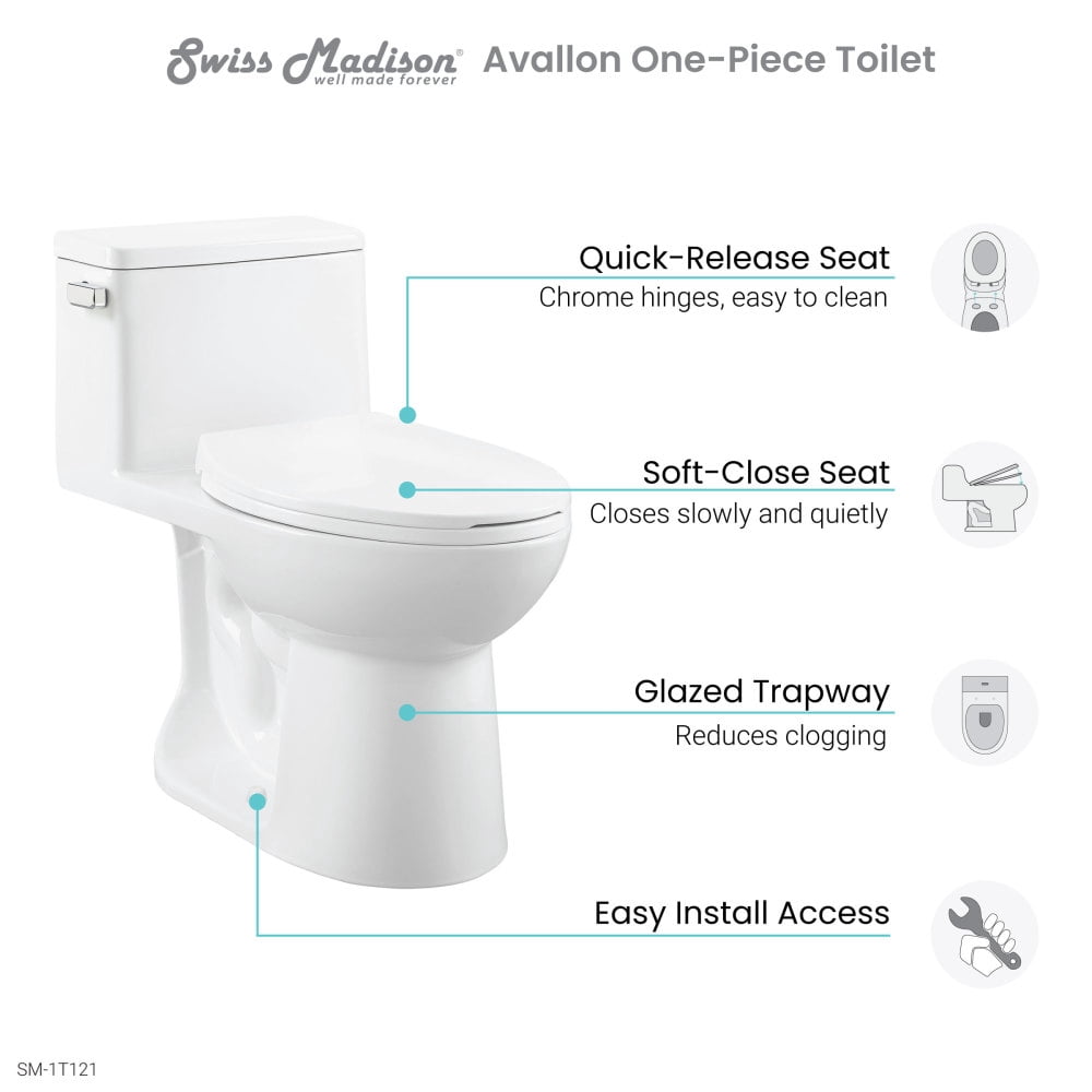 Single Flush: Single Flush 1.28 GPF Rough-In: Standard 12″ Rough-In Standard Elongated Bowl: The elongated bowl provides extra room and comfort. Between 17-19 inches, the comfort height toilet makes standing and sitting easier, especially for taller individuals. Many are ADA-compliant. Durable Non-Porous Scratch Resistant Ceramic: Developed from ceramic, that is scratch-resistant and non-porous, providing a durable and reliable option that can withstand routine use. Fully Glazed Trapway: The glazed trapway prevents clogs and keeps water flowing freely. Soft Close and Quick Release Seat: Provides a silent and gentle closing mechanism for added convenience and safety. With just the push of a button, the seat detaches completely for a thorough cleaning. Collection: Part of the Avallon Collection, explore additional products in this collection to complete the room.